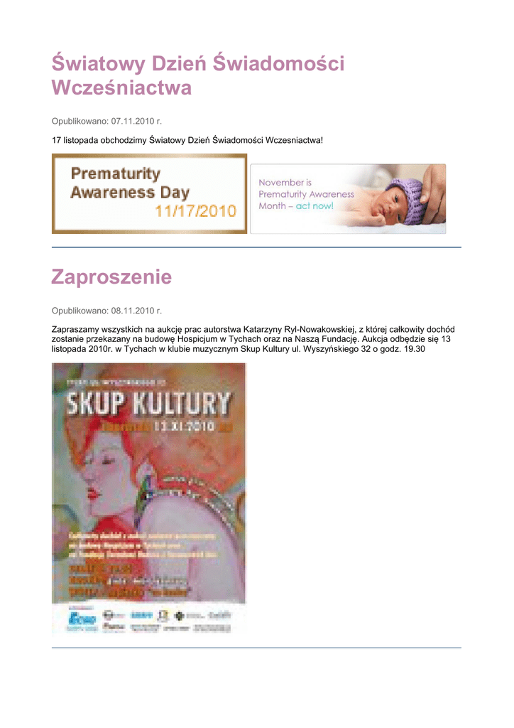 Światowy Dzień Świadomości Wcześniactwa Opublikowano: 07.11.2010 r. 17 listopada obchodzimy Światowy Dzień Świadomości Wczesniactwa! Zaproszenie Opublikowano: 08.11.2010 r. Zapraszamy wszystkich na aukcję prac autorstwa Katarzyny Ryl-Nowakowskiej, z której całkowity dochód zostanie przekazany na budowę Hospicjum w Tychach oraz na Naszą Fundację. Aukcja odbędzie się 13 listopada 2010r. w Tychach w klubie muzycznym Skup Kultury ul. Wyszyńskiego 32 o godz. 19.30 O nas w prasie Opublikowano: 13.10.2010 r. Oficjalne otwarcie naszej siedziby oraz nasze działania i plany na przyszłość opisał lokalny tygodnik "Gwarek"(Nr 41 z 12.10.2010) O naszej Fundacji w Dzienniku Zachodnim (Nr 242 z 15.10.2010) Nasza siedziba Opublikowano: 28.06.2010 r. Nasza siedziba mieści się w Tarnowskich Górach przy ul. Wyspiańskiego 17. Zapraszamy wszystkich rodziców, a w szczególności rodziców wcześniaków i bliźniąt. W siedzibie Fundacji mozna skorzystać z: - grup wsparcia dla rodziców wcześniaków i wieloraczków - pomocy psychologa, pedagoga i logopedy - szkoleń dla rodziców - programu wymiany doświadczeń - bazy informacji Ponadto oferujemy: - diagnozę i terapię zaburzeń Integracji Sensorycznej (SI) - rehabilitację metodą NDT Bobath Godziny otwarcia: wtorek: 16-18 czwartek: 16-18 sobota: 10-15 Oficjalne otwarcie naszej siedziby Opublikowano: 12.10.2010 r. 1. października 2010 siedziba naszej Fundacji została oficjalnie otwarta. Zaproszeni goście mogli oprócz miejsca spotkań rodziców zobaczyć salę rehabilitacyjną oraz prezentację multimedialna, która przedstawiała początki naszej działalności, nasze dotychczasowe osiągnięcia jak równiez nasze plany na przyszłość. Założyciele Fundacji: Agnieszka Hadera Rafał Hadera Rafael Krollik Sala do terapii zaburzeń Integracji Sensorycznej Informacja o naszym otwarciu na stronie Urzędu Miasta Tarnowskie Góry Info – linkownik dla Niepełnosprawnych Opublikowano: 06.09.2010 r. Strona, której celem jest ułatwienie osobom niepełnosprawnym odnalezienia się w świecie ludzi pełnosprawnych. Znajdziecie tutaj linki do stron instytucji utworzonych między innymi po to, aby pomagały niepełnosprawnym. http://www.infolinownikdlaon.com.pl Nowe możliwości nebulizacji* (inhalacji) niemowląt i małych dzieci. Opublikowano: 29.06.2010 r. Najnowszym osiągnięciem ostatnich lat jest skonstruowanie przez amerykańskich i izraelskich naukowców nebulizatora BabyAir specjalnie zaprojektowanego dla niemowląt i małych dzieci. Opracowali oni, unikalny na skalę światową, nebulizator pozwalający wykonywać nebulizacje bez stosowania maseczki, w pozycji leżącej a więc przede wszystkim w czasie snu. Przystosowany do nebulizacji w inkubatorach, co w znacznym stopniu ułatwia i odciąża pracę personelu w szpitalach. Co daje to najnowsze rozwiązanie, czym różni się od tych stosowanych od dziesiątek lat nebulizatorów z maseczkami? W ciągu ostatnich lat liczba leków wziewnych dostępnych na polskim rynku farmaceutycznym uległa znacznemu zwiększeniu. Wynika to niewątpliwie z faktu ogromnego postępu jaki dokonał się w zakresie możliwości ich depozycji. Należy zdawać sobie sprawę, że bezpieczeństwo i skuteczność terapii inhalacyjnej zależy nie tylko od właściwie dobranego leku ale w dużej mierze od aparatury i poprawnego stosowania danego urządzenia. W przypadku leczenia dzieci metodami wziewnymi należy uwzględnić typowe dla dziecka odrębności anatomiczno-fizjologiczne układu oddechowego jak krótsze i węższe drogi oddechowe oraz różnice w parametrach wentylacyjnych (zwłaszcza u niemowląt). U dzieci do 5 r.ż. nebulizacja jest metodą podawania leków z wyboru. Nebulizacja (szczególnie u małych dzieci) jest jedyną techniką podawania leku wziewnego umożliwiającą wraz z wprowadzeniem odpowiedniej (bardzo dowolnej) jednorazowej dawki leku równoczesne nawilżenie drzewa oskrzelowego a nawet natlenienie chorego. Największą dotychczas niedogodnością nebulizacji niemowląt i małych dzieci była powszechna zła tolerancja maseczki. Od 60-75% dzieci reaguje płaczem w momencie założenia maski, co skutkuje zaburzeniami toru oddechowego, jego częstości, braku regularności a tym samym wpływa na słabą depozycję leku. Jednym ze skutków stosowania maski u dzieci jest również dość duże działanie leków na oczy (sterydy, antybiotyki). Jednak nebulizacja jest techniką, w której poziom depozycji może ulec zmianie, w zależności od sposobu przeprowadzenia nebulizacji. Depozycję u niemowląt i dzieci można osiągnąć nawet na poziomie 50% a czynnikami poprawiającymi depozycję są: 1. stosowanie nowoczesnych urządzeń – nebulizatorów (np. dostępny na polskim rynku BabyAir) 2. wydłużenie czasu nebulizacji 3. rozcieńczenie podawanego leku Najnowszym osiągnięciem ostatnich lat jest skonstruowanie przez amerykańskich i izraelskich naukowców nebulizatora BabyAir specjalnie zaprojektowanego dla niemowląt i małych dzieci. Opracowali oni, unikalny na skalę światową, nebulizator pozwalający wykonywać nebulizacje bez stosowania maseczki, w pozycji leżącej a więc przede wszystkim w czasie snu. Przystosowany do nebulizacji w inkubatorach, co w znacznym stopniu ułatwia i odciąża pracę personelu w szpitalach. Co daje to najnowsze rozwiązanie, czym różni się od tych stosowanych od dziesiątek lat nebulizatorów z maseczkami? 1. namiotowy nebulizator BabyAir z bezdotykową konstrukcją – zdecydowanie ułatwia sterylizację, zmniejsza koszty – brak konieczności każdorazowej wymiany maseczki na oddziałach szpitalnych 2. możliwość podawania dziecku tlenu w sposób ciągły 3. pozycja dziecka leżąca – odwrócona konstrukcja nebulizatora całkowicie zabezpiecza przed wylewaniem się leku 4. podawanie aerozolu/leku podczas snu 5. zdecydowane ograniczenie depozycji leków na oczy 6. konstrukcja przyjazna dziecku, całkowicie bezstresowa – br