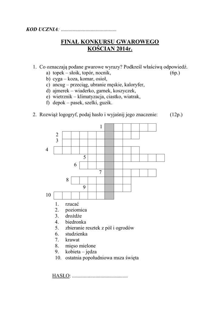 KOD UCZNIA: ........................................... FINAŁ KONKURSU GWAROWEGO KOŚCIAN 2014r. 1. Co oznaczają podane gwarowe wyrazy? Podkreśl właściwą odpowiedź. a) topek – słoik, topór, nocnik, (6p.) b) cyga – koza, komar, osioł, c) ancug – przeciąg, ubranie męskie, kaloryfer, d) ajmerek – wiaderko, garnek, koszyczek, e) wietrznik – klimatyzacja, ciastko, wiatrak, f) depok – pasek, szelki, guzik. 2. Rozwiąż logogryf, podaj hasło i wyjaśnij jego znaczenie: 1 2 3 4 5 6 7 8 9 10 1. 2. 3. 4. 5. 6. 7. 8. 9. 10. rzucać poziomica drożdże biedronka zbieranie resztek z pól i ogrodów studzienka krawat mięso mielone kobieta – jędza ostatnia popołudniowa msza święta HASŁO: ........................................... (12p.) 3. Do podanych słów dopisz określenia gwarowe: (9p.) narożnik – …………………………………………………………………. błoto – ……………………………………………………………………... kamizelka – ……………………………………………………………... grządka – ………………………………………………………………….. uczeń – ………………………………………………………………….. piekarnik – ………………………………………………………………… ćma – ……………………………………………………………………… pociąg – …………………………………………………………………… szczotka do szorowania – ………………………………………………… 4. Wyjaśnij, co oznaczają następujące określenia gwarowe: (8p.) mieć fifa – ………………………………………………………………… mieć glut w spodniach – ………………………………………………….. tkło coś kogoś – …………………………………………………………… same pory chodzą – ……………………………………………………….. mielić papą – ……………………………………………………………… dostać wilka – ……………………………………………………………... wyćpić kogo z urzędu – …………………………………………………… na cycuś – …………………………………………………………………. 5. Wyjaśnij znaczenie wyrazów gwarowych: aprykoza – …………………………. szpycowanie – ……………………... psujmajster –………………………... wyżki – ……………………………... hyczka – ……………………………. ściepka – …………………………… klamot – ……………………………. glanc – ……………………………… fefermyncka – ……………………… chęchy – …………………………… zaś – ………………………………... wiukać – …………………………… kramować się – ……………………. (25p.) ćpnąć – ……………………………. dudlać – …………………………… fachura – ………………………….. nośpłat – ………………………….. opitolić – ………………………….. kopystka – ………………………… gnocić – …………………………… hulajgira – ………………………… świecidło – ………………………… dyrdun – ………………...………… półrzytek – ………………...……... łuzganina – ………………..………