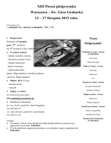 XIII Piesza pielgrzymka Warszawa – Św. Góra Grabarka 13 – 17 Sierpnia 2015 roku. Motto pielgrzymki: „…pokajajcie się i wierzcie w Ewangelię.” (Mk. 1, 15) Rozpoczęcie: Wołomin: 13 sierpień, godz. 745 – Moleben Trasa Pielgrzymki: ok. 830 wymarsz w kier. Stanisławowa Co należy zabrać: - kubek, menażka, sztućce, - Konserwy postne (4 szt.) - bandaż elastyczny - śpiwór, karimata Wołomin (1 dzień - 30 km) (13-08-2015) Poświętne Wólka Piecząca Dobre (2 dzień - 27 km) - odpowiedni ubiór Pniewnik (panie: długa spódnica, chustka na głowę, Roguszyn panowie: długie spodnie) Opłata 40 zł, w tym: Liw Węgrów (3 dzień - 26 km) - ubezpieczenie - znaczek Zapisy w cerkwi (w swiecznom jaszczyku) lub [email protected] Dodatkowe informacje: Ks. Jerzy Kulik z parafii Św. Marii Magdaleny Grochów Szlachecki Sokołów Podlaski Repki (4 dzień - 19 km) Skrzeszew Wólka Zamkowa Drohiczyn (5 dzień - 28 km) Tel. 600 309 477 Ks. Adam Misijuk z parafii Św. Jana Klimaka Tel. 500 273 762 Uwaga! Uczestnicy, którzy chcą zakupić koszulkę pielgrzymkową, proszeni są o zgłoszenie się do dnia 2-08-2015. W celu ułatwienia organizacji prosimy o wcześniejsze zapisy, najpóźniej do 9-08-2015. Słochy Annopolskie Siemiatycze Stacja Święta Góra Grabarka (17-08-2015)