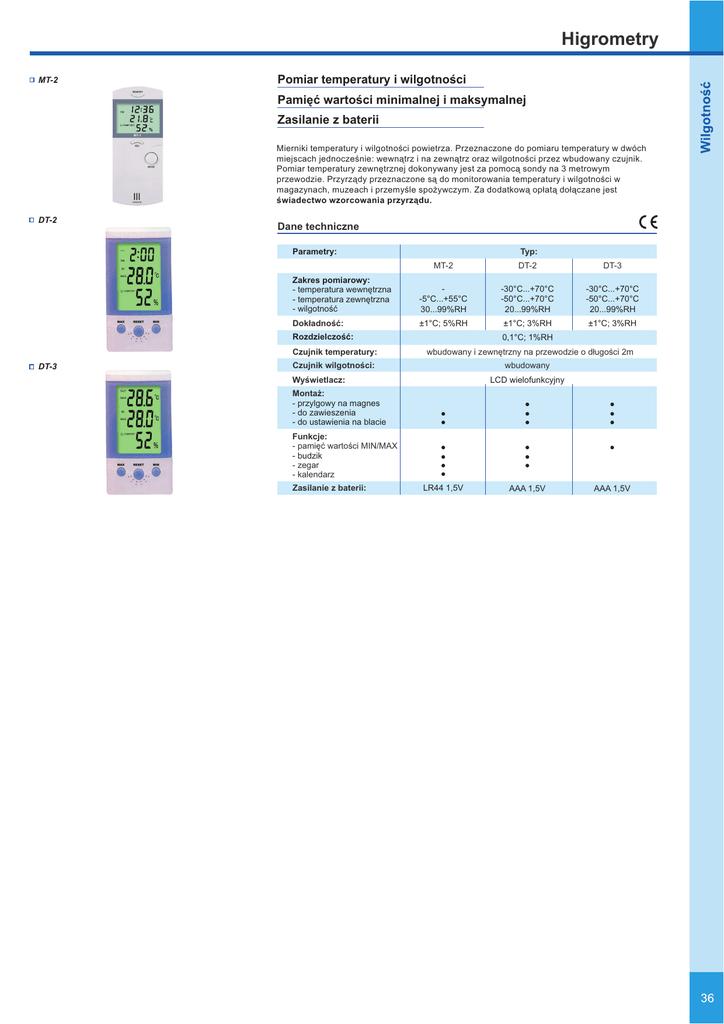 Higrometry MT-2 Pomiar temperatury i wilgotnoœci Pamiêæ wartoœci minimalnej i maksymalnej Zasilanie z baterii Mierniki temperatury i wilgotnoœci powietrza. Przeznaczone do pomiaru temperatury w dwóch miejscach jednoczeœnie: wewn¹trz i na zewn¹trz oraz wilgotnoœci przez wbudowany czujnik. Pomiar temperatury zewnêtrznej dokonywany jest za pomoc¹ sondy na 3 metrowym przewodzie. Przyrz¹dy przeznaczone s¹ do monitorowania temperatury i wilgotnoœci w magazynach, muzeach i przemyœle spo¿ywczym. Za dodatkow¹ op³at¹ do³¹czane jest œwiadectwo wzorcowania przyrz¹du. DT-2 Dane techniczne Typ: Parametry: MT-2 DT-2 DT-3 Zakres pomiarowy: - temperatura wewnêtrzna - temperatura zewnêtrzna - wilgotnoœæ -5°C...+55°C 30...99%RH -30°C...+70°C -50°C...+70°C 20...99%RH -30°C...+70°C -50°C...+70°C 20...99%RH Dok³adnoœæ: ±1°C; 5%RH ±1°C; 3%RH ±1°C; 3%RH Rozdzielczoœæ: Czujnik temperatury: DT-3 0,1°C; 1%RH wbudowany i zewnêtrzny na przewodzie o d³ugoœci 2m wbudowany Czujnik wilgotnoœci: LCD wielofunkcyjny Wyœwietlacz: Monta¿: - przylgowy na magnes - do zawieszenia - do ustawienia na blacie Funkcje: - pamiêæ wartoœci MIN/MAX - budzik - zegar - kalendarz Zasilanie z baterii: LR44 1,5V AAA 1,5V AAA 1,5V