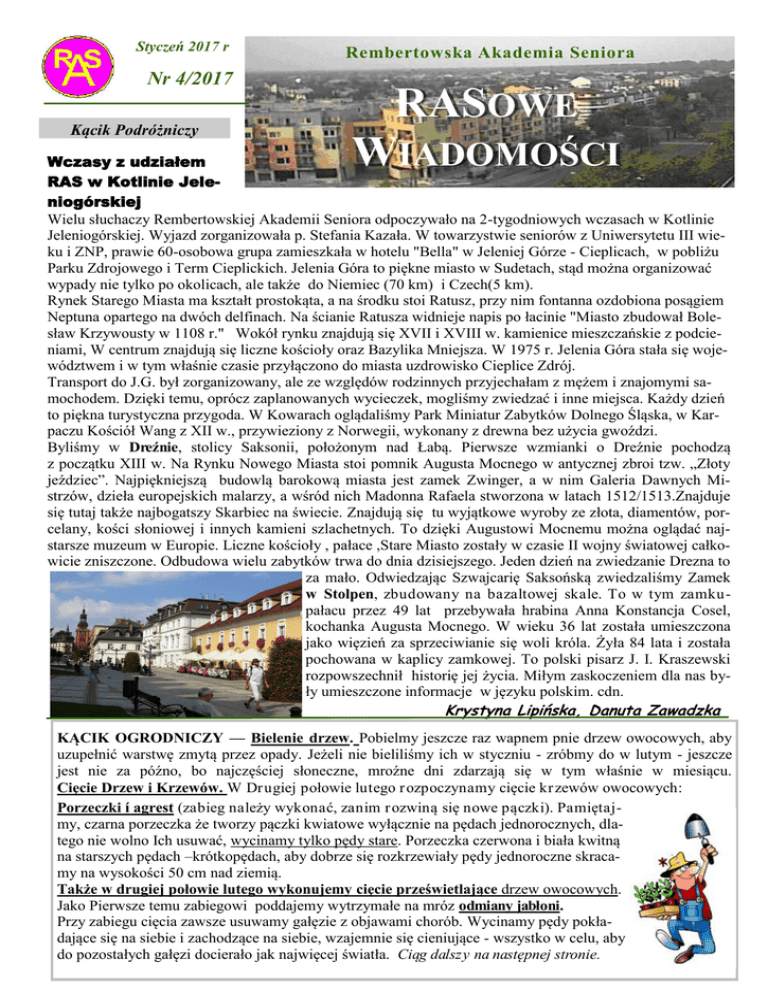 Styczeń 2017 r Nr 4/2017 Kącik Podróżniczy Rembertowska Akademia Seniora RASOWE WIADOMOŚCI Wczasy z udziałem RAS w Kotlinie Jeleniogórskiej Wielu słuchaczy Rembertowskiej Akademii Seniora odpoczywało na 2-tygodniowych wczasach w Kotlinie Jeleniogórskiej. Wyjazd zorganizowała p. Stefania Kazała. W towarzystwie seniorów z Uniwersytetu III wieku i ZNP, prawie 60-osobowa grupa zamieszkała w hotelu "Bella" w Jeleniej Górze - Cieplicach, w pobliżu Parku Zdrojowego i Term Cieplickich. Jelenia Góra to piękne miasto w Sudetach, stąd można organizować wypady nie tylko po okolicach, ale także do Niemiec (70 km) i Czech(5 km). Rynek Starego Miasta ma kształt prostokąta, a na środku stoi Ratusz, przy nim fontanna ozdobiona posągiem Neptuna opartego na dwóch delfinach. Na ścianie Ratusza widnieje napis po łacinie "Miasto zbudował Bolesław Krzywousty w 1108 r." Wokół rynku znajdują się XVII i XVIII w. kamienice mieszczańskie z podcieniami, W centrum znajdują się liczne kościoły oraz Bazylika Mniejsza. W 1975 r. Jelenia Góra stała się województwem i w tym właśnie czasie przyłączono do miasta uzdrowisko Cieplice Zdrój. Transport do J.G. był zorganizowany, ale ze względów rodzinnych przyjechałam z mężem i znajomymi samochodem. Dzięki temu, oprócz zaplanowanych wycieczek, mogliśmy zwiedzać i inne miejsca. Każdy dzień to piękna turystyczna przygoda. W Kowarach oglądaliśmy Park Miniatur Zabytków Dolnego Śląska, w Karpaczu Kościół Wang z XII w., przywieziony z Norwegii, wykonany z drewna bez użycia gwoździ. Byliśmy w Dreźnie, stolicy Saksonii, położonym nad Łabą. Pierwsze wzmianki o Dreźnie pochodzą z początku XIII w. Na Rynku Nowego Miasta stoi pomnik Augusta Mocnego w antycznej zbroi tzw. „Złoty jeździec”. Najpiękniejszą budowlą barokową miasta jest zamek Zwinger, a w nim Galeria Dawnych Mistrzów, dzieła europejskich malarzy, a wśród nich Madonna Rafaela stworzona w latach 1512/1513.Znajduje się tutaj także najbogatszy Skarbiec na świecie. Znajdują się tu wyjątkowe wyroby ze złota, diamentów, porcelany, kości słoniowej i innych kamieni szlachetnych. To dzięki Augustowi Mocnemu można oglądać najstarsze muzeum w Europie. Liczne kościoły , pałace ,Stare Miasto zostały w czasie II wojny światowej całkowicie zniszczone. Odbudowa wielu zabytków trwa do dnia dzisiejszego. Jeden dzień na zwiedzanie Drezna to za mało. Odwiedzając Szwajcarię Saksońską zwiedzaliśmy Zamek w Stolpen, zbudowany na bazaltowej skale. To w tym zamkupałacu przez 49 lat przebywała hrabina Anna Konstancja Cosel, kochanka Augusta Mocnego. W wieku 36 lat została umieszczona jako więzień za sprzeciwianie się woli króla. Żyła 84 lata i została pochowana w kaplicy zamkowej. To polski pisarz J. I. Kraszewski rozpowszechnił historię jej życia. Miłym zaskoczeniem dla nas były umieszczone informacje w języku polskim. cdn. Krystyna Lipińska, Danuta Zawadzka KĄCIK OGRODNICZY — Bielenie drzew. Pobielmy jeszcze raz wapnem pnie drzew owocowych, aby uzupełnić warstwę zmytą przez opady. Jeżeli nie bieliliśmy ich w styczniu - zróbmy do w lutym - jeszcze jest nie za późno, bo najczęściej słoneczne, mroźne dni zdarzają się w tym właśnie w miesiącu. Cięcie Drzew i Krzewów. W Dr ugiej połowie lutego r ozpoczynamy cięcie kr zewów owocowych: Porzeczki í agrest (zabieg należy wykonać, zanim r ozwiną się nowe pączki). Pamiętajmy, czarna porzeczka że tworzy pączki kwiatowe wyłącznie na pędach jednorocznych, dlatego nie wolno Ich usuwać, wycinamy tylko pędy stare. Porzeczka czerwona i biała kwitną na starszych pędach –krótkopędach, aby dobrze się rozkrzewiały pędy jednoroczne skracamy na wysokości 50 cm nad ziemią. Także w drugiej połowie lutego wykonujemy cięcie prześwietlające drzew owocowych. Jako Pierwsze temu zabiegowi poddajemy wytrzymałe na mróz odmiany jabłoni. Przy zabiegu cięcia zawsze usuwamy gałęzie z objawami chorób. Wycinamy pędy pokładające się na siebie i zachodzące na siebie, wzajemnie się cieniujące - wszystko w celu, aby do pozostałych gałęzi docierało jak najwięcej światła. Ciąg dalszy na następnej stronie. Rembertowska Akademia Seniora KOLEGIUM REDAKCYJNE: uczestnicy zajęć Klubu Komputerowego RAS kontakt: Sławomir Lipiński [email protected] www.ras.edu.pl Ale śmieszne Ludzie zwracają uwagę na Twój wygląd, czy jesteś inteligentny, dowcipny, z kim się zadajesz, czy palisz, czy pijesz. A komar lubi Cię takiego, jakim Jesteś! Kącik Pszczelarski Miód rzepakowy jest w stanie płynnym prawie bezbarwny lub ma barwę lekko słomkową i słaby zapach kwiatów rzepaku. Bardzo szybko krystalizuje, drobne kryształki mają smalcowatą konsystencję oraz białą lub kremową barwę. Dobrze rozpuszcza się w wodzie. Pomocny w leczeniu wątroby, trzustki, nerek, układu pokarmowego, wrzodów żołądka i dwunastnicy. Polecany jest przy leczeniu schorzeń układu krążenia, niewydolności mięśnia sercowego, dusznicy sercowej i miażdżycy. Obniża ciśnienie tętnicze krwi i wyrównuje niedobory potasu w organizmie. Skuteczny także przy przeziębieniach i stanach zapalnych dróg oddechowych. Przyspiesza gojenie ran. W przypadku oparzeń zapobiega tworzeniu się pęcherzy. Miód spadziowy wytwarzają pszczoły z zebranej z drzew i roślin rolniczych wydzieliny produkowanej przez mszyce i czerwce. W sprzedaży spotykamy najczęściej miody ze spadzi iglastej i ze spadzi liściastej. Różnią się barwą, konsystencją, smakiem, aromatem i szybkością krystalizacji. Są to miody gęstsze od nektarowych i zawierają więcej związków mineralnych, szczególnie potasu, fosforu, chloru, siarki, wapnia, magnezu i żelaza. Charakteryzuje je wysoka aktywność antybiotyczna i bakteriobójcza. Działają antyseptycznie, przeciwzapalnie i wykrztuśnie, wspomagają system odpornościowy człowieka. Polecane są w schorzeniach dróg oddechowy