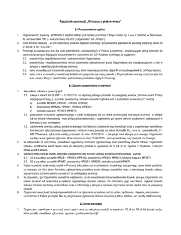 Regulamin promocji „W trosce o piękne włosy” §1 Postanowienia ogólne 1. 2. 3. Organizatorem promocji „W trosce o piękne włosy” jest Spółka pod firmą: Philips Polska Sp. z o.o. z siedzibą w Warszawie, Al. Jerozolimskie 195 B, kod pocztowy: 02-222 („Organizator” lub „Philips”). Czas trwania promocji – w tym dystrybucji towarów objętych promocją i przyjmowania zgłoszeń do promocji obejmuje okres od 01.02.2011 do 15.03.2011. Promocja przeznaczona jest dla osób pełnoletnich, zamieszkałych w Polsce (uczestnicy), posiadających pełną zdolność do czynności prawnych, będących konsumentami w rozumieniu art. 221 Kodeksu cywilnego za wyjątkiem: 3.1. pracowników, współpracowników i pełnomocników Organizatora, 3.2. pracowników i współpracowników innych podmiotów zatrudnionych przez Organizatora lub współpracujących z nim w związku z organizacją lub obsługą promocji, 3.3. osób prowadzących działalność gospodarczą, które nabywają produkty objęte Promocją bezpośrednio od Organizatora, 3.4. osób, które w ramach prowadzonej działalności gospodarczej mają zawarte z Organizatorem umowy dystrybucyjne lub inne umowy, których przedmiotem jest dostawa produktów objętych Promocją. §2 Zasady uczestnictwa w promocji 1. 2. 3. 4. 5. 6. Warunkiem udziału w promocji jest: 1.1. zakup w dniach 01.02.2011 – 15.03.2011r. co najmniej jednego produktu do pielęgnacji włosów (haircare) marki Philips objętego promocją, tj. suszarki, prostownicy, lokówko-suszarki High/mid-end o symbolach wymienionych poniżej: a) suszarki: HP4997, HP8251, HP8183, HP8182; b) prostownice: HP8290, HP8361, HP8342, HP8341; c) lokówko-suszarki: HP4674, HP4671; 1.2. pozyskanie formularza zgłoszeniowego z ulotki znajdującej się na ulotce promocyjnej dotyczącej promocji w sklepie lub na stronie internetowej www.philips.pl/zwrotpieniedzy i wypełnienie go swoimi danymi osobowymi, wskazanymi w formularzu jako wymagane; 1.3. zachowanie dowodu zakupu produktu (paragon lub faktura) i przesłanie jego kserokopii wraz z wypełnionym prawidłowo formularzem zgłoszeniowym (zgłoszenie), o którym mowa powyżej, na adres GonnaBe Sp. z o.o. ul. Łomiańska 6A, 01685 Warszawa; zgłoszenia należy przesyłać do dnia 15.03.2011r. – decyduje data stempla pocztowego. Organizator nie będzie uwzględniał zgłoszeń, które otrzyma po dniu 15.04.2011r. mimo prawidłowej daty stempla pocztowego. W odpowiedzi na otrzymany, prawidłowo wypełniony formularz zgłoszeniowy oraz prawidłowy dowód zakupu, Organizator prześle uczestnikowi zwrot części ceny za zakupiony produkt w wysokości 30 zł lub 50 zł, zgodnie z zasadami, o których mowa w pkt 3 poniżej. Wartość przesyłanego zwrotu pieniędzy uzależniona jest od ceny zakupu produktu promocyjnego i wynosi: 3.1. 30 zł za zakup suszarki HP8251, HP8183, HP8182, prostownicy HP8342, HP8341, lokówko-suszarki HP4671 3.2. 50 zł za zakup suszarki HP4997, prostownicy HP8361, HP8290, lokówko-suszarki HP4674 Każdy uczestnik może wziąć udział w Promocji tylko jeden raz w odniesieniu do jednego zakupionego przez siebie produktu, co oznacza, że tylko jeden formularz zgłoszeniowy przesłany przez danego uczestnika wraz z kserokopią dowodu zakupu tego produktu zostanie uznany za ważny i za podlegający promocji. W przypadku, gdy Organizator poweźmie wątpliwości, co do prawdziwości lub prawidłowości dowodu zakupu, Organizator ma prawo zażądać od uczestnika przesłania oryginalnego dowodu zakupu. Po dokonaniu jego weryfikacji, oryginał dowodu zakupu zostanie zwrócony uczestnikowi wraz z informacją o decyzji w sprawie przyznania zwrotu części ceny za zakupiony produkt. Organizator nie ponosi żadnej odpowiedzialności za zgłoszenia przesłane pod zły adres, opóźnione, niepełne, nieczytelne i uszkodzone w trakcie przesyłki. Nie są przyjmowane zgłoszenia złożone za pomocą faksu, telefonu lub poczty elektronicznej. §3 Zwrot pieniędzy 1. Organizator przewiduje w promocji zwrot części ceny za zakupiony produkt w wysokości 30 zł lub 50 zł dla każdej osoby, która prześle prawidłowe zgłoszenie, zgodnie z postanowieniami §2. 2. 3. 4. 5. Zwrot pieniędzy zostanie przekazany uczestnikom przelewem bankowym, na podany w formularze zgłoszeniowym nr rachunku bankowego, w terminie do 2 tygodni od daty otrzymania prawidłowego zgłoszenia, nie później jednak niż do dnia 13.05.2011r. Organizator nie przewiduje innego sposobu przekazania zwrotu pieniędzy uczestnikom promocji. Uczestnicy, których dane osobowe uległy zmianie po podaniu ich do wiadomości Organizatora, są zobowiązani powiadomić o ww. zmianie Organizatora oraz podać nowe dane osobowe najpóźniej na jeden tydzień przed upływem terminu zwrotu pieniędzy, pod rygorem pozbawienia prawa do otrzymania tego zwrotu. Zwrócona kwota, o której mowa w § 3 pkt 1 podlega zwolnieniu z opodatkowani podatkiem dochodowym od osób fizycznych zgodnie z obowiązującymi przepisami podatkowymi. Zwrot pieniędzy przepada w następujących sytuacjach: 6.1. przekazania przez uczestnika nieprawidłowego paragonu (nieprawidłowy produkt, nieprawidłowa data), a także podania w formularzu zgłoszeniowym błędnych lub niekompletnych danych, co uniemożliwi kontakt z uczestnikiem lub dokonanie zwrotu pieniędzy’ 6.2. przesłany dowód zakupu będzie nosił znamiona podrobienia lub uszkodzenia w sposób uniemożliwiający jego odczytanie; 6.3. przesłania ponownie kserokopii dowodu zakupu, na który dokonano już zwrotu pieniędzy; 6.4. niespełnienia §1 ust.3 regulaminu; 6.5. odmowy przyjęcia zwrotu pieniędzy; 6.6. podania nieprawidłowego lub niepodanie numeru rachunku bankowego; 6.7. zwrot zakupionego produktu (dla uniknięcia wątpliwości zaznacza się, że uczestnikowi przysługują wszelkie uprawnienia wynikające z przepisów prawa, związane z zawartą umową sprzedaży produktu, a niniejsza promocja w żaden sposób ich nie ogranicza). §