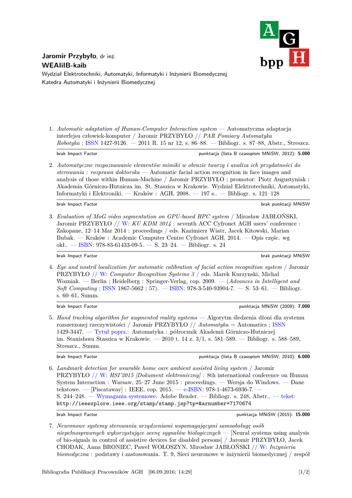 A G bpp H Jaromir Przybyło, dr inż. WEAIiIB-kaib Wydział Elektrotechniki, Automatyki, Informatyki i Inżynierii Biomedycznej Katedra Automatyki i Inżynierii Biomedycznej 1. Automatic adaptation of Human-Computer Interaction system — Automatyczna adaptacja interfejsu człowiek-komputer / Jaromir PRZYBYŁO // PAR Pomiary Automatyka Robotyka ; ISSN 1427-9126. — 2011 R. 15 nr 12, s. 86–88. — Bibliogr. s. 87–88, Abstr., Streszcz. brak Impact Factor punktacja (lista B czasopism MNiSW, 2012): 5.000 2. Automatyczne rozpoznawanie elementów mimiki w obrazie twarzy i analiza ich przydatności do sterowania : rozprawa doktorska — Automatic facial action recognition in face images and analysis of those within Human-Machine / Jaromir PRZYBYŁO ; promotor: Piotr Augustyniak ; Akademia Górniczo-Hutnicza im. St. Staszica w Krakowie. Wydział Elektrotechniki, Automatyki, Informatyki i Elektroniki. — Kraków : AGH, 2008. — 197 s.. — Bibliogr. s. 121–128 brak Impact Factor brak punktacji MNiSW 3. Evaluation of MoG video segmentation on GPU-based HPC system / Mirosław JABŁOŃSKI, Jaromir PRZYBYŁO // W: KU KDM 2014 : seventh ACC Cyfronet AGH users’ conference : Zakopane, 12–14 Mar 2014 : proceedings / eds. Kazimierz Wiatr, Jacek Kitowski, Marian Bubak. — Kraków : Academic Computer Centre Cyfronet AGH, 2014. — Opis częśc. wg okł.. — ISBN: 978-83-61433-09-5. — S. 23–24. — Bibliogr. s. 24 brak Impact Factor brak punktacji MNiSW 4. Eye and nostril localization for automatic calibration of facial action recognition system / Jaromir PRZYBYŁO // W: Computer Recognition Systems 3 / eds. Marek Kurzynski, Michał Wozniak. — Berlin ; Heidelberg : Springer-Verlag, cop. 2009. — (Advances in Intelligent and Soft Computing ; ISSN 1867-5662 ; 57). — ISBN: 978-3-540-93904-7. — S. 53–61. — Bibliogr. s. 60–61, Summ. brak Impact Factor punktacja MNiSW (2009): 7.000 5. Hand tracking algorithm for augmented reality systems — Algorytm śledzenia dłoni dla systemu rozszerzonej rzeczywistości / Jaromir PRZYBYŁO // Automatyka = Automatics ; ISSN 1429-3447. — Tytuł poprz.: Automatyka : półrocznik Akademii Górniczo-Hutniczej im. Stanisława Staszica w Krakowie. — 2010 t. 14 z. 3/1, s. 581–589. — Bibliogr. s. 588–589, Streszcz., Summ. brak Impact Factor punktacja (lista B czasopism MNiSW, 2010): 6.000 6. Landmark detection for wearable home care ambient assisted living system / Jaromir PRZYBYŁO // W: HSI’2015 [Dokument elektroniczny] : 8th international conference on Human System Interaction : Warsaw, 25–27 June 2015 : proceedings. — Wersja do Windows. — Dane tekstowe. — [Piscataway] : IEEE, cop. 2015. — e-ISBN: 978-1-4673-6936-7. — S. 244–248. — Wymagania systemowe: Adobe Reader. — Bibliogr. s. 248, Abstr.. — tekst: http://ieeexplore.ieee.org/stamp/stamp.jsp?tp=&arnumber=7170674 brak Impact Factor punktacja MNiSW (2015): 15.000 7. Neuronowe systemy sterowania urządzeniami wspomagającymi samoobsługę osób niepełnosprawnych wykorzystujące ocenę sygnałów biologicznych — [Neural systems using analysis of bio-signals in control of assistive devices for disabled persons] / Jaromir PRZYBYŁO, Jacek CHODAK, Anna BRONIEC, Paweł WOŁOSZYN, Mirosław JABŁOŃSKI // W: Inżynieria biomedyczna : podstawy i zastosowania. T. 9, Sieci neuronowe w inżynierii biomedycznej / zespół Bibliografia Publikacji Pracowników AGH [06.09.2016; 14:29] [1/2] Jaromir Przybyło, Wydział Elektrotechniki, Automatyki, Informatyki i Inżynierii Biomedycznej red. monografii Władysław Torbicz [et al.] ; red. tomu Ryszard Tadeusiewicz [et al.]. — [Warszawa] : Akademicka Oficyna Wydawnicza EXIT, cop. 2013. — ISBN: 978-83-7837-024-6. — S. 361–399. — Bibliogr. s. 395–399 brak Impact Factor punktacja MNiSW (2013): 4.000 8. Pedestrian detection and analysis with scale-space and distance transform / Mateusz KOMORKIEWICZ, Jaromir PRZYBYŁO // Image Processing & Communications : an International Journal ; ISSN 1425-140X. — 2012 vol. 17 no. 4, s. 283–295. — Bibliogr. s. 294–295, Abstr. brak Impact Factor punktacja (lista B czasopism MNiSW, 2012): 7.000 9. Ray-tracing-based event detection and 3D visualization for automated video surveillance system / Jaromir PRZYBYŁO, Mirosław JABŁOŃSKI // Image Processing & Communications : an International Journal ; ISSN 1425-140X. — 2015 vol. 20 no. 2, s. 29–39. — Bibliogr. s. 38–39, Abstr. brak Impact Factor punktacja (lista B czasopism MNiSW, 2015): 9.000 10. Systemy techniczne formujące inteligentne otoczenie osoby niepełnosprawnej — [Technical systems forming intelligent environment for a disabled person] / Piotr AUGUSTYNIAK, Katarzyna BARCZEWSKA, Anna BRONIEC, Andrzej IZWORSKI, Eliasz KAŃTOCH, Tomasz ORZECHOWSKI, Jaromir PRZYBYŁO, Magdalena SMOLEŃ, Ryszard TADEUSIEWICZ. — Warszawa : Akademicka Oficyna Wydawnicza EXIT, 2015. — 130 s.. — Bibliogr. przy rozdz.. — ISBN: 978-83-7837-044-4 brak Impact Factor punktacja MNiSW (2015): 20.000 11. Vision based facial action recognition system for people with disabilities / Jaromir PRZYBYŁO // W: Information Technologies in Biomedicine : third international conference, ITIB 2012 : Gliwice, Poland, June 11–13, 2012 : proceedings / eds. Ewa Piętka, Jacek Kawa. — Berlin ; Heidelberg : Springer-Verlag, cop. 2012. — (Lecture Notes in Computer Science ; ISSN 0302-9743. Lecture Notes in Bioinformatics ; LNBI 7339). — ISBN: 978-3-642-31195-6. — S. 577–588. — Bibliogr. s. 587–588, Abstr. brak Impact Factor punktacja MNiSW (2012): 0.000 12. Wprowadzenie do modelowania systemów biologicznych oraz ich symulacji w środowisku MATLAB — [Introduction to modeling of biological systems and their simulation in MATLAB environment] / Ryszard TADEUSIEWICZ, Joanna JAWOREK, Eliasz KAŃTOCH, Janusz MILLER, Tomasz PIĘCIAK, Jaromir PRZYBYŁO ; Uniwersytet Marii Curie-Skłodowskiej. Wydział Matematyki, Fizyki i Informatyki. Instytut Informa