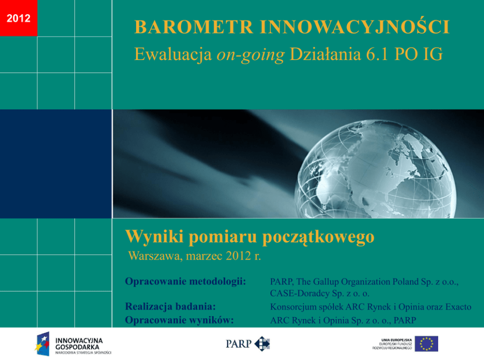 2011 2012 2011 BAROMETR INNOWACYJNOŚCI Ewaluacja on-going Działania 6.1 PO IG Wyniki pomiaru początkowego Warszawa, marzec 2012 r. Opracowanie metodologii: Realizacja badania: Opracowanie wyników: PARP, The Gallup Organization Poland Sp. z o.o., CASE-Doradcy Sp. z o. o. Konsorcjum spółek ARC Rynek i Opinia oraz Exacto ARC Rynek i Opinia Sp. z o. o., PARP Metodologia badania ewaluacyjnego • METODA: Projekt „Barometr Innowacyjności – ewaluacja on-going Działań PO IG skierowanych do przedsiębiorstw” jest realizowany w latach 2011-2015 w oparciu o technikę Computer Assisted Web Interviewing. • DOBÓR PRÓBY: Projekt obejmuje Działania Programu wdrażane przez PARP (1.4-4.1, 3.3.2, 4.2, 4.4, 5.4.1, 6.1, 8.1 i 8.2). Co do zasady, wszyscy beneficjenci Programu zapraszani są do udziału w badaniu dwukrotnie: w trakcie realizacji (pomiar początkowy ok. 1/3 okresu realizacji projektu) oraz 2 lata po zakończeniu projektu (pomiar końcowy). Badanie jest realizowane w cyklach półrocznych, w oparciu o przyjęty schemat doboru. Do pierwszej rundy badania (II p. 2011) zakwalifikowano 1562 projektów Działania 6.1, w tym 1494 do pomiaru początkowego i 69 – do końcowego. • • REALIZACJA: Beneficjenci w zaproszeniu otrzymali łącze do kwestionariuszy on-line, dotyczących właściwego projektu PO IG oraz wskazówki związane z ich wypełnieniem. W trakcie realizacji badania, zespół konsultantów (help desk), w razie potrzeby udzielał respondentom wsparcia technicznego i merytorycznego. Dla maksymalizacji response rate, kilkukrotnie kontaktowano się z przedsiębiorcami, którzy nie wypełnili kwestionariuszy (monit mailowy i telefoniczny). Pierwszą rundę ewaluacji Działania 6.1 prowadzono od września do grudnia 2011 r. Finalnie, w tej rundzie zrealizowano 723 efektywnych wywiadów: 690 – pomiar początkowy (46%); 33– pomiar końcowy (48%). Z uwagi na niską próbę pomiaru końcowego (por. schemat doboru), pierwsze wyniki końcowe, będzie można przedstawić po kolejnych rundach ewaluacji. PROFIL BENEFICJENTÓW I PROJEKÓW Profil beneficjentów Województwo % firm młodych i startupów Start-up* 0% 20% Mazowieckie 20% Wielkopolskie 15% 14% Małopolskie Młoda** 14% 71% Pozostałe Śląskie 9% Dolnośląskie 9% Pomorskie 9% Podkarpackie *Start-up - firma rozpoczęła działalność w ciągu roku przed złożeniem wniosku Kujawsko-Pomorskie **Młoda - firma rozpoczęła działalność w okresie od 1 roku do 3 lat przed złożeniem wniosku Wielkość przedsiębiorstwa Średnie 22% Mikro 45% 33% Małe 11% Łódzkie Zachodniopomorskie 7% 5% 4% 3% Opolskie 2% Lubelskie 2% Warmińsko-Mazurskie 2% Lubuskie 2% Podlaskie 2% Świętokrzyskie 2% 40% Wielkość miejscowości, w jakiej funkcjonują beneficjenci 82% projektów było realizowanych w miastach (najczęściej w miejscu siedziby beneficjenta), w tym 40% w miastach największych powyżej 500tys. mieszkańców. 18% projektów realizowano na obszarach wiejskich, natomiast 21% poza obrębem aglomeracji (ponad 30km od miasta pow. 100tys. mieszkańców). Miejsce realizacji projektu - zestawienie 0% 20% 40% Ogółem 60% 80% 100% 85% 15% n=2273 8.1 6% 94% n=717 8.2 89% 11% n=322 5.4.1 86% n=22 14% 1.4-4.1 83% 17% 6.1 82% 18% n=242 n=690 4.2 72% n=92 4.4 64% n=188 W mieście 28% 36% na terenach wiejskich (poza obrębem miast) Profil beneficjentów (3) Sektor działalności wg PKD 0% 20% Przetwórstwo przemysłowe 60% 80% 45% Handel hurtowy i detaliczny; naprawa pojazdów… 21% Informacja i komunikacja 13% Działalność profesjonalna, naukowa i techniczna Budownictwo 40% 9% 3% podstawowa działaność przedsiębiorstwa Działalność w zakresie usług administrowania i … 2% Opieka zdrowotna i pomoc społeczna 1% Transport i gospodarka magazynowa 1% Pozostała działalność usługowa 1% Działalność związana z obsługą rynku nieruchomości 1% Edukacja 1% Pozostałe 1% n=690 Profil beneficjentów (4) Wielkość zatrudnienia Beneficjenci Działania 6.1 to firmy, których poziom zatrudnienia przeciętnie wynosi 36,73 etaty Udział zatrudnienia kobiet w ogóle pracowników stanowi 33% Średnia liczba osób, z którymi podpisano przynajmniej jedną umowę cywilnoprawną to 7,4 29% 20% Wartości odnoszą się do roku złożenia przez firmę wniosku o dofinansowanie Okres prowadzenia działalności przez beneficjentów Beneficjenci Działania 6.1 funkcjonują na rynku od średnio 13 lat (13,3) więcej niż 26 lat 6% 21 - 25 lat 14% 16 - 20 lat mniej niż 5 lat 25% 17% 23% 16% 11 - 15 lat 6 -10 lat n=690 Profil beneficjentów (6) Forma prawna działalności 0% 20% 40% 60% 80% 100% osoba prawna 54% 0% 20% 40% 60% 80% 100% osoba fizyczna prowadząca działalność gospodarczą 34% spółka z ograniczoną odpowiedzialnością spółka akcyjna spółka jawna spółka cywilna jednostka organizacyjna nie mająca osobowości prawnej 7% 79% 11% 6% spółka komandytowa 2% spółdzielnia 1% stowarzyszenie lub fundacja 1% 5% n=690 n=372 Doświadczenia z funduszami europejskimi 55% beneficjentów realizuje lub realizowało inne projekty współfinansowane ze środków UE n=690 Programy Unii Europejskiej z których korzystali lub korzystają Beneficjenci 6.1 0% 20% POIG - inne Działania niż Działanie 6.1 80% 44% SPO WKP 2004-2006 33% Funduszy przedakcesyjnych, np. programów… ZPORR 2004-2006 60% 47% RPO 2007-2013 PO KL 2007-2013 40% 21% 17% 7% SPO RZL 2004-2006 4% PROW 2007-2013 4% PO RPW 2007-2013 2% SPO ROL 2004-2006 2% Pyt. wielokrotnego wyboru SPO RYBY 2004-2006 1% n=381 Doświadczenia z funduszami europejskimi - zestawienie Beneficjenci którzy realizowali lub realizują inne projekty współfinansowane ze środków UE 0% 20% Ogółem 40% 41% n=2281 1.4-4.1 68% n=242 5.4.1 59% n=22 4.4 57% n=188 6.1 55% n=690 4.2 49% n=92 8.2 45% n=323 8.1 n=721 11% 60% 80% Wartość projektów i dofinansowania w Działaniu 6.1.1 Średnia wartość dofinansowania w Działaniu 6.1.1 wyniosła 9 668,7 zł Stanowi to średnio 79% wartości kwal
