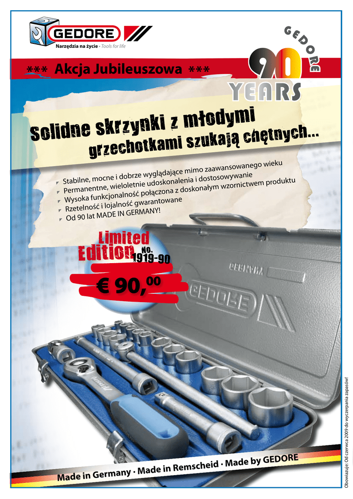 l Narzędzia na życie • Tools for life *** Akcja Jubileuszowa *** wanego wieku so n a w a za o ce mim brze wyglądają o d i e n c stosowywanie o o d m i , e ia n iln le uktu a n o TT Stab sk rnictwem prod zo ieloletnie udo w w m , e ły a tn n n o e n sk a na z do TT Perm alność połączo n jo c k n fu a k wane TT Wyso lność gwaranto ja lo i ść o ln te TT Rze IN GERMANY! E D A M t la 0 9 TT Od Limited Edition19N19o. -90 ny . M a Made in Germ heid . Made ade in Remsc by GEDORE Obowiazuje: Od czerwca 2009 do wyczerpania zapasów! € 90,00 Narzędzia na życie • Tools for life *** Akcja Jubileuszowa *** Nr 1919-90 od1 Kod 2178915 TT Zestaw specjalny – Made in Germany, w solidnej stalowej skrzynce GEDORE TT Zestaw najczęściej stosowanych narzędzi z czopem 1/2" i pokrętła w najlepszej jakości GEDORE, wszechstronne i wielofunkcyjne zastosowanie TT 6-kątne nasadki na czop 1/2" do pracy „z pełną parą” TT Solidna, przełączalna grzechotka z przyciskiem zwalniającym nasadkę Kod Nr Grzechotka 2178915 1919-90 _ 1993 U-20 Nasadki Akcesoria 1 19 10 12 13 14 15 16 17 18 19 21 22 24 27 30 32 + 1987 ' 1990-5 -10 ) 1995 o d 1 kute na gorąco Klucze nasadkowe GEDORE odznaczają się, jak pozostałe narzędzia kute na gorąco, swoją jednorodną strukturą. Włókna materiału przebiegają równolegle do krawędzi narzędzia. Nieprzerwany przebieg włókien materiału wyeliminowuje naprężenia własne. W narzędziach kutych na zimno, włókna materiału lub linie naprężeń są załamane. Przebieg włókien odgrywa ważną rolę także w materiałach naturalnych. Miękki przebieg włókien w gałęziach, czyni je odpornym na zginanie i skręcanie. Załamanie włókien powoduje utratę stabilności gałęzi i ich łamanie. Pozbawione naprężeń „Orzechy GEDORE” przenoszą skoki naprężeń znacznie lepiej niż formowane na zimno klucze nasadkowe. Wasz dostawca: Narzędzia na życie • Tools for life GEDORE POLSKA Spółka z o.o. 43-190 Mikołów · ul. Żwirki i Wigury 56 tel.: 048-32-738-40-10 · fax: 048-32-738-40-20 e-mail: [email protected] · www.gedore.pl www.gedore.com © copyright GEDORE Germany 2203340 Pro GPL PL mP 1919_90 Jubi 09 Specjalna cena netto Wszystkie informacje i ceny dotyczą szt./zestawu. Ceny bez przewidzianego prawem podatku VAT obowiązuję jedynie w obrocie gospodarczym i w dalszej odsprzedaży. Prosimy pytać u swoich regionalnych, profesjonalnych dostawców. TT Nasadki