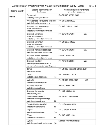 Zakres badań wykonywanych w Laboratorium Badań Wody i Gleby Badane obiekty Woda Badane cechy i metody badawcze Strona 1 Normy i/lub udokumentowane procedury badawcze Odczyn pH Metoda potencjometryczna PN-EN ISO 10523:2012 Przewodność elektryczna właściwa Metoda konduktometryczna PN-EN 27888:1999 Stężenie jonu amonowego, azotu amonowego Metoda spektrofotometryczna PN ISO 7150 -1 : 2002 Stężenie azotanów, azotu azotanowego Metoda spektrofotometryczna PN-82/C-04576.08 Stężenie azotynów, azotu azotynowego Metoda spektrofotometryczna PN-EN 26777:1999 Stężenie manganu ogólnego Metoda spektrofotometryczna PN-92/C-04590/02 Stężenie żelaza ogólnego Metoda spektrofotometryczna PN-ISO 6332:2001 Stężenie fluorków Metoda potencjometryczna z użyciem elektrody jonoselektywnej PN-78/C-04588.03 Barwa Metoda wizualna PN-EN ISO 7887:2012 Metoda D Zapach Metoda organoleptyczna Stężenie chlorków Metoda miareczkowa PN-ISO 9297:1994 Stężenie siarczanów Metoda wagowa PN-ISO 9280:2002 Utlenialność z KMnO4 (indeks nadmanganianowy) Metoda miareczkowa PN-EN ISO 8467:2001 Wapń Metoda miareczkowa Cyjanki Metoda spektrofotometryczna (W b) PN - EN 1622 : 2006 PN-EN ISO 7027:2003 Magnez Metoda obliczeniowa (W b) (N) Mętność Metoda nefelometryczna Twardość (jako CaCO3) Metoda miareczkowa (W b) (N) PN – ISO 6059:1999 (N) PN-C-04554-4:1999 (N) PN ISO 6058:1999 (N) Metoda 8027 Hach Lange (N) (W) Strona 2 Zakres badań wykonywanych w Laboratorium Badań Wody i Gleby Badane obiekty Woda Badane cechy i metody badawcze Normy i/lub udokumentowane procedury badawcze Liczba Escherichia coli i bakterii grupy coli. Metoda filtracji membranowej. PN-EN ISO 9308-1:2014 – 12 Obecność i liczba Escherichia coli i bakterii grupy coli. Metoda NPL -Test Colilert-18 (N) PN-EN ISO 9308-2:2014 – 06 Obecność i liczba enterokoków Metoda filtracji membranowej. PN-EN ISO 7899-2:2004 Liczba mikroorganizmów na agarze odżywczym w temperaturze (36±2) o C . Metoda posiewu wgłębnego PN-EN ISO 6222:2004 Liczba mikroorganizmów na agarze odżywczym w temperaturze (22±2) oC . Metoda posiewu wgłębnego PN-EN ISO 6222:2004 Obecność i liczba Pseudomonas aeruginosa Metoda filtracji membranowej PN-EN ISO 16266:2009 Obecność i liczba Clostridium redukującego siarczyny Metoda filtracji membranowej PN-EN 26461 -2:2001 (N) Dyrektywa Rady UE 98/83/WE z dn. 03.11.1998 zał. 3 Obecność i liczba Clostridium perfringens łącznie ze sporami Metoda filtracji membranowej woda z basenów, Liczba gronkowców ciepła woda koagulazododatnich użytkowa Obecność i liczba bakterii z rodzaju Legionella Metoda filtracji membranowej PN—Z – 11001 – 3 :2000 zał. A (N) PN –EN ISO 11731-2:2008, Woda z kąpielisk Obecność i liczba Escherichia coli Metoda filtracji membranowej (N) Obecność i liczba enterokoków Metoda filtracji membranowej Gleba Miano Clostridium perfringens Wilgotność PN-EN ISO 9308-3:2002 PN-EN ISO 7899-2:2004 (N) Instytut Medycyny Wsi Lublin 1995 r. (N) „Wytyczne metodyczne (mikrobiologiczno – parazytologiczne) do oceny sanitarnej gleby” N – metoda nieakredytowana Wb – norma wycofana przez PKN bez zastąpienia W – norma wycofana przez PKN ( zastąpiona przez normę w języku angielskim)