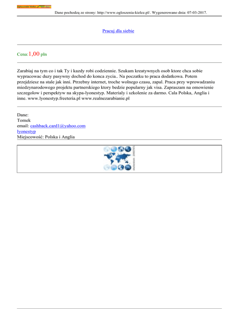Dane pochodzą ze strony: http://www.ogloszenia-kielce.pl/. Wygenerowano dnia: 07-03-2017. Pracuj dla siebie Cena:1,00 pln Zarabiaj na tym co i tak Ty i kazdy robi codziennie. Szukam kreatywnych osob ktore chca sobie wypracowac duzy pasywny dochod do konca zycia.. Na poczatku to praca dodatkowa. Potem przejdziesz na stale jak inni. Ptrzebny internet, troche wolnego czasu, zapal. Praca przy wprowadzaniu miedzynarodowego projektu partnerskiego ktory bedzie popularny jak visa. Zapraszam na omowienie szczegolow i perspektyw na skypa-lyonestyp. Materialy i szkolenie za darmo. Cala Polska, Anglia i inne. www.lyonestyp.freeteria.pl www.realnezarabianie.pl Dane: Tomek email: [email protected] lyonestyp Miejscowość: Polska i Anglia