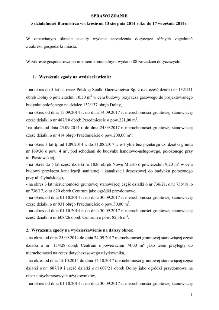 SPRAWOZDANIE z działalności Burmistrza w okresie od 13 sierpnia 2014 roku do 17 września 2014r. W omawianym okresie zostały wydane zarządzenia dotyczące różnych zagadnień z zakresu gospodarki miasta. W zakresie gospodarowania mieniem komunalnym wydano 88 zarządzeń dotyczących: 1. Wyrażenia zgody na wydzierżawienie: - na okres do 5 lat na rzecz Polskiej Spółki Gazownictwa Sp. z o.o. część działki nr 132/141 obręb Dolny o powierzchni 10,30 m2 w celu budowy przyłącza gazowego do projektowanego budynku położonego na działce 132/137 obręb Dolny, - na okres od dnia 15.09.2014 r. do dnia 14.09.2017 r. nieruchomości gruntowej stanowiącej część działki o nr 487/10 obręb Przedmieście o pow.221,00 m2, - na okres od dnia 25.09.2014 r. do dnia 24.09.2017 r. nieruchomości gruntowej stanowiącej część działki o nr 414 obręb Przedmieście o pow.200,00 m2, - na okres 3 lat tj. od 1.09.2014 r. do 31.08.2017 r. w trybie bez przetargu cz. działki gruntu nr 169/36 o pow. 4 m2, pod schodami do budynku handlowo-usługowego, położonego przy ul. Piastowskiej, - na okres do 5 lat część działki nr 1026 obręb Nowe Miasto o powierzchni 9,20 m2 w celu budowy przyłącza kanalizacji sanitarnej i kanalizacji deszczowej do budynku położonego przy ul. Cybulskiego, - na okres 3 lat nieruchomości gruntowej stanowiącej część działki o nr 736/21, o nr 736/18, o nr 736/17, o nr 820 obręb Centrum jako ogródki przydomowe, - na okres od dnia 01.10.2014 r. do dnia 30.09.2017 r. nieruchomości gruntowej stanowiącej część działki o nr 931 obręb Przedmieście o pow.30,00 m2, - na okres od dnia 01.10.2014 r. do dnia 30.09.2017 r. nieruchomości gruntowej stanowiącej część działki o nr 608/26 obręb Centrum o pow. 82,36 m2. 2. Wyrażenia zgody na wydzierżawienie na dalszy okres: - na okres od dnia 25.09.2014 do dnia 24.09.2017 nieruchomości gruntowej stanowiącej część działki o nr 154/28 obręb Centrum o powierzchni 74,00 m2 jako teren przyległy do nieruchomości na rzecz dotychczasowego użytkownika, - na okres od dnia 15.10.2014 do dnia 14.10.2017 nieruchomości gruntowej stanowiącej część działki o nr 607/19 i część działki o nr 607/21 obręb Dolny jako ogródki przydomowe na rzecz dotychczasowych użytkowników, - na okres od dnia 01.10.2014 r. do dnia 30.09.2017 r. nieruchomości gruntowej stanowiącej 1 część działki o nr 487/10 obręb Przedmieście o powierzchni 350,00 m2 jako ogródek przydomowy na rzecz dotychczasowego użytkownika. 3. Wyrażenia zgody na zawarcie umowy najmu: - do 31.07.2017r. garażu o powierzchni 18,62m2 położonego w Dzierżoniowie przy ul. Nowowiejskiej z dotychczasowym najemcą, - do 30.06.2017r. garażu o powierzchni 15,81m2 położonego w Dzierżoniowie przy ul. Gen. Andersa z dotychczasowym najemcą, - do 31.07.2017r. garażu o powierzchni 47,29m2 położonego w Dzierżoniowie przy ul. Nowowiejskiej z dotychczasowym najemcą, - do 30.09.2017 r. lokalu użytkowego o powierzchni 5,00 m2 położonego w Dzierżoniowie przy ul. Klasztornej z dotychczasowym najemcą, - do 30.09.2017 r. lokalu użytkowego o powierzchni 42,35 m2 położonego w Dzierżoniowie przy ul. Ząbkowickiej z dotychczasowym najemcą, - do 30.09.2017 r. lokalu użytkowego o powierzchni 34,20 m2 położonego w Dzierżoniowie przy ul. Ząbkowickiej z dotychczasowym najemcą, - do dnia 31.12.2014 r. garażu o powierzchni 24,29 m2 położonego w Dzierżoniowie przy Rynku z dotychczasowym najemcą, - do 30.09.2017 r. lokalu użytkowego o powierzchni 39,10 m2 położonego w Dzierżoniowie przy ul. Rolnej z dotychczasowym najemcą, - do 30.09.2017 r. lokalu użytkowego o powierzchni 34,20 m2 położonego w Dzierżoniowie przy ul. Ząbkowickiej z dotychczasowym najemcą. 4. Wyrażenia zgody na ogłoszenia rokowań: - na sprzedaż nieruchomości niezabudowanej opisanej działką nr 1368/2 o pow. 12 267 m2 położonej przy ul. Brzegowej w Dzierżoniowie w obrębie Dolny, - na sprzedaż nieruchomości niezabudowanej opisanej działką nr 387/49 o pow. 2008 m2 położonej w Dzierżoniowie w obrębie Nowe Miasto. 5. Wyrażenia zgody na przeznaczenie do wynajmu: - lokali mieszkalnych położonych w Dzierżoniowie przy: ul. Garbarska 2/2, o powierzchni 75,90 m2; ul. Kopernika16/5, o powierzchni 20,99 m2 ; ul. Prochowa 1a/7 o powierzchni 39,11m2; 2 - lokalu socjalnego położonego w Dzierżoniowie przy ul. Nowowiejskiej 95/6, o powierzchni 21,96 m2; - lokalu mieszkalnego nr 9 położonego w Dzierżoniowie przy ul. Mostowej 5; - lokalu mieszkalnego nr 13 położonego w Dzierżoniowie przy ul. Nowowiejskiej 63; - lokalu mieszkalnego nr 1 położonego w Dzierżoniowie przy ul. Miodowej 21. 6. Wyrażenia zgody na sprzedaż: - w trybie ustnego nieograniczonego przetargu nieruchomości zabudowanej budynkiem warsztatowym, oznaczonej w ewidencji gruntów jako działka nr 496/3 o pow.1148 m2 obręb Centrum, położonej przy ul. Szkolnej w Dzierżoniowie; - w trybie ustnego nieograniczonego przetargu nieruchomości zabudowanej budynkiem użytkowym wielolokalowym oraz budynkiem garażowym opisanej działką nr 496/4 o pow. 3142 m2 położonej przy ul. Świdnickiej 35 w Dzierżoniowie w obrębie Centrum; - w trybie ustnego nieograniczonego przetargu nieruchomości niezabudowanej, oznaczonej w ewidencji gruntów jako działka nr 104/3 o pow.39 m2 wraz z udziałem 1/3 w działce dojazdowej nr 104/7 o pow. 136 m2, położonej w Dzierżoniowie, w obrębie Nowe Miasto; - w trybie ustnego nieograniczonego przetargu działki niezabudowanej nr 187 o powierzchni 4 228 m² położonej w obrębie Zachód przy ul. Zachodniej. 7. Wyrażenia zgody na przeznaczenie do sprzedaży: - w drodze przetargu nieograniczonego lokali mieszkalnych: nr 13, położony w Dzierżoniowie, w budynku przy ul. Nowowiejskiej 63; nr 1 położony w Dzierżoniowie w budynku przy ul. Ząbkowickiej 17; - w drodze bezprzetargowej udział 1/2 w nieruchomości zabudowanej, położonej w Dzierżoniowie przy ul. Brze