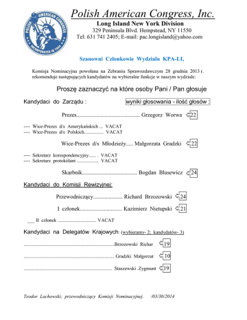 Polish American Congress, Inc. Long Island New York Division 329 Peninsula Blvd. Hempstead, NY 11550 Tel: 631 741 2405; E-mail: [email protected] Szanowni Członkowie Wydziału KPA-LI, Komisja Nominacyjna powołana na Zebraniu Sprawozdawczym 28 grudnia 2013 r. rekomenduje następujących kandydatów na wybieralne funkcje w naszym wydziale: Proszę zaznaczyć na które osoby Pani / Pan głosuje Kandydaci do Zarządu : wyniki głosowania - ilość głosów : Prezes............................................. Grzegorz Worwa 22 ---- Wice-Prezes d/s Amerykańskich ... VACAT ---- Wice-Prezes d/s Polskich................ VACAT Wice-Prezes d/s Młodzieży..... Małgorzata Gradzki 22 ---- Sekretarz korespondencyjny...... . VACAT ---- Sekretarz protokólant .................. VACAT Skarbnik....................................... Bogdan Blusewicz Kandydaci do Komisji Rewizyjnej: Przewodniczący..................... Richard Brzozowski 24 I członek.............................. Kazimierz Nietupski 21 ___ II członek ................................ VACAT Kandydaci na Delegatów Krajowych: (wybieramy- 2; kandydatów- 3) ...........................................................................Brzozowski Richar 19 ........................................................................... Gradzki Małgorzat 10 ......................................................................... Staszewski Zygmunt 19 Teodor Lachowski; przewodniczący Komisji Nominacyjnej. /03/30/2014 24