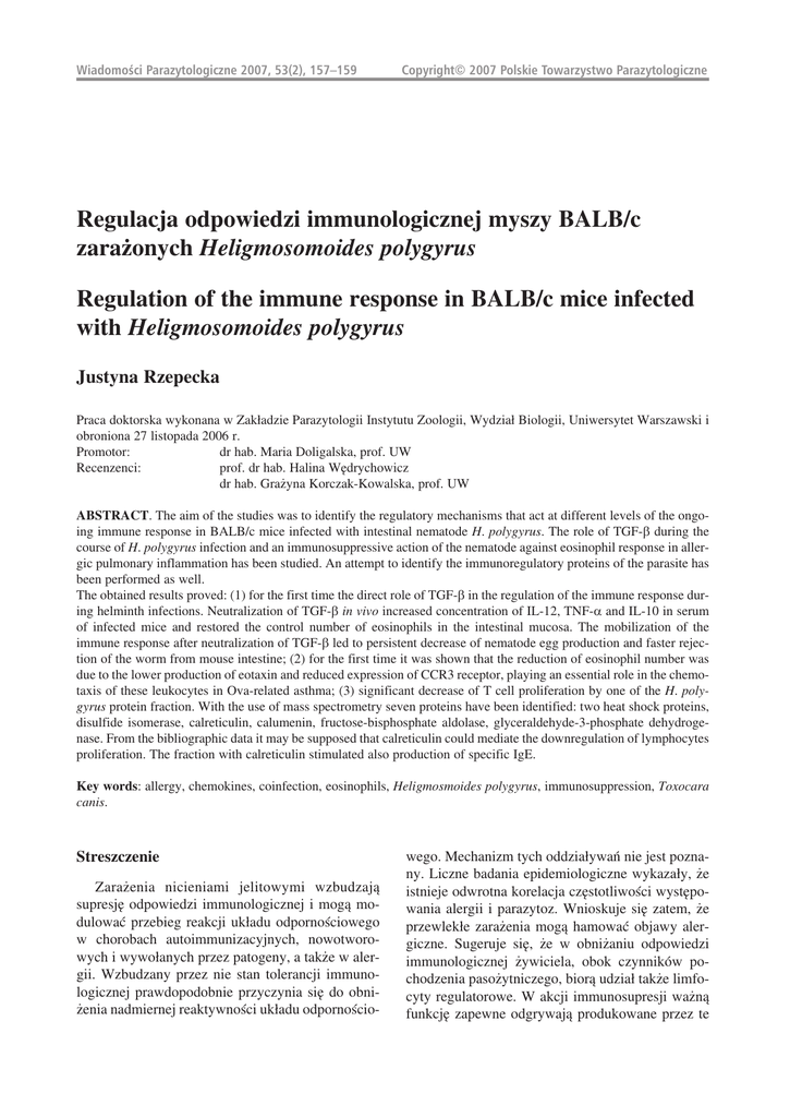 Wiadomoœci Parazytologiczne 2007, 53(2), 157–159 Copyright© 2007 Polskie Towarzystwo Parazytologiczne Regulacja odpowiedzi immunologicznej myszy BALB/c zarażonych Heligmosomoides polygyrus Regulation of the immune response in BALB/c mice infected with Heligmosomoides polygyrus Justyna Rzepecka Praca doktorska wykonana w Zakładzie Parazytologii Instytutu Zoologii, Wydział Biologii, Uniwersytet Warszawski i obroniona 27 listopada 2006 r. Promotor: dr hab. Maria Doligalska, prof. UW Recenzenci: prof. dr hab. Halina Wędrychowicz dr hab. Grażyna Korczak−Kowalska, prof. UW ABSTRACT. The aim of the studies was to identify the regulatory mechanisms that act at different levels of the ongoing immune response in BALB/c mice infected with intestinal nematode H. polygyrus. The role of TGF−b during the course of H. polygyrus infection and an immunosuppressive action of the nematode against eosinophil response in allergic pulmonary inflammation has been studied. An attempt to identify the immunoregulatory proteins of the parasite has been performed as well. The obtained results proved: (1) for the first time the direct role of TGF−b in the regulation of the immune response during helminth infections. Neutralization of TGF−b in vivo increased concentration of IL−12, TNF−a and IL−10 in serum of infected mice and restored the control number of eosinophils in the intestinal mucosa. The mobilization of the immune response after neutralization of TGF−b led to persistent decrease of nematode egg production and faster rejection of the worm from mouse intestine; (2) for the first time it was shown that the reduction of eosinophil number was due to the lower production of eotaxin and reduced expression of CCR3 receptor, playing an essential role in the chemotaxis of these leukocytes in Ova−related asthma; (3) significant decrease of T cell proliferation by one of the H. polygyrus protein fraction. With the use of mass spectrometry seven proteins have been identified: two heat shock proteins, disulfide isomerase, calreticulin, calumenin, fructose−bisphosphate aldolase, glyceraldehyde−3−phosphate dehydrogenase. From the bibliographic data it may be supposed that calreticulin could mediate the downregulation of lymphocytes proliferation. The fraction with calreticulin stimulated also production of specific IgE. Key words: allergy, chemokines, coinfection, eosinophils, Heligmosmoides polygyrus, immunosuppression, Toxocara canis. Streszczenie Zarażenia nicieniami jelitowymi wzbudzają supresję odpowiedzi immunologicznej i mogą modulować przebieg reakcji układu odpornościowego w chorobach autoimmunizacyjnych, nowotworowych i wywołanych przez patogeny, a także w alergii. Wzbudzany przez nie stan tolerancji immunologicznej prawdopodobnie przyczynia się do obniżenia nadmiernej reaktywności układu odpornościo- wego. Mechanizm tych oddziaływań nie jest poznany. Liczne badania epidemiologiczne wykazały, że istnieje odwrotna korelacja częstotliwości występowania alergii i parazytoz. Wnioskuje się zatem, że przewlekłe zarażenia mogą hamować objawy alergiczne. Sugeruje się, że w obniżaniu odpowiedzi immunologicznej żywiciela, obok czynników pochodzenia pasożytniczego, biorą udział także limfocyty regulatorowe. W akcji immunosupresji ważną funkcję zapewne odgrywają produkowane przez te 158 limfocyty cytokiny IL−10 i TGF−b, modulujące odpowiedź subpopulacji limfocytów Th1 i Th2. Celem pracy było wskazanie potencjalnych mechanizmów regulacyjnych, na różnych poziomach odpowiedzi immunologicznej u myszy BALB/c, zarażonych nicieniem jelitowym Heligmosomoides polygyrus. Nicień ten hamuje stan zapalny w jelicie cienkim oraz moduluje obwodową odpowiedź immunologiczną myszy przez wiele miesięcy. Przejawia się to m. in. zmniejszeniem nacieku eozynofilów i komórek tucznych w błonie śluzowej jelita. Jednym z czynników kontrolujących aktywność komórek układu odpornościowego, w tym eozynofilów, jest TGF−b, wzbudzający tolerancję na antygeny. W celu określenia wpływu TGF−b na odpowiedź immunologiczną i przebieg zarażenia H. polygyrus u myszy, przeprowadzono neutralizację tego czynnika in vivo za pomocą przeciwciał monoklonalnych. Założono, że zahamowanie aktywności TGF−ß przyczyni się do zablokowania mechanizmu regulacyjnego i spowoduje nasilenie obronnej odpowiedzi immunologicznej, doprowadzającej do osłabienia inwazji nicienia. Następnie badano, czy zarażenie H. polygyrus obniża naciek eozynofilów w modelu astmy u myszy BALB/c. Oznaczano liczebność tych komórek w płynie oskrzelowo−pęcherzykowym myszy po immunizacji owoalbuminą (Ova). Zmiany w poziomie aktywacji, zależne od IL−5, eotaksyny i ekspresji receptorów powierzchniowych eozynofilów, świadczyłyby o modulacji odpowiedzi tych granulocytów podczas zarażenia H. polygyrus. W przewlekłych zarażeniach nicieniami obserwuje się zahamowanie odpowiedzi limfocytów T i zmniejszenie produkcji cytokin. Produkty wydzielane przez helminty mogą bezpośrednio osłabiać aktywność układu odpornościowego, jak na przykład antygenowo−specyficzną proliferację limfocytów T. Za pomocą chromatografii żelowej sprzężonej z FPLC dokonano rozdziału mieszaniny białek sekrecyjnych pasożyta na frakcje. Badano następnie, które z nich hamują proliferację splenocytów myszy Ova−TCR transgenicznych, silnie proliferujących pod wpływem Ova w hodowli in vitro. Wskazanie frakcji białkowych, ich składu molekularnego i immunogenności mierzonej poziomem swoistego IgE, służyło identyfikacji czynników aktywnych w mechanizmie immunosupresji. Na podstawie uzyskanych wyników wykazano: i. udział TGF−b w utrzymaniu zarażenia H. polygyrus u myszy BALB/c oraz hamowaniu reakcji im- J. Rzepecka munologicznych żywiciela. Jest to pierwsza praca, która potwierdza bezpośredni udział tego czynnika w regulacji odpowiedzi układu odpornościowego w czasie