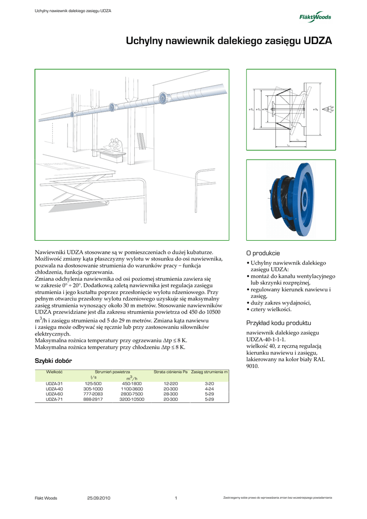 Uchylny nawiewnik dalekiego zasięgu UDZA Uchylny nawiewnik dalekiego zasięgu UDZA Nawiewniki UDZA stosowane są w pomieszczeniach o dużej kubaturze. Możliwość zmiany kąta płaszczyzny wylotu w stosunku do osi nawiewnika, pozwala na dostosowanie strumienia do warunków pracy − funkcja chłodzenia, funkcja ogrzewania. Zmiana odchylenia nawiewnika od osi poziomej strumienia zawiera się w zakresie 0° ÷ 20°. Dodatkową zaletą nawiewnika jest regulacja zasięgu strumienia i jego kształtu poprzez przesłonięcie wylotu rdzeniowego. Przy pełnym otwarciu przesłony wylotu rdzeniowego uzyskuje się maksymalny zasięg strumienia wynoszący około 30 m metrów. Stosowanie nawiewników UDZA przewidziane jest dla zakresu strumienia powietrza od 450 do 10500 O produkcie • Uchylny nawiewnik dalekiego zasięgu UDZA: • montaż do kanału wentylacyjnego lub skrzynki rozprężnej, • regulowany kierunek nawiewu i zasięg, • duży zakres wydajności, • cztery wielkości. m3/h i zasięgu strumienia od 5 do 29 m metrów. Zmiana kąta nawiewu i zasięgu może odbywać się ręcznie lub przy zastosowaniu siłowników elektrycznych. Maksymalna rożnica temperatury przy ogrzewaniu Δtp ≤ 8 K. Maksymalna rożnica temperatury przy chłodzeniu Δtp ≤ 8 K. Przykład kodu produktu nawiewnik dalekiego zasięgu UDZA-40-1-1-1. wielkość 40, z ręczną regulacją kierunku nawiewu i zasięgu, lakierowany na kolor biały RAL 9010. Szybki dobór Wielkość UDZA-31 UDZA-40 UDZA-60 UDZA-71 Fläkt Woods Strumień powietrza l/s m3/h 125-500 305-1000 777-2083 888-2917 25.09.2010 450-1800 1100-3600 2800-7500 3200-10500 Strata ciśnienia Pa Zasięg strumienia m 12-220 20-300 28-300 20-300 1 3-20 4-24 5-29 5-29 Zastrzegamy sobie prawo do wprowadzania zmian bez wcześniejszego powiadamiania Uchylny nawiewnik dalekiego zasięgu UDZA Charakterystyka UDZA-31 Zasięg strumienia powietrza Strata ciśnienia i hałas Na wykresie podano poziom ciśnienia akustycznego LA10 − dla pomieszczenia o powierzchni pochłaniania 10 m2 Sabine i tłumieniu 4 dB. ________ rdzeń otwarty _ _ _ _ _ rdzeń zamknięty Fläkt Woods 25.09.2010 2 Zastrzegamy sobie prawo do wprowadzania zmian bez wcześniejszego powiadamiania Uchylny nawiewnik dalekiego zasięgu UDZA Charakterystyka UDZA-40 Zasięg strumienia powietrza Strata ciśnienia i hałas Na wykresie podano poziom ciśnienia akustycznego LA10 − dla pomieszczenia o powierzchni pochłaniania 10 m2 Sabine i tłumieniu 4 dB. ________ rdzeń otwarty _ _ _ _ _ rdzeń zamknięty Fläkt Woods 25.09.2010 3 Zastrzegamy sobie prawo do wprowadzania zmian bez wcześniejszego powiadamiania Uchylny nawiewnik dalekiego zasięgu UDZA Charakterystyka UDZA-60 Zasięg strumienia powietrza Strata ciśnienia i hałas Na wykresie podano poziom ciśnienia akustycznego LA10 − dla pomieszczenia o powierzchni pochłaniania 10 m2 Sabine i tłumieniu 4 dB. ________ rdzeń otwarty _ _ _ _ _ rdzeń zamknięty Fläkt Woods 25.09.2010 4 Zastrzegamy sobie prawo do wprowadzania zmian bez wcześniejszego powiadamiania Uchylny nawiewnik dalekiego zasięgu UDZA Charakterystyka UDZA-71 Zasięg strumienia powietrza Strata ciśnienia i hałas Na wykresie podano poziom ciśnienia akustycznego LA10 − dla pomieszczenia o powierzchni pochłaniania 10 m2 Sabine i tłumieniu 4 dB. ________ rdzeń otwarty _ _ _ _ _ rdzeń zamknięty Fläkt Woods 25.09.2010 5 Zastrzegamy sobie prawo do wprowadzania zmian bez wcześniejszego powiadamiania Uchylny nawiewnik dalekiego zasięgu UDZA Poziom mocy akustycznej, wymiary, rozkład strumieni Poziom mocy akustycznej Wielkość/Hz 63 3 1 0 2 31 40 60 71 Rozkład strumieni Współczynnik korekcyjny Kokw dB przy 125 250 500 1000 2000 4000 8000 2 1 4 4 -12 -18 -28 0 -1 -3 -5 -11 -17 -27 -1 -2 -3 -5 -9 -15 -25 1 0 -4 -7 -11 -17 -27 Do określenia poziomu mocy akustycznej w oktawach należy do wartości LA10 dodać współczynnik korekcyjny Kok: Lw = LA10 + Kok Rozkład strumieni przy całkowicie otwartym wylocie rdzenia. Tłumienie dźwięku ΔL [dB] Wielkość/Hz 63 3 6 6 4 31 40 60 71 Tłumienie dźwięku w dB przy 125 250 500 1000 2000 4000 8000 4 4 9 7 3 3 2 3 2 5 8 4 4 3 3 4 6 8 5 5 4 2 3 5 6 7 4 4 Wymiary Rozkład strumieni przy całkowicie zamkniętym wylocie rdzenia. Oznaczenia q Δpt L02 LA10 Lw Kok ΔL strumień powietrza z nawiewnika, spadek ciśnienia, zasięg strumienia, poziom ciśnienia akustycznego w pomieszczeniu o powierzchni pochłaniania 10 m2 Sabine i tłumieniu 4 dB, poziom mocy akustycznej, współczynnik korekcyjny tłumienie m3/h, l/s Pa m dB(A) dB dB dB Wielkość (mm) UDZA-31 UDZA-40 UDZA-60 UDZA-71 Fläkt Woods ØDN ØD1 ØD2 ØD3 L1 L2 Waga, kg 315 400 600 710 560 710 998 1246 440 560 865 920 470 596 903 960 150 205 240 310 345 410 620 690 10.0 11.9 28.0 38.0 25.09.2010 6 Zastrzegamy sobie prawo do wprowadzania zmian bez wcześniejszego powiadamiania Uchylny nawiewnik dalekiego zasięgu UDZA Sposoby montażu nawiewnika Wielkość UDZA-31 UDZA-40 UDZA-60 UDZA-71 Fläkt Woods Wysokość zamontowania Minimalna odległość nawiewnika, m między nawiewnikami, m 4 1.2 4 1.5 4 2.1 4 2.5 25.09.2010 7 Zastrzegamy sobie prawo do wprowadzania zmian bez wcześniejszego powiadamiania Uchylny nawiewnik dalekiego zasięgu UDZA Kod zamówienia Kod zamówienia Nawiewnik uchylny dalekiego zasięgu UDZA-aa-b-c-d Wielkość (aa) 31, 40, 60, 71 Regulacja zasięgu (b) 1 = ręczna 2 = siłownikiem elektrycznym Regulacja kąta nawiewu (c) 0 = bez regulacji (nawiewnik bez pierścienia mocującego i płaszcza elastycznego) 1 = ręczna 2 = siłownikiem elektrycznym Kolor (d) 1 = standardowy kolor RAL 9010 X = inny kolor na zamówienie Fläkt Woods 25.09.2010 8 Zastrzegamy sobie prawo do wprowadzania zmian bez wcześniejszego powiadamiania