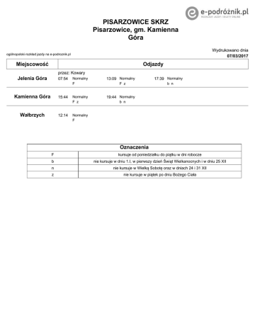 PISARZOWICE SKRZ Pisarzowice, gm. Kamienna Góra Wydrukowano dnia 07/03/2017 ogólnopolski rozkład jazdy na e-podroznik.pl Miejscowość Odjazdy przez: Kowary Jelenia Góra 07:54 Kamienna Góra 15:44 Wałbrzych 12:14 Normalny F 13:09 Normalny Normalny F z 19:44 Normalny F z 17:39 Normalny b n b n Normalny F Oznaczenia F kursuje od poniedziałku do piątku w dni robocze b nie kursuje w dniu 1.I, w pierwszy dzień Świąt Wielkanocnych i w dniu 25 XII n nie kursuje w Wielką Sobotę oraz w dniach 24 i 31 XII z nie kursuje w piątek po dniu Bożego Ciała