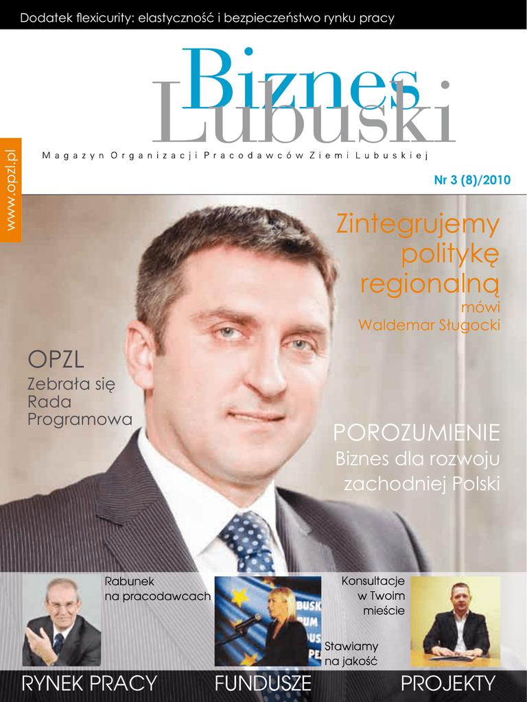 Dodatek flexicurity: elastyczność i bezpieczeństwo rynku pracy Nr 3 (8)/2010 Zintegrujemy politykę regionalną mówi Waldemar Sługocki OPZL Zebrała się Rada Programowa POROZUMIENIE Biznes dla rozwoju zachodniej Polski Konsultacje w Twoim mieœcie Rabunek na pracodawcach Stawiamy na jakoœæ RYNEK PRACY FUNDUSZE PROJEKTY Nr 3(8)/2010 Jedynie słuszna opcja? News Infrastruktura - Lubuskie od dwóch lat jest liderem jeśli chodzi o wydawanie środków unijnych. Ale tu nie chodzi o tempo, ale o jakość projektów - powiedziała na otwarcie II Lubuskiego Forum Funduszy Europejskich, minister rozwoju regionalnego Elżbieta Bieńkowska. Lubuski port lotniczy może być magnesem dla biznesu i innowacji. O możliwościach wykorzystania jego potencjału opowiada Maciej K. Król, prezes spółki Lotnisko Zielona Góra / Babimost. Prawo Fundusz pożyczkowy W prasie, radiu, Internecie oraz w terenie. Ruszyła akcja promocyjna Lubuskiego Funduszu Pożyczkowego na terenie powiatu nowosolskiego. W zachodniej Europie wykorzystuje się pełnię jego możliwości. W Polsce nie doceniamy jego potencjału – o partnerstwie publiczno-prywatnym pisze mecenas Gerard Dębski. Integracja W tajemniczej scenerii Zamku Joannitów szukali ukrytego skarbu. Tak integrował się biznes podczas drugiego dnia Lubuskiego Forum Gospodarczego. Forum gospodarcze Blisko dwustu uczestników zjechało do Łagowa na Lubuskie Forum Gospodarcze 2010. Tematem przewodnim tegorocznej edycji było miejsce zachodniej Polski w Krajowej Strategii Rozwoju Regionalnego. Pod koniec października uczestniczyłem w konferencji nt. współpracy samorządu terytorialnego z samorządem gospodarczym. O ile ten pierwszy jest precyzyjnie zdefiniowany, posiada przejrzystą strukturę i zadania określone ustawą oraz doświadczenia dwudziestu lat funkcjonowania, to samorząd gospodarczy jest mocno rozproszony i wciąż jest w powijakach. Organizatorzy konferencji winą za to obarczyli brak ustawy wprowadzającej powszechny samorząd gospodarczy. Powszechny, czyli obowiązkowy, finansowany z kieszeni przedsiębiorcy lub z budżetu państwa kwotą ok. 200 mln zł rocznie. Postulatorzy projektu takiej ustawy tj. Krajowa Izba Gospodarcza, Związek Rzemiosła Polskiego, Business Centre Club chociaż wielokrotnie wzywali rząd do ograniczenia wydatków publicznych, teraz lekką ręką chcą z pieniędzy podatników finansować aparat samorządu gospodarczego, tak aby przedsiębiorcy posiadali mocną reprezentację w kontaktach z instytucjami państwa, które przecież tę strukturę ma finansować (!). Ja logiki w tym nie dostrzegam, za co zostałem odsądzony od czci i wiary. Mam jednak nieodparte wrażenie, że obowiązkowy samorząd gospodarczy to potrzeba nie tyle samych przedsiębiorców, ale przede wszystkim działaczy samorządu gospodarczego. To szansa dla tych aspirujących i tych rachitycznych stowarzyszeń przedsiębiorców, które w obowiązkowej przynależności firm upatrują jedyną szansę przetrwania i rozwoju. Wszelki obowiązek zabija inicjatywę, ogranicza aktywność: bo przecież czy się stoi, czy się leży, składka i tak się należy, więc po co się trudzić? Budujmy społeczeństwo prawdziwie obywatelskie, takie gdzie każdy przedsiębiorca będzie miał wybór czy chce być członkiem organizacji, izb, stowarzyszeń. Powszechność na zasadzie obowiązku kojarzy mi się nieodparcie z czasami, w których słuszna była tylko jedna opcja. Zapraszam do lektury naszego jesiennego magazynu, w którym udowadniamy, że warto się zrzeszać w OPZL. Oczywiście, dobrowolnie. Janusz Jasiński Przewodniczący Organizacja Pracodawców Ziemi Lubuskiej ul. Bohaterów Westerplatte 23 65-078 Zielona Góra tel. 68 327 18 81, 68 322 10 62 fax 68 327 18 81 www.opzl.pl [email protected] Przewodniczący Janusz Jasiński Przewodniczący Komisji Rewizyjnej Przemysław Karwowski Przewodniczący Rady Programowej Wacław Maciuszonek Dyrektor biura Jarosław Nieradka fot. na okładce Ministerstwo Rozwoju Regionalnego Oddział w Nowej Soli ul. Kościuszki 29 67-100 Nowa Sól tel./fax 68 356 94 32 [email protected] Oddział w Żarach ul. Wrocławska 12 68-200 Żary tel. 68 415 53 61 [email protected] NEWS Szkolenie z PIP OPZL wraz z Okręgowym Inspektoratem Pracy w Zielonej Górze 28 września zorganizowały szkolenie dla przedsiębiorców dotyczące zarządzania bezpieczeństwem pracy. Omówiono także minimalne wymagania w zakresie BHP oraz tematykę związaną z kontrolą PIP we wspomnianych obszarach. Maksymalna ocena wniosku 2.5 LRPO Na koniec września zakończyła się ocena merytoryczno-techniczna wniosku o dofinansowanie w ramach IPI LRPO dla Działania 2.5 „Rozwój regionalnych i lokalnych instytucji otoczenia”. Projekt złożony przez Organizację Pracodawców Ziemi Lubuskiej pt. „Rozwój regionalnej instytucji otoczenia biznesu poprzez utworzenie nowej siedziby i wdrożenie informatycznej platformy komunikacyjnej” otrzymał 45 punktów na 45 możliwych do uzyskania. Rady nadzorcze 15 października br. rozpoczęła się XXVIII edycja kursu w Zielonej Górze. Jego organizatorem jest Europejska Grupa Doradcza oraz OPZL. Kurs przygotowuje do pełnienia funkcji członka rady nadzorczej w spółkach Skarbu Państwa lub firmach prywatnych działających w oparciu o przepisy prawa handlowego. Wykładowcami są wybitni specjaliści i praktycy - Zajęcia prowadzę w interaktywny sposób, uczestnicy dokonują wymiany doświadczeń poprzez dyskusję panelową - informuje trener kursu, dr Mikołajczyk. Wiosną 2011 startuje kolejna edycja kursu. Ruszyli na pomoc powodzianom Jedną z najbardziej poszkodowanych miejscowości w wyniku letnich powodzi w Lubuskiem był Przewóz. Nowa Sól w roku 1997 przechodziła podobną tragedię, dlatego prezydent W. Tyszkiewicz ruszył z pomocą dla mieszkańców tej niewielkiej gminy. Zakupił z budżetu miasta przeszło 500 metrów kwadratowych paneli. Podłoga czekała na odebranie w Żarach. Prezydent 