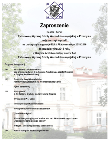 Zaproszenie Rektor i Senat Państwowej Wyższej Szkoły Wschodnioeuropejskiej w Przemyślu mają zaszczyt zaprosić na uroczystą inaugurację Roku Akademickiego 2015/2016 15 października 2015 roku w Bazylice Archikatedralnej oraz w Auli Państwowej Wyższej Szkoły Wschodnioeuropejskiej w Przemyślu Program inauguracji 1000 Msza Święta koncelebrowana pod przewodnictwem J. E. Księdza Arcybiskupa Józefa Michalika w Bazylice Archikatedralnej 1100 Przejazd z Bazyliki do siedziby Państwowej Wyższej Szkoły Wschodnioeuropejskiej Hymn państwowy 1130 Wystąpienie J. M. Rektora dra hab. inż. Krzysztofa Knapika Wystąpienia P.T. Gości Immatrykulacja studentów I roku Wystąpienie przedstawiciela studentów „Gaudeamus igitur” Wykład inauguracyjny prof. nadzw. dra hab. Wiesława Grzegorczyka – „Najwszechstronniejsza ze sztuk?” W foyer – wystawa publikacji uczelnianych 1300 Raut w Kolegium Technicznym PWSW