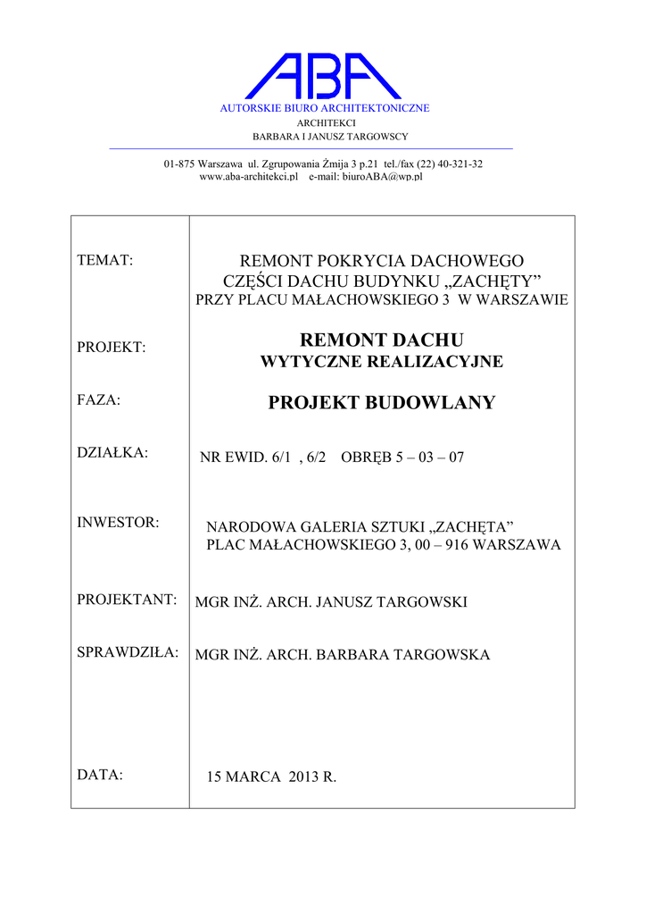 AUTORSKIE BIURO ARCHITEKTONICZNE ARCHITEKCI BARBARA I JANUSZ TARGOWSCY 01-875 Warszawa ul. Zgrupowania śmija 3 p.21 tel./fax (22) 40-321-32 www.aba-architekci.pl e-mail: [email protected] TEMAT: REMONT POKRYCIA DACHOWEGO CZĘŚCI DACHU BUDYNKU „ZACHĘTY” PRZY PLACU MAŁACHOWSKIEGO 3 W WARSZAWIE PROJEKT: FAZA: DZIAŁKA: INWESTOR: REMONT DACHU WYTYCZNE REALIZACYJNE PROJEKT BUDOWLANY NR EWID. 6/1 , 6/2 OBRĘB 5 – 03 – 07 NARODOWA GALERIA SZTUKI „ZACHĘTA” PLAC MAŁACHOWSKIEGO 3, 00 – 916 WARSZAWA PROJEKTANT: MGR INś. ARCH. JANUSZ TARGOWSKI SPRAWDZIŁA: MGR INś. ARCH. BARBARA TARGOWSKA DATA: 15 MARCA 2013 R. OPIS TECHNICZNY Spis treści 1. 2. 3. 4. 5. 6. 7. 8. Podstawa opracowania Opis ogólny Ocena stanu technicznego istniejącego pokrycia Prace rozbiórkowe Odtworzenie pokrycia dachowego Remont obróbek blacharskich Miedziane ławy kominiarskie Bezpieczeństwo prac budowlanych. 1. Podstawa opracowania 1.1. Umowa pomiędzy Inwestorem i ABA z dnia 14.02.2013 r. 1.2. Ustalenie zakresu prac remontowych z Inwestorem. 1.3. Wizja lokalna dachu wraz z dokumentacją zdjęciowa. 1.4. Dokumentacja archiwalna budynku z 1993 r., wykonana przez ABA. 1.5. Pomiary na dachu dla wykonania korekt usytuowania kominów wentylacyjnych i nowych elementów wentylacji mechanicznej ( centrale i wentylatory). 2. Opis ogólny 2.1. Lokalizacja Budynek „Zachęty” usytuowany jest u zbiegu ulicy Królewskiej i Placu Małachowskiego, w pobliŜu hotelu „Victoria” i kościoła Ewangelickiego. Budynek połoŜony jest na działkach o nr ewid. 6/1 i 6/2 w obrębie 5 – 03 – 07. Budynek o kubaturze 35 000 m³ wybudowany został w latach 1889 – 1900 wg. projektu Stefana Szyllera. W latach osiemdziesiątych podjęto rozbudowę obiektu wg. projektu PKZ, który nawiązywał charakterem i elementami wystroju do istniejącego gmachu. Budowę wg. tego projektu wykonano w stanie surowym. Jest to część o kubaturze 20 000 m³ (razem 55 000 m³ ) W latach dziewięćdziesiątych dokończono rozbudowy wg. projektu ABA i w tym kształcie , z niewielkimi zmianami, obiekt funkcjonuje do dziś. 2.2. Cel inwestycji Celem planowanej inwestycji jest wymiana pokrycia dachowego na części dachu , zrealizowanego w latach 90 – tych XX wieku, od strony ulicy Królewskiej ( zwana częścią nową). Spowodowane jest to złym stanem technicznym tego pokrycia, powodującym zacieki sufitów i ścian pomieszczeń znajdujących się na ostatniej kondygnacji budynku. Dodać naleŜy, Ŝe w trakcie eksploatacji budynku zachodziła potrzeba instalowania dodatkowych urządzeń (agregatów) wentylacji mechanicznej na dachu, co spowodowało ingerencje inwazyjne w istniejące miedziane pokrycie. 3. Ocena stanu technicznego pokrycia dachowego na części „nowej” budynku 3.1. Stan istniejący Cały budynek „Zachęty” , a więc obie części „stara” i „nowa” pokryte są płaską blachą miedzianą na tzw. „stojący rąbek”. Pokrycie nad częścią „starą” budynku jest w stanie dobrym, na co wskazuje brak zacieków ścian i sufitów w pomieszczeniach hallu głównego i sal wystawowych. W części „nowej” występują zacieki i zawilgocenia , szczególnie od strony północnej tj. od ul. Królewskiej oraz od zachodniej , od strony szkoły. Zacieki powodują niszczenie tynków górnego pasa ścian budynku wraz z gzymsem, którego nasiąknięte fragmenty odpadają, powodując zagroŜenie dla przechodzących obok budynku osób. Spowodowane jest to złym stanem pokrycia blaszanego, które w chwili obecnej wykazuje następujące mankamenty: - nienajlepsze pierwotne wykonawstwo pokrycia przez firmę dekarską w latach 90 – tych; - brak paraizolacji w warstwach dachowych; - niedostateczna grubość warstwy ocieplającej w świetle nowej normy cieplnej; - uszkodzenia mechaniczne blachy ( otwory rzędu 2 – 7 mm), spowodowane pracami montaŜowymi dodatkowych urządzeń wentylacyjnych i usuwaniem śniegu; - połoŜone, pozaginane „rąbki stojące” arkuszy blachy, spowodowane przyczynami jak wyŜej; - brak osłon kratowych wpustów dachowych do rur spustowych, co powoduje zanieczyszczenie liśćmi, gałęziami itp. nanoszonymi wiatrem ; - brak ogrzewania elektrycznego wpustów dachowych , zniszczone ogrzewanie kablowe gzymsu od strony zachodniej; - za niski „fartuch” (15-20 cm) stojący z blachy na ścianie ogniowej , oddzielającej część „starą” od „nowej” ; - brak ław kominiarskich dla kontroli kominów wentylacji grawitacyjnej i elementów wentylacji mechanicznej powoduje „zadeptywanie” dachu przez konserwatorów tych urządzeń. Małe spadki dachu, w granicach 11, 12, 16%, wymagają od pokrycia blachą szczególnie starannego wykonania. Tymczasem istniejące pokrycie wykonane jest na tzw. „rąbek stojący” – pojedynczy – w części „nowej” , podczas gdy na części „starej” ten rąbek jest podwójny. Arkusze blachy mają niewielką długość, około 100 – 150 cm, co wydatnie zwiększa ilość połączeń i jest niekorzystne z punktu widzenia szczelności dachu. Istniejące warstwy dachu: - blacha miedziana - deskowanie szczelne na listwach - ocieplenie - płytki korytkowe prefabrykowane - belki stalowe konstrukcji dachu. 4. Prace rozbiórkowe 4.1. Zgodnie z ustaleniami z Inwestorem , wymianie ma ulec całe pokrycie blaszane wraz z deskowaniem i warstwą ocieplającą. Kolejność robót rozbiórkowych: demontaŜ odgromówki stalowej zdjęcie blachy z powierzchni płaskich i obróbek kominów oraz osłon wylotów przewodów kominowych na kominach usytuowanych na niŜszej płaszczyźnie dachu , nie dotyczy to kominów na płaszczyźnie przy świetliku oraz kominów leŜących na murach ogniowych demontaŜ wpustów blaszanych zdjęcie deskowania szczelnego wraz z listwowaniem na całej powierzchni dachu zdjęcie ocieplenia (styropian) na całej powierzchni dachu. 4.2. Uwaga! W trakcie robót rozbiórkowych naleŜy zwrócić szczególną uwagę na kable elektryczne zasilaj