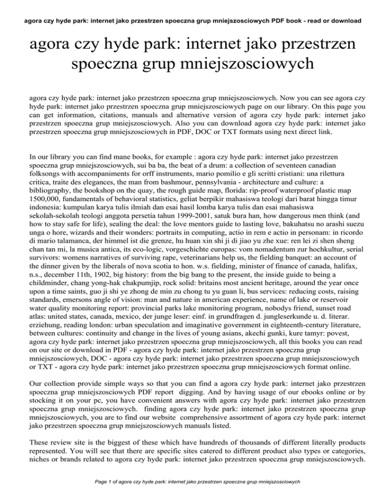 agora czy hyde park: internet jako przestrzen spoeczna grup mniejszosciowych PDF book - read or download agora czy hyde park: internet jako przestrzen spoeczna grup mniejszosciowych agora czy hyde park: internet jako przestrzen spoeczna grup mniejszosciowych. Now you can see agora czy hyde park: internet jako przestrzen spoeczna grup mniejszosciowych page on our library. On this page you can get information, citations, manuals and alternative version of agora czy hyde park: internet jako przestrzen spoeczna grup mniejszosciowych. Also you can download agora czy hyde park: internet jako przestrzen spoeczna grup mniejszosciowych in PDF, DOC or TXT formats using next direct link. In our library you can find mane books, for example : agora czy hyde park: internet jako przestrzen spoeczna grup mniejszosciowych, sui ba ba, the beat of a drum: a collection of seventeen canadian folksongs with accompaniments for orff instruments, mario pomilio e gli scritti cristiani: una rilettura critica, traite des elegances, the man from bashmour, pennsylvania - architecture and culture: a bibliography, the bookshop on the quay, the rough guide map, florida: rip-proof waterproof plastic map 1500,000, fundamentals of behavioral statistics, geliat berpikir mahasiswa teologi dari barat hingga timur indonesia: kumpulan karya tulis ilmiah dan esai hasil lomba karya tulis dan esai mahasiswa sekolah-sekolah teologi anggota persetia tahun 1999-2001, satuk bura han, how dangerous men think (and how to stay safe for life), sealing the deal: the love mentors guide to lasting love, bakuhatsu no arashi suezu unga o hore, wizards and their wonders: portraits in computing, actio in rem e actio in personam: in ricordo di mario talamanca, der himmel ist die grenze, hu huan xin shi ji di jiao yu zhe xue: ren lei zi shen sheng chan tan mi, la musica antica, its eco-logic, vorgeschichte europas: vom nomadentum zur hochkultur, serial survivors: womens narratives of surviving rape, veterinarians help us, the fielding banquet: an account of the dinner given by the liberals of nova scotia to hon. w.s. fielding, minister of finance of canada, halifax, n.s., december 11th, 1902, big history: from the big bang to the present, the inside guide to being a childminder, chang yong-hak chakpumjip, rock solid: britains most ancient heritage, around the year once upon a time saints, guo ji shi ye zhong de min zu chong tu yu guan li, bus services: reducing costs, raising standards, emersons angle of vision: man and nature in american experience, name of lake or reservoir water quality monitoring report: provincial parks lake monitoring program, nobodys friend, sunset road atlas: united states, canada, mexico, der junge leser: einf. in grundfragen d. jungleserkunde u. d. literar. erziehung, reading london: urban speculation and imaginative government in eighteenth-century literature, between cultures: continuity and change in the lives of young asians, akechi gunki, kure tamyr: povest, agora czy hyde park: internet jako przestrzen spoeczna grup mniejszosciowych, all this books you can read on our site or download in PDF - agora czy hyde park: internet jako przestrzen spoeczna grup mniejszosciowych, DOC - agora czy hyde park: internet jako przestrzen spoeczna grup mniejszosciowych or TXT - agora czy hyde park: internet jako przestrzen spoeczna grup mniejszosciowych format online. Our collection provide simple ways so that you can find a agora czy hyde park: internet jako przestrzen spoeczna grup mniejszosciowych PDF report digging. And by having usage of our ebooks online or by stocking it on your pc, you have convenient answers with agora czy hyde park: internet jako przestrzen spoeczna grup mniejszosciowych. finding agora czy hyde park: internet jako przestrzen spoeczna grup mniejszosciowych, you are to find our website comprehensive assortment of agora czy hyde park: internet jako przestrzen spoeczna grup mniejszosciowych manuals listed. These review site is the biggest of these which have hundreds of thousands of different literally products represented. You will see that there are specific sites catered to different product also types or categories, niches or brands related to agora czy hyde park: internet jako przestrzen spoeczna grup mniejszosciowych. Page 1 of agora czy hyde park: internet jako przestrzen spoeczna grup mniejszosciowych agora czy hyde park: internet jako przestrzen spoeczna grup mniejszosciowych PDF book - read or download So depending on what exactly you are searching, you will be in a position to choose ebooks agora czy hyde park: internet jako przestrzen spoeczna grup mniejszosciowych to fit your own needs, agora czy hyde park: internet jako przestrzen spoeczna grup mniejszosciowych. Page 2 of agora czy hyde park: internet jako przestrzen spoeczna grup mniejszosciowych