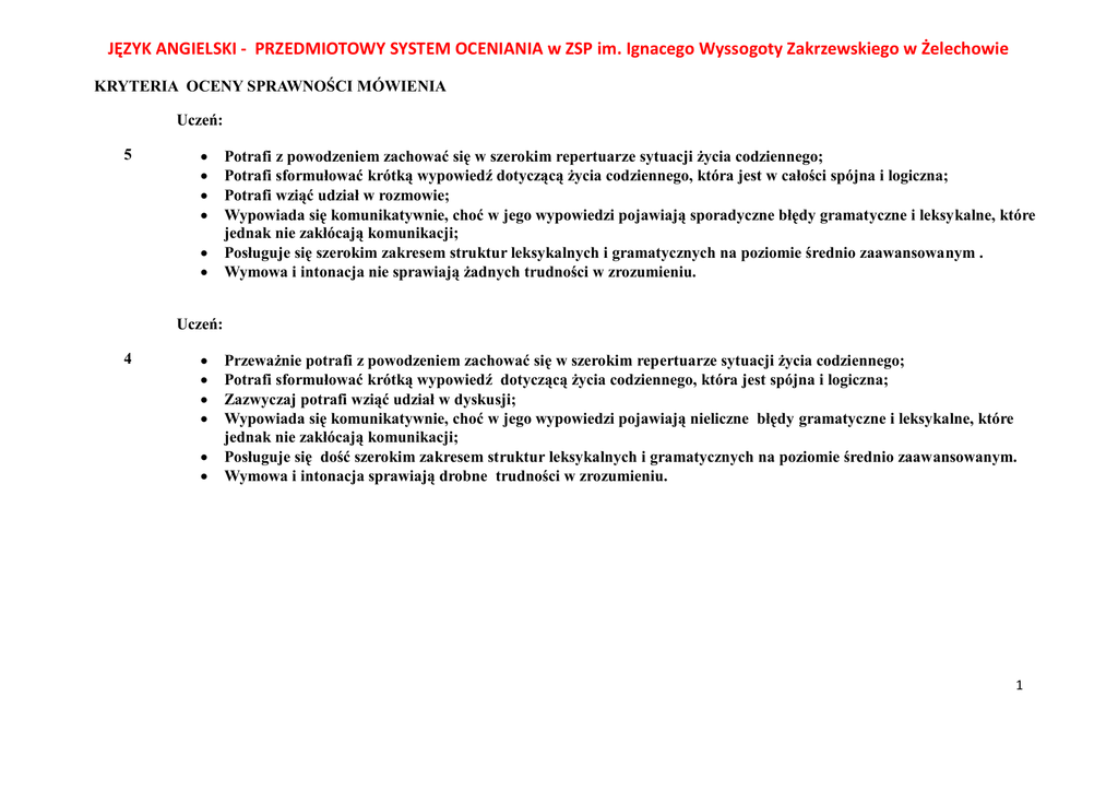 JĘZYK ANGIELSKI - PRZEDMIOTOWY SYSTEM OCENIANIA w ZSP im. Ignacego Wyssogoty Zakrzewskiego w Żelechowie KRYTERIA OCENY SPRAWNOŚCI MÓWIENIA Uczeń: 5 Potrafi z powodzeniem zachować się w szerokim repertuarze sytuacji życia codziennego; Potrafi sformułować krótką wypowiedź dotyczącą życia codziennego, która jest w całości spójna i logiczna; Potrafi wziąć udział w rozmowie; Wypowiada się komunikatywnie, choć w jego wypowiedzi pojawiają sporadyczne błędy gramatyczne i leksykalne, które jednak nie zakłócają komunikacji; Posługuje się szerokim zakresem struktur leksykalnych i gramatycznych na poziomie średnio zaawansowanym . Wymowa i intonacja nie sprawiają żadnych trudności w zrozumieniu. Uczeń: 4 Przeważnie potrafi z powodzeniem zachować się w szerokim repertuarze sytuacji życia codziennego; Potrafi sformułować krótką wypowiedź dotyczącą życia codziennego, która jest spójna i logiczna; Zazwyczaj potrafi wziąć udział w dyskusji; Wypowiada się komunikatywnie, choć w jego wypowiedzi pojawiają nieliczne błędy gramatyczne i leksykalne, które jednak nie zakłócają komunikacji; Posługuje się dość szerokim zakresem struktur leksykalnych i gramatycznych na poziomie średnio zaawansowanym. Wymowa i intonacja sprawiają drobne trudności w zrozumieniu. 1 Uczeń: 3 Czasem potrafi z powodzeniem zachować się w podstawowych sytuacjach życia codziennego; Próbuje sformułować krótką wypowiedź , ale bywa ona niespójną lub nie logiczna; Próbuje czasem wziąć udział w rozmowie; Próbuje wypowiadać się, ale w jego wypowiedzi pojawiają liczne błędy gramatyczne i leksykalne, które częściowo zakłócają komunikację; Posługuje się dość wąskim zakresem struktur leksykalnych i gramatycznych na poziomie średnio zaawansowanym. Wymowa i intonacja czasami sprawiają trudności w zrozumieniu. Uczeń: 2 Z trudem potrafi zachować się w podstawowych sytuacjach życia codziennego; Próbuje sformułować krótką wypowiedź , ale przeważnie jest ona niespójna i nie- logiczna; Rzadko próbuje wziąć udział w rozmowie; Próbuje wypowiadać się, ale popełnia bardzo liczne błędy gramatyczne i leksykalne, które znacznie zakłócają komunikację; Posługuje się bardzo wąskim zakresem struktur leksykalnych i gramatycznych na poziomie średnio zaawansowanym. Wymowa i intonacja ucznia często sprawiają trudności w zrozumieniu. 1 Uczeń jest niezrozumiały, nie wypowiada się albo odpowiada całkowicie nie na temat. 2 KRYTERIA OCENY SPRAWNOŚCI PISANIA Uczeń: 5 Potrafi napisać spójny, w pełni zrozumiały, zgodny z tematem tekst użytkowy z całkowitym zachowanie wymogów danej formy; Stosuje szeroki zakres struktur gramatycznych i leksykalnych na poziomie średnio zaawansowanym; Wypowiada się komunikatywnie, choć w jego wypowiedzi pojawiają się sporadyczne błędy gramatyczno-leksykalne, ortograficzne i interpunkcyjne, które jednak nie zakłócają komunikacji; Potrafi dostosować styl i rejestr do założonej formy; Zachowuje właściwą formę graficzną; Pisze teksty mieszczące się w granicach określonych w poleceniu. Uczeń: 4 Uczeń: 3 Potrafi napisać spójny, zrozumiały, zgodny z tematem tekst użytkowy z zachowaniem wymogów danej formy; Stosuje dość szeroki zakres struktur gramatycznych i leksykalnych na poziomie średnio zaawansowanym; Wypowiada się komunikatywnie, choć w jego wypowiedzi pojawiają się nieliczne błędy gramatyczno-leksykalne i dość liczne błędy interpunkcyjne i ortograficzne; Przeważnie potrafi dostosować styl i rejestr do założonej formy; Przeważnie zachowuje właściwą formę graficzną; Pisze teksty przekraczające granice określone w poleceniu do +/- 10%. Potrafi napisać w większości zrozumiały tekst użytkowy, lecz czasem brak w nim logicznej ciągłości i nie zachowuje on założonej formy; może nieznacznie odbiegać od tematu; Stosuje dość wąski zakres struktur gramatycznych i leksykalnych na poziomie średnio zaawansowanym; Próbuje wypowiadać się, ale w jego wypowiedzi pojawiają się liczne błędy gramatyczno-leksykalne, ortograficzne i interpunkcyjne, które częściowo zakłócają komunikację; Czasem potrafi dostosować styl i rejestr do założonej formy; Czasem nie zachowuje właściwej formy graficznej; Pisze teksty przekraczające granice określone w poleceniu do +/- 20%. 3 Uczeń: 2 1 Potrafi napisać tekst użytkowy, lecz najczęściej brak w nim logicznej spójności i nie zachowuje on założonej formy, znacznie odbiegać od tematu i jest trudny do zrozumienia; Stosuje bardzo wąski zakres struktur gramatycznych i leksykalnych na poziomie średnio zaawansowanym; Próbuje wypowiadać się, ale w jego wypowiedzi pojawiają się bardzo liczne błędy , które znacznie zakłócają komunikację; Rzadko udaje mu się dostosować styl i rejestr do założonej formy; Rzadko udaje mu się zachować właściwą formę graficzną; Pisze teksty przekraczające granice określone w poleceniu o ponad +/- 20%. Tekst jest nie na temat, brak tekstu albo błędy uniemożliwiają komunikację. *Ocenę niedostateczną bez możliwości poprawy otrzymuje również uczeń, który oddaje do sprawdzenia pracę niesamodzielną, napisaną przez inną osobę lub skopiowaną z Internetu. Ocenę celującą otrzymuje uczeń, który: - opanował materiał przewidziany w programie nauczania i wykazany w rejestrze wymagań dla danego poziomu nauczania na ocenę bardzo dobrą. Jego wiadomości i umiejętności językowe znacznie wykraczają poza program nauczania - jest w stanie porozumieć się wymieniając informację i wydarzenia, dysponując bardzo szerokim repertuarem środków językowych i strategii komunikacyjnych umożliwiających mu bardzo dobre radzenie sobie w przewidzianych sytuacjach codziennych, a także nietypowych. Umie bardzo dobrze dostosować styl swojej wypowiedzi do sytuacji odbiorcy. Zakres używanego słownictwa znacznie wykracza poza przewidywany