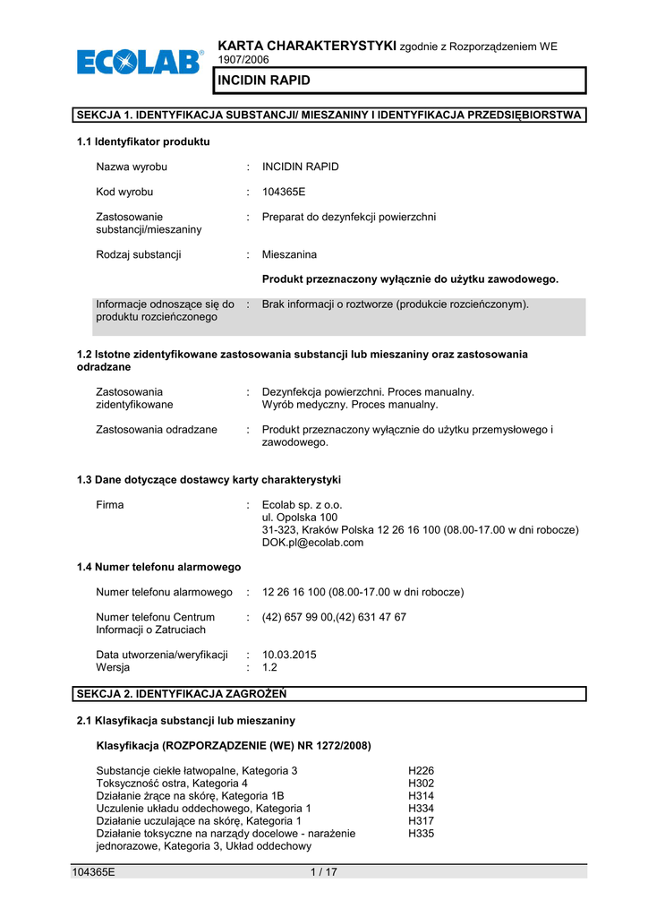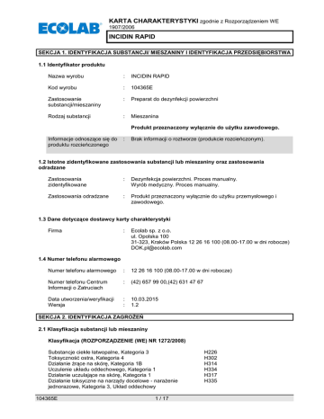 KARTA CHARAKTERYSTYKI zgodnie z Rozporządzeniem WE 1907/2006 INCIDIN RAPID SEKCJA 1. IDENTYFIKACJA SUBSTANCJI/ MIESZANINY I IDENTYFIKACJA PRZEDSIĘBIORSTWA 1.1 Identyfikator produktu Nazwa wyrobu : INCIDIN RAPID Kod wyrobu : 104365E Zastosowanie substancji/mieszaniny : Preparat do dezynfekcji powierzchni Rodzaj substancji : Mieszanina Produkt przeznaczony wyłącznie do użytku zawodowego. Informacje odnoszące się do produktu rozcieńczonego : Brak informacji o roztworze (produkcie rozcieńczonym). 1.2 Istotne zidentyfikowane zastosowania substancji lub mieszaniny oraz zastosowania odradzane Zastosowania zidentyfikowane : Dezynfekcja powierzchni. Proces manualny. Wyrób medyczny. Proces manualny. Zastosowania odradzane : Produkt przeznaczony wyłącznie do użytku przemysłowego i zawodowego. 1.3 Dane dotyczące dostawcy karty charakterystyki Firma : Ecolab sp. z o.o. ul. Opolska 100 31-323, Kraków Polska 12 26 16 100 (08.00-17.00 w dni robocze) [email protected] Numer telefonu alarmowego : 12 26 16 100 (08.00-17.00 w dni robocze) Numer telefonu Centrum Informacji o Zatruciach : (42) 657 99 00,(42) 631 47 67 Data utworzenia/weryfikacji Wersja : : 10.03.2015 1.2 1.4 Numer telefonu alarmowego SEKCJA 2. IDENTYFIKACJA ZAGROŻEŃ 2.1 Klasyfikacja substancji lub mieszaniny Klasyfikacja (ROZPORZĄDZENIE (WE) NR 1272/2008) Substancje ciekłe łatwopalne, Kategoria 3 Toksyczność ostra, Kategoria 4 Działanie żrące na skórę, Kategoria 1B Uczulenie układu oddechowego, Kategoria 1 Działanie uczulające na skórę, Kategoria 1 Działanie toksyczne na narządy docelowe - narażenie jednorazowe, Kategoria 3, Układ oddechowy 104365E 1 / 17 H226 H302 H314 H334 H317 H335 KARTA CHARAKTERYSTYKI zgodnie z Rozporządzeniem WE 1907/2006 INCIDIN RAPID Toksyczność ostrą dla środowiska wodnego, Kategoria 1 H400 Klasyfikacja (67/548/EWG, 1999/45/WE) C; PRODUKT ŻRĄCY N; NIEBEZPIECZNY DLA SRODOWISKA R20/22 R34 R37 R42/43 R50 Pełen tekst zwrotów R zawartych w tej sekcji umieszczono w sekcji 16. Pełny tekst zwrotów H przytoczonych w tej Sekcji znajduje się w Sekcji 16. 2.2 Elementy oznakowania Oznakowanie (ROZPORZĄDZENIE (WE) NR 1272/2008) Piktogramy określające rodzaj zagrożenia : Hasła ostrzegawcze : Niebezpieczeństwo Zwroty określające zagrożenia : H226 H302 H314 Łatwopalna ciecz i pary. Działa szkodliwie po połknięciu. Powoduje poważne oparzenia skóry oraz uszkodzenia oczu. Może powodować reakcję alergiczną skóry. Może powodować objawy alergii lub astmy lub trudności w oddychaniu w następstwie wdychania. Może powodować podrażnienie dróg oddechowych. Działa bardzo toksycznie na organizmy wodne. H317 H334 H335 H400 Zwroty określające środki ostrożności : Zapobieganie: P210 P273 P280 P285 Przechowywać z dala od źródeł ciepła/ iskrzenia/otwartego ognia/gorących powierzchni. Palenie wzbronione. Unikać uwolnienia do środowiska. Stosować rękawice ochronne/ ochronę oczu/ ochronę twarzy. W przypadku niedostatecznej wentylacji stosować indywidualne środki ochrony dróg oddechowych. Reagowanie: P303 + P361 + P353 W PRZYPADKU KONTATKU ZE SKÓRĄ (lub z włosami): Natychmiast usunąć/ zdjąć całą zanieczyszczoną odzież. Spłukać skórę pod strumieniem wody/ prysznicem. P304 + P341 W PRZYPADKU DOSTANIA SIĘ DO DRÓG ODDECHOWYCH: W przypadku trudności z oddychaniem, wyprowadzić lub wynieść poszkodowanego na świeże powietrze i zapewnić warunki do odpoczynku w pozycji umożliwiającej swobodne oddychanie. P305 + P351 + P338 W PRZYPADKU DOSTANIA SIĘ DO 104365E 2 / 17 KARTA CHARAKTERYSTYKI zgodnie z Rozporządzeniem WE 1907/2006 INCIDIN RAPID OCZU: Ostrożnie płukać wodą przez kilka minut. Wyjąć soczewki kontaktowe, jeżeli są i można je łatwo usunąć. Nadal płukać. Natychmiast skontaktować się z OŚRODKIEM ZATRUĆ lub z lekarzem. P310 Niebezpieczne składniki muszą być wymienione na etykiecie: glutaraldehyde Chlorek benzalkoniowy chlorek didecylodimetyloamonium 2.3 Inne zagrożenia Nieznane. SEKCJA 3. SKŁAD/ INFORMACJA O SKŁADNIKACH 3.2 Mieszaniny Składniki niebezpieczne Nazwa Chemiczna Klasyfikacja (ROZPORZĄDZENIE (WE) NR 1272/2008) F-Xi; R11-R36- Substancje ciekłe łatwopalne R67 Kategoria 2; H225 Działanie drażniące na oczy Kategoria 2; H319 Działanie toksyczne na narządy docelowe - narażenie jednorazowe Kategoria 3; H336 glutaraldehyde 111-30-8 203-856-5 01-2119455549-26 C-N-T; R23/25R34-R42/43R50 Toksyczność ostra Kategoria 3; H301 Toksyczność ostra Kategoria 3; H331 Działanie żrące na skórę Kategoria 1B; H314 Uczulenie układu oddechowego Kategoria 1; H334 Działanie uczulające na skórę Kategoria 1; H317 Toksyczność ostrą dla środowiska wodnego Kategoria 1; H400 >= 5 - < 10 Chlorek benzalkoniowy 68424-85-1 270-325-2 Xn-C-N; R22R34-R50 Toksyczność ostra Kategoria 4; H302 Działanie żrące na skórę Kategoria 1B; H314 Poważne uszkodzenie oczu Kategoria 1; H318 Toksyczność ostrą dla środowiska wodnego Kategoria 1; H400 >= 5 - < 10 chlorek didecylodimetyloamo nium 7173-51-5 230-525-2 C; R22-R34 Toksyczność ostra Kategoria 4; H302 Działanie żrące na skórę >= 5 - < 10 Propan-2-ol 104365E Klasyfikacja (67/548/EWG) Stężenie: [%] Nr CAS Nr WE Nr REACH 67-63-0 200-661-7 01-2119457558-25 3 / 17 >= 10 - < 15 KARTA CHARAKTERYSTYKI zgodnie z Rozporządzeniem WE 1907/2006 INCIDIN RAPID Kategoria 1B; H314 Poliglikozyd C8-10 68515-73-1 500-220-1 01-2119488530-36 Xi; R38-R41 Drażniące na skórę Kategoria 2; H315 Poważne uszkodzenie oczu Kategoria 1; H318 >= 1 - < 2.5 Alkilopoliglikozydy 110615-47-9 01-2119489418-23 Xi; R38-R41 Drażniące na skórę Kategoria 2; H315 Poważne uszkodzenie oczu Kategoria 1; H318 >= 1 - < 2.5 Pełen tekst zwrotów R zawartych w tej sekcji umieszczono w sekcji 16. Pełny tekst zwrotów H przytoczonych w tej Sekcji znajduje się w Sekcji 16. SEKCJA 4. ŚRODKI PIERWSZEJ POMOCY 4.1 Opis środków pierwszej pomocy W przypadku kontaktu z oczami : Spłukać niezwłocznie