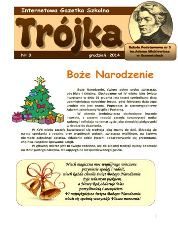 Nr 3 grudzień 2014 Boże Narodzenie Boże Narodzenie, święto pełne uroku zwłaszcza, gdy białe i śnieżne. Obchodzone od IV wieku jako święto liturgiczne w dniu 25 grudnia jest raczej symboliczną datą upamiętniającą narodziny Jezusa, gdyż faktyczna data Jego urodzin nie jest znana. Poprzedza je czterotygodniowy Adwent zakończony Wigilią i Pasterką. W okresie średniowiecza obchodzone hucznie i wesoło, z czasem radości zaczęła towarzyszyć nutka zadumy i refleksja na temat życia jako ziemskiej pielgrzymki w drodze do zbawienia. W XVII wieku zaczęła kształtować się tradycja jaką znamy do dziś. Składają się na nią spotkania z rodziną przy wspólnych stołach, zwłaszcza wigilijnym, na którym nie może zabraknąć opłatka, składanie sobie życzeń, obdarowywanie się prezentami, choinka i wspólne śpiewanie kolęd. W głównej mierze jest to święto rodzinne, ale do pięknej tradycji należy obecność na stole pustego nakrycia, czekającego na niespodziewanego gościa. Niech magiczna moc wigilijnego wieczoru przyniesie spokój i radość, niech każda chwila świąt Bożego Narodzenia żyje własnym pięknem, a Nowy Rok obdaruje Was pomyślnością i szczęściem. W najpiękniejsze święta Bożego Narodzenia niech się spełnią wszystkie Wasze marzenia! 1 Trójka Internetowa Gazetka Szkolna nr 3 grudzień 2014 Nieodłączną częścią wieczoru wigilijnego było i jest wspólne przy Bożonarodzeniowej szopce. Pieśni opowiadających o narodzeniu Jezusa mamy w polskiej tradycji bardzo dużo. Najstarsze sięgają czasów średniowiecza. Ich wprowadzenie a potem upowszechnienie zawdzięczamy prawdopodobnie franciszkanom. Oni też przynieśli do Polski zwyczaj budowy szopek. Autorstwo pierwszej szopki przypisuje się św. Franciszkowi z Asyżu, który chcąc odświeżyć pamięć narodzin Dzieciątka Jezus kazał przynieść do groty siana, przyprowadzić woła oraz osła i zawołał braci. Kiedy zgromadziła się ludność z okolic i zabrzmiały pieśni św. Franciszek odczytał Ewangelię, a potem wygłosił kazanie o narodzeniu Jezusa. Szopkę tę zorganizował św. Franciszek na trzy lata przed śmiercią, w Greccio koło Rieti, sto kilometrów od Rzymu. W Polsce franciszkańskiej pojawiły się bardzo wcześnie, zapewne już w czasach średniowiecza. Początkowo inscenizowane w kościołach szopki były niezwykle proste, pozostawały też wierne przekazom ewangelicznym. W wieku XIX powstały różne regionalne formy polskich szopek bożonarodzeniowych. Najbardziej znane i najciekawsze są szopki krakowskie, których architekturę wzoruje się na zabytkowych budowlach Krakowa. Szopki krakowskie stawały się często teatrzykami lalek, w których na miniaturowych scenkach podświetlanych świecami pojawiały się najrozmaitsze ruchome figurki. Dzisiaj bożonarodzeniowe szopki buduje się we wszystkich polskich kościołach. 2 Trójka Internetowa Gazetka Szkolna nr 3 grudzień 2014 „Magiczne drzewo i tajemnica mostu’ Andrzeja Maleszki (jedna z książek cyklu) Na początku książka wydaje się nudna. Jednak z każdą następną stroną jest coraz ciekawsza. W pewnym momencie trzeba stwierdzić, że po prostu czyta się do końca. Wenecja zalana coca-colą … Dziewczyna reklamująca żelki żu…. Bobi - Robi… A przede wszystkim czerwone krzesło… Tytuł ‘’Magiczne Drzewo’’ ma mnóstwo wspólnego z książką, która jest magiczna! Zachęcam do jej przeczytania. „Magiczne Drzewo - Tajemnica Mostu’’ to książka, którą można dać w prezencie. SS Na święta polecamy do przeczytania „Opowieść wigilijną” Karola Dickensa. Być może skłoni Was do przemyśleń. Jest dostępna w naszej bibliotece. R Marzenia się spełniają! Czy wierzycie w to, że marzenia się spełniają? Czasami warto! W październikowym numerze gazetki umieściliśmy list Sandry Sękowskiej do Pani Dyrektor. Teraz informujemy, że na parterze przy sklepiku i w świetlicy można korzystać bez ograniczeń z dozowników wody! Wystarczy…. własny kubek. 3 Trójka Internetowa Gazetka Szkolna nr 3 grudzień 2014 SS Jak uczyć się szybko i skutecznie? Szybka nauka – Czym są i jak działają techniki pamięciowe (mnemotechniki)? Czy Ty również zadajesz sobie to intrygujące pytanie, jak szybko się uczyć? My odnaleźliśmy wspaniałe techniki pamięciowe, które zupełnie odmieniły nasze podejście do nauki Przedstawimy Ci klucz do tego, jak szybko się uczyć, czyli techniki pamięciowe. Na początek troszkę wprowadzenia, które pomoże Ci zrozumieć wartość tych technik. Mnemotechniki – Historia kołem się toczy! Dawno temu w starożytnej Grecji, żyli ludzie, których szczególnie ceniono. Potrafili bowiem zadziwiać ludzkość swoją niezwykłą, tajemniczą mocą – nieograniczoną pamięcią. Były to osoby, które obejmowały kluczowe stanowiska w państwie, poeci, sławni mówcy. Czym są i jak powstały mnemotechniki? Mnemotechniki, mnemoniki, czy techniki pamięciowe to ogólna nazwa sposobów ułatwiających zapamiętanie, przechowywanie i przypominanie sobie informacji. Dzięki technikom pamięciowym, można w niezwykle szybki i łatwy sposób zwiększyć zakres i trwałość pamięci. Wyraz „mnemotechnika” pochodzi od greckiego słowa: mneme – pamięć, oraz greckiej bogini pamięci – Mnemozyny. Za twórcę technik pamięciowych, uchodzi Simonides z greckiej wyspy Keos. W Grecji po raz pierwszy zauważono, że istnieją pewne szczególne prawa pamięci. Dzięki nim, można o wiele szybciej zapamiętać dowolną informację. Szybka nauka - Klucz do zapamiętywania. Najważniejszym elementem szybkiego uczenia się z niezwykłą skutecznością jest tworzenie obrazów i kojarzenie ich z tym, co już wiesz. Chodzi o umiejętność tworzenia niezwykłych skojarzeń, niecodziennych, śmiesznych, abstrakcyjnych, dynamicznych, absurdalnych, a nawet głupich. 4 Trójka Internetowa Gazetka Szkolna nr 3 grudzień 2014 Porównaj dwie