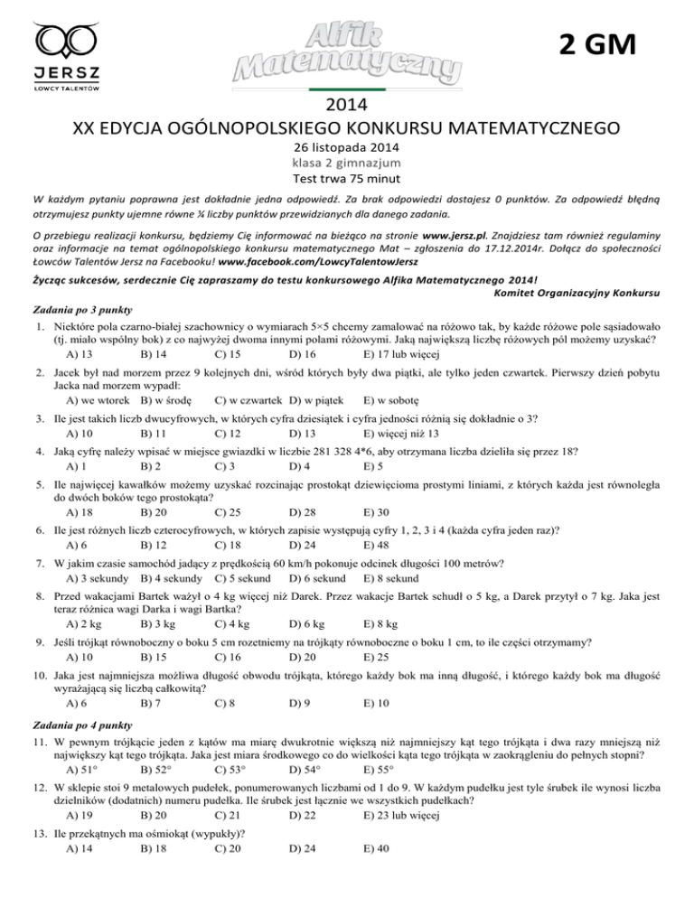 2 GM 2014 XX EDYCJA OGÓLNOPOLSKIEGO KONKURSU MATEMATYCZNEGO 26 listopada 2014 klasa 2 gimnazjum Test trwa 75 minut W każdym pytaniu poprawna jest dokładnie jedna odpowiedź. Za brak odpowiedzi dostajesz 0 punktów. Za odpowiedź błędną otrzymujesz punkty ujemne równe ¼ liczby punktów przewidzianych dla danego zadania. O przebiegu realizacji konkursu, będziemy Cię informować na bieżąco na stronie www.jersz.pl. Znajdziesz tam również regulaminy oraz informacje na temat ogólnopolskiego konkursu matematycznego Mat – zgłoszenia do 17.12.2014r. Dołącz do społeczności Łowców Talentów Jersz na Facebooku! www.facebook.com/LowcyTalentowJersz Życząc sukcesów, serdecznie Cię zapraszamy do testu konkursowego Alfika Matematycznego 2014! Komitet Organizacyjny Konkursu Zadania po 3 punkty 1. Niektóre pola czarno-białej szachownicy o wymiarach 5×5 chcemy zamalować na różowo tak, by każde różowe pole sąsiadowało (tj. miało wspólny bok) z co najwyżej dwoma innymi polami różowymi. Jaką największą liczbę różowych pól możemy uzyskać? A) 13 B) 14 C) 15 D) 16 E) 17 lub więcej 2. Jacek był nad morzem przez 9 kolejnych dni, wśród których były dwa piątki, ale tylko jeden czwartek. Pierwszy dzień pobytu Jacka nad morzem wypadł: A) we wtorek B) w środę C) w czwartek D) w piątek E) w sobotę 3. Ile jest takich liczb dwucyfrowych, w których cyfra dziesiątek i cyfra jedności różnią się dokładnie o 3? A) 10 B) 11 C) 12 D) 13 E) więcej niż 13 4. Jaką cyfrę należy wpisać w miejsce gwiazdki w liczbie 281 328 4*6, aby otrzymana liczba dzieliła się przez 18? A) 1 B) 2 C) 3 D) 4 E) 5 5. Ile najwięcej kawałków możemy uzyskać rozcinając prostokąt dziewięcioma prostymi liniami, z których każda jest równoległa do dwóch boków tego prostokąta? A) 18 B) 20 C) 25 D) 28 E) 30 6. Ile jest różnych liczb czterocyfrowych, w których zapisie występują cyfry 1, 2, 3 i 4 (każda cyfra jeden raz)? A) 6 B) 12 C) 18 D) 24 E) 48 7. W jakim czasie samochód jadący z prędkością 60 km/h pokonuje odcinek długości 100 metrów? A) 3 sekundy B) 4 sekundy C) 5 sekund D) 6 sekund E) 8 sekund 8. Przed wakacjami Bartek ważył o 4 kg więcej niż Darek. Przez wakacje Bartek schudł o 5 kg, a Darek przytył o 7 kg. Jaka jest teraz różnica wagi Darka i wagi Bartka? A) 2 kg B) 3 kg C) 4 kg D) 6 kg E) 8 kg 9. Jeśli trójkąt równoboczny o boku 5 cm rozetniemy na trójkąty równoboczne o boku 1 cm, to ile części otrzymamy? A) 10 B) 15 C) 16 D) 20 E) 25 10. Jaka jest najmniejsza możliwa długość obwodu trójkąta, którego każdy bok ma inną długość, i którego każdy bok ma długość wyrażającą się liczbą całkowitą? A) 6 B) 7 C) 8 D) 9 E) 10 Zadania po 4 punkty 11. W pewnym trójkącie jeden z kątów ma miarę dwukrotnie większą niż najmniejszy kąt tego trójkąta i dwa razy mniejszą niż największy kąt tego trójkąta. Jaka jest miara środkowego co do wielkości kąta tego trójkąta w zaokrągleniu do pełnych stopni? A) 51° B) 52° C) 53° D) 54° E) 55° 12. W sklepie stoi 9 metalowych pudełek, ponumerowanych liczbami od 1 do 9. W każdym pudełku jest tyle śrubek ile wynosi liczba dzielników (dodatnich) numeru pudełka. Ile śrubek jest łącznie we wszystkich pudełkach? A) 19 B) 20 C) 21 D) 22 E) 23 lub więcej 13. Ile przekątnych ma ośmiokąt (wypukły)? A) 14 B) 18 C) 20 D) 24 E) 40 14. Zarówno wiersze jak i kolumny szachownicy o wymiarach 4×4 numerujemy liczbami od 1 do 4. Następnie na każdym polu kładziemy tyle ziaren ryżu ile wynosi suma numeru wiersza i numeru kolumny, w których to pole się znajduje. Ile ziaren ryżu ułożymy łącznie na całej szachownicy? A) 60 B) 70 C) 80 D) 90 E) inna odpowiedź 15. Pewien człowiek zmarł w dniu swoich urodzin, i zarówno numer roku jego urodzenia jak i numer roku jego śmierci był kwadratem liczby naturalnej. Ile lat przeżył, jeśli wiemy, że zmarł w XX wieku? A) 76 B) 81 C) 85 D) 87 E) 88 16. W każdym wierzchołku kwadratu wpisano pewną liczbę, a na każdym boku kwadratu zapisano sumę liczb z obu jego końców. Liczby wpisane na bokach kwadratu to cztery z niżej wymienionych liczb. Która liczba nie znalazła się na żadnym boku? A) 15 B) 23 C) 17 D) 25 E) 20 17. Początkowo na stole jest jeden kawałek papieru. Jacek wielokrotnie wykonuje następującą czynność: bierze jeden z kawałków papieru leżących na stole, drze go na cztery kawałki i otrzymane kawałki odkłada z powrotem na stół. Ile razy Jacek musi wykonać tę czynność, aby na stole znalazło się równo sto kawałków papieru? A) 30 B) 31 C) 32 D) 33 E) 34 18. Od 1 stycznia cena książki wzrosła o 50%, natomiast od 1 lutego cena ta wróciła do poziomu z grudnia. O ile procent (w przybliżeniu) obniżono cenę w lutym? A) 25% B) 30% C) 33% D) 35% E) 50% 19. Ile najwięcej kątów prostych może być pośród kątów wewnętrznych pewnego sześciokąta? A) 2 B) 3 C) 4 D) 5 E) 6 20. Jeśli szachownicę o wymiarach 6×6 rozetniemy na prostokąty o wymiarach 3×1 (nie rozcinając żadnego pola), to ile spośród uzyskanych części będzie zawierało więcej pól białych niż czarnych? A) 5 B) 6 C) 7 D) 8 E) zależy od sposobu rozcięcia szachownicy Zadania po 5 punktów 21. Jacek wyjeżdża w góry w każdą piątą sobotę miesiąca. Ile najwięcej razy w ciągu roku może wyjechać? A) 2 B) 3 C) 4 D) 5 E) 6 22. W jakim stosunku dzieli pole kwadratu odcinek łączący środek jego boku z jego wierzchołkiem nie należącym do tego boku? A) 1 : 3 B) 1 : 4 C) 1 : 7 D) 1 : 8 E) 1 : 2 23. Ala ma w swojej portmonetce kilkanaście monet – same 2-złotówki i 5-złotówki. Pewnej nocy dobra wróżka zamieniła nominały na wszystkich monetach Ali – 2-złotówki stały się 5-złotówkami, a 5-złotówki stały się 2-złotówkami. Ala szybko policzyła, że jest teraz dokładnie dwa razy bogatsza niż przed zaśnięciem. Ile monet ma Ala? A) 12 B) 14 C) 16 D) 18 E) 19 24. W