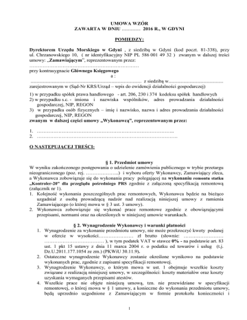 UMOWA WZÓR ZAWARTA W DNIU ............... 2016 R., W GDYNI POMIĘDZY: Dyrektorem Urzędu Morskiego w Gdyni , z siedzibą w Gdyni (kod poczt. 81-338), przy ul. Chrzanowskiego 10, ( nr identyfikacyjny NIP PL 586 001 49 32 ) zwanym w dalszej treści umowy: „Zamawiającym”, reprezentowanym przez: ………………………………………………………… przy kontrasygnacie Głównego Księgowego a: ......................................................................................... z siedzibą w............................................ zarejestrowanym w (Sąd-Nr KRS/Urząd – wpis do ewidencji działalności gospodarczej) 1) w przypadku spółek prawa handlowego - art. 206, 230 i 374 kodeksu spółek handlowych 2) w przypadku s.c. - imiona i nazwiska wspólników, adres prowadzania działalności gospodarczej, NIP, REGON 3) w przypadku osób fizycznych – imię i nazwisko, nazwa i adres prowadzania działalności gospodarczej, NIP, REGON zwanym w dalszej części umowy „Wykonawcą”, reprezentowanym przez: 1. ……………………………………………………………………….. 2. …………………………………………………………………………. O NASTĘPUJĄCEJ TREŚCI: § 1. Przedmiot umowy W wyniku zakończonego postępowania o udzielenie zamówienia publicznego w trybie przetargu nieograniczonego (poz. rej. ………………..) i wyboru oferty Wykonawcy, Zamawiający zleca, a Wykonawca zobowiązuje się do wykonania pracy polegającej na wykonaniu remontu statku „Kontroler-20” dla przeglądu pośredniego PRS zgodnie z załączoną specyfikacją remontową (załącznik nr 1). 1. Kolejność wykonania poszczególnych prac remontowych, Wykonawca będzie na bieżąco uzgadniał z osobą prowadzącą nadzór nad realizacją niniejszej umowy z ramienia Zamawiającego (o której mowa w § 3 ust. 3 umowy). 2. Wykonawca zobowiązuje się wykonać prace remontowe zgodnie z obowiązującymi przepisami, normami oraz na określonych w niniejszej umowie warunkach. § 2. Wynagrodzenie Wykonawcy i warunki płatności 1. Wynagrodzenie za wykonanie przedmiotu umowy, nie może przekroczyć kwoty podanej w ofercie w wysokości………………… zł brutto (słownie: …………………… ……………………………… ), w tym podatek VAT w stawce 0% - na podstawie art. 83 ust. 1 pkt 15 ustawy z dnia 11 marca 2004 r. o podatku od towarów i usług (t.j. Dz.U.2011.177.1054 ze zm.) (PKWiU 30.11.9). 2. Ostateczne wynagrodzenie Wykonawcy zostanie określone wynikowo na podstawie wykonanych prac, zgodnie z zapisami specyfikacji remontowej. 3. Wynagrodzenie Wykonawcy, o którym mowa w ust. 1 obejmuje wszelkie koszty związane z realizacją niniejszej umowy, w szczególności: koszty materiałów oraz koszty uzyskania wymaganych przepisami atestów. 4. Wszelkie prace nie objęte niniejszą umową, tzn. nie przewidziane w specyfikacji remontowej, o której mowa w § 1 umowy, a konieczne do wykonania przedmiotu umowy, będą uprzednio uzgodnione z Zamawiającym w formie protokołu konieczności i 1 zrealizowane na zasadach przewidzianych w ustawie z dnia 29.01.2004 r. Prawo zamówień publicznych (Dz. U z 2015 r., poz. 2164 ) 5. Rozliczenie nastąpi na podstawie kosztorysu powykonawczego, sporządzonego przez Wykonawcę i zatwierdzonego przez Zamawiającego. 6. Strony oświadczają, że są płatnikami podatku VAT i posiadają następujące numery identyfikacji podatkowej: 7. Zamawiający: NIP PL 586 001 49 32 8. Wykonawca: NIP ..…………….. 9. Ostateczne rozliczenie za wykonane prace, o których mowa w § 1, nastąpi w oparciu o fakturę końcową wystawioną na podstawie końcowego protokółu zdawczo-odbiorczego. 10. Faktury częściowe oraz faktura końcowa płatne będą w terminie do 30 dni licząc od daty otrzymania przez Zamawiającego faktury wraz z podpisanym przez Strony protokołem odbioru częściowego lub końcowego protokołu zdawczo-odbiorczego. Należności Wykonawcy płatne będą w formie przelewu z rachunku Zamawiającego na rachunek Wykonawcy wskazany na fakturze VAT. § 3. Warunki wykonania przedmiotu umowy 1. Termin wykonania prac remontowych stanowiących przedmiot niniejszej umowy wynosi do 21 dni, licząc od dnia podpisania umowy, przy czym: a) przekazanie jednostki do remontu nastąpi nie później niż w terminie 7 dni od podpisania umowy, tj. do dnia ……………… b) termin zakończenia całości prac, o których mowa w § 1 umowy: do 14 dni kalendarzowych od dnia przekazania jednostki. 2. Termin wykonania umowy może ulec zmianie w przypadku wystąpienia okoliczności, o których mowa w § 7 umowy i na zasadach tam określonych. 3. Nadzór nad pracami, stanowiącymi przedmiot niniejszej umowy, z ramienia Zamawiającego pełnić będzie: ………………….. , a z ramienia Wykonawcy: …………………….. 4. Osoby, o których mowa w ust. 3, upoważnione są przez Strony do sporządzenia dokumentów częściowych i końcowych ( protokół zdawczo- odbiorczy ). 5. Strony postanawiają, że z czynności odbioru będzie spisany protokół zawierający wszelkie ustalenia dokonane w toku odbioru oraz terminy wyznaczone przez Zamawiającego na usunięcie ujawnionych wad. 6. W trakcie prowadzonych prac remontowych, Wykonawca ponosi pełną odpowiedzialność za przestrzeganie obowiązujących przepisów przeciwpożarowych oraz BHP. 7. Zamawiający dopuszcza możliwość dokonywania odbiorów częściowych po wykonaniu i odbiorze zakresu prac przewidzianych w specyfikacji remontowej. Odbiory częściowe oraz odbiór końcowy prac remontowych, dokonywane będą przez Zamawiającego, na podstawie pisemnego zgłoszenia Wykonawcy w terminie 2 dni od daty zgłoszenia. 8. W przypadku stwierdzenia niezgodności z wymaganymi w specyfikacji remontowej parametrami technicznymi Zamawiający wzywa Wykonawcę do usunięcia usterek w ciągu 14 dni a Wykonawca zobowiązuje się do usunięcia tych usterek w tym termi