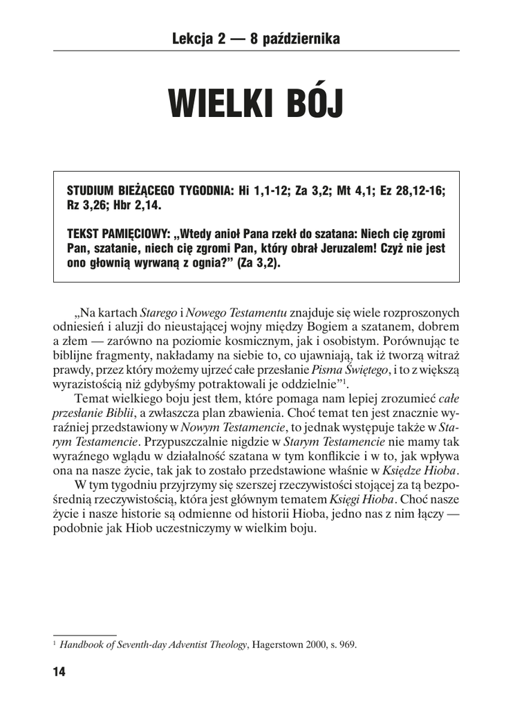 Lekcja 2 — 8 października WIELKI BÓJ STUDIUM BIEŻĄCEGO TYGODNIA: Hi 1,1-12; Za 3,2; Mt 4,1; Ez 28,12-16; Rz 3,26; Hbr 2,14. TEKST PAMIĘCIOWY: „Wtedy anioł Pana rzekł do szatana: Niech cię zgromi Pan, szatanie, niech cię zgromi Pan, który obrał Jeruzalem! Czyż nie jest ono głownią wyrwaną z ognia?” (Za 3,2). „Na kartach Starego i Nowego Testamentu znajduje się wiele rozproszonych odniesień i aluzji do nieustającej wojny między Bogiem a szatanem, dobrem a złem — zarówno na poziomie kosmicznym, jak i osobistym. Porównując te biblijne fragmenty, nakładamy na siebie to, co ujawniają, tak iż tworzą witraż prawdy, przez który możemy ujrzeć całe przesłanie Pisma Świętego, i to z większą wyrazistością niż gdybyśmy potraktowali je oddzielnie”1. Temat wielkiego boju jest tłem, które pomaga nam lepiej zrozumieć całe przesłanie Biblii, a zwłaszcza plan zbawienia. Choć temat ten jest znacznie wyraźniej przedstawiony w Nowym Testamencie, to jednak występuje także w Starym Testamencie. Przypuszczalnie nigdzie w Starym Testamencie nie mamy tak wyraźnego wglądu w działalność szatana w tym konflikcie i w to, jak wpływa ona na nasze życie, tak jak to zostało przedstawione właśnie w Księdze Hioba. W tym tygodniu przyjrzymy się szerszej rzeczywistości stojącej za tą bezpośrednią rzeczywistością, która jest głównym tematem Księgi Hioba. Choć nasze życie i nasze historie są odmienne od historii Hioba, jedno nas z nim łączy — podobnie jak Hiob uczestniczymy w wielkim boju. Handbook of Seventh-day Adventist Theology, Hagerstown 2000, s. 969. 1 14 Małe niebo na ziemi NIEDZIELA — 2 października Księga Hioba zaczyna się stosunkowo pozytywnie. Z perspektywy świata widzimy człowieka pobłogosławionego pod każdym względem. Przeczytaj Hi 1,1-4. Co wersety te mówią o życiu, jakie wiódł Hiob? Jakie były pozytywne elementy jego egzystencji? ................................................................................................................................................................................................................................................................... ................................................................................................................................................................................................................................................................... Wydaje się, że Hiob miał wszystko, co jest potrzebne do życia, w tym także sprawiedliwy charakter. Słowo przetłumaczone w Hi 1,1 jako nienaganny pochodzi od słowa, które może oznaczać całkowicie uczciwy. Słowo przetłumaczone jako prawy znaczy dosłownie prosty, co sugeruje chodzenie prostymi drogami. Krótko mówiąc, księga rozpoczyna się niemal edeńską sceną przedstawiającą zamożnego człowieka, posiadającego liczną rodzinę i cieszącego się nienaganną reputacją, czyli człowieka sukcesu. Niestety, człowiek ten żyje w upadłym świecie. Przeczytaj Hi 1,5-6. Co wersety te mówią o rzeczywistości upadłego świata, w którym żyje Hiob? ................................................................................................................................................................................................................................................................... „Patrząc na zabawy urządzane przez swoich synów i swoje córki, Hiob drżał z obawy, by jego dzieci nie naraziły się na niezadowolenie Boga. Jako wierny kapłan rodziny składał ofiary za każde z nich z osobna. Rozumiał groźny charakter grzechu, a myśl, że jego dzieci mogłyby zapomnieć o wymaganiach Boga, kierowała Hioba do Niego we wstawiennictwie za nie”1. Najwyraźniej Hiob postępował dobrze — tak dobrze, jak to możliwe w tym świecie. Choć sytuacja Hioba została przedstawiona tak edeńsko — jako człowieka spełnionego oraz cieszącego się liczną rodziną, dobrym imieniem i dostatkiem materialnym — to jednak nie możemy zapominać, że żył on na upadłej planecie skażonej grzechem, a jak się wkrótce miał przekonać, nie był on wolny od zagrożeń, jakie niesie ze sobą życie tutaj. Jakie dobre rzeczy masz obecnie w swoim życiu? Jak możesz się nauczyć być zawsze wdzięczny za nie? Ellen G. White, w: The Seventh-day Adventist Bible Commentary, Hagerstown 1977, t. III, s. 1140. 1 15 Wszechświatowy konflikt PONIEDZIAŁEK — 3 października Akcja Księgi Hioba zaczyna się na ziemi, miejscu pozornie pełnym pokoju i bezpieczeństwa. Jednak już w Hi 1,6 obraz ten się zmienia. Natychmiast ukazany zostaje inny wygląd rzeczywistości — niewidzialny dla ludzi, chyba że ujawniony tylko dzięki Bożemu objawieniu. Ciekawe, że ten inny wygląd rzeczywistości, niebiański, nie wydaje się tak nacechowany pokojem i bezpieczeństwem jak życie tutaj, na ziemi, przynajmniej na pierwszy rzut oka. Przeczytaj Hi 1,6-12. Choć bardziej szczegółowo zapoznamy się z tymi wersetami w dalszej części naszego studium w tym kwartale, jaką scenę przedstawiają? Jak ona różni się od tego, czego dowiedzieliśmy się nieco wcześniej o życiu Hioba na ziemi? ................................................................................................................................................................................................................................................................... ................................................................................................................................................................................................................................................................... Powyższe wersety zawierają mnóstwo treści. Ukazują one te elementy naszego wszechświata, których nie możemy wykryć przy pomocy najlepszych nawet teleskopów ani zbadać przy pomocy najbardziej zaawansowanej ludzkiej nauki. Fascynujące jest t