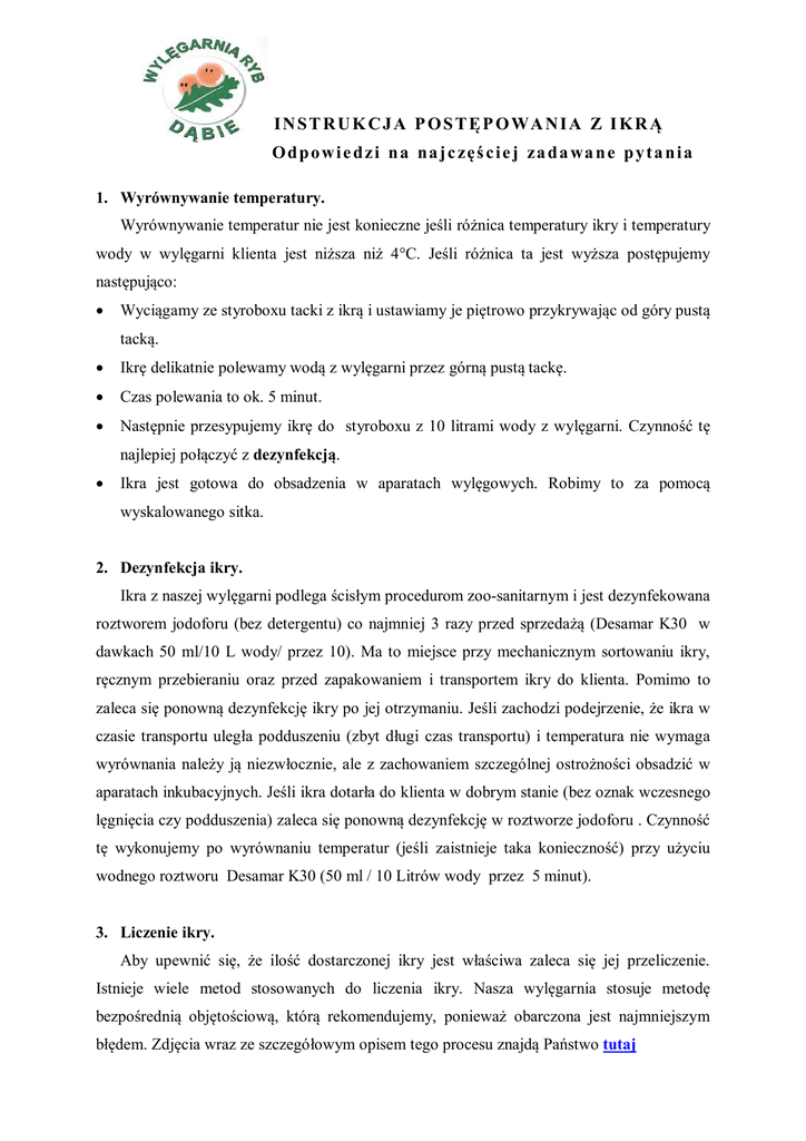 I N S T R U K C J A P O S T Ę P O WA N I A Z I K R Ą O d p o w i e d z i n a na j c zę ś c i e j za d a wa n e p y t a n i a 1. Wyrównywanie temperatury. Wyrównywanie temperatur nie jest konieczne jeśli różnica temperatury ikry i temperatury wody w wylęgarni klienta jest niższa niż 4°C. Jeśli różnica ta jest wyższa postępujemy następująco: Wyciągamy ze styroboxu tacki z ikrą i ustawiamy je piętrowo przykrywając od góry pustą tacką. Ikrę delikatnie polewamy wodą z wylęgarni przez górną pustą tackę. Czas polewania to ok. 5 minut. Następnie przesypujemy ikrę do styroboxu z 10 litrami wody z wylęgarni. Czynność tę najlepiej połączyć z dezynfekcją. Ikra jest gotowa do obsadzenia w aparatach wylęgowych. Robimy to za pomocą wyskalowanego sitka. 2. Dezynfekcja ikry. Ikra z naszej wylęgarni podlega ścisłym procedurom zoo-sanitarnym i jest dezynfekowana roztworem jodoforu (bez detergentu) co najmniej 3 razy przed sprzedażą (Desamar K30 w dawkach 50 ml/10 L wody/ przez 10). Ma to miejsce przy mechanicznym sortowaniu ikry, ręcznym przebieraniu oraz przed zapakowaniem i transportem ikry do klienta. Pomimo to zaleca się ponowną dezynfekcję ikry po jej otrzymaniu. Jeśli zachodzi podejrzenie, że ikra w czasie transportu uległa podduszeniu (zbyt długi czas transportu) i temperatura nie wymaga wyrównania należy ją niezwłocznie, ale z zachowaniem szczególnej ostrożności obsadzić w aparatach inkubacyjnych. Jeśli ikra dotarła do klienta w dobrym stanie (bez oznak wczesnego lęgnięcia czy podduszenia) zaleca się ponowną dezynfekcję w roztworze jodoforu . Czynność tę wykonujemy po wyrównaniu temperatur (jeśli zaistnieje taka konieczność) przy użyciu wodnego roztworu Desamar K30 (50 ml / 10 Litrów wody przez 5 minut). 3. Liczenie ikry. Aby upewnić się, że ilość dostarczonej ikry jest właściwa zaleca się jej przeliczenie. Istnieje wiele metod stosowanych do liczenia ikry. Nasza wylęgarnia stosuje metodę bezpośrednią objętościową, którą rekomendujemy, ponieważ obarczona jest najmniejszym błędem. Zdjęcia wraz ze szczegółowym opisem tego procesu znajdą Państwo tutaj 4. Obsadzenie ikry oraz zalecane przepływy wody przez aparaty inkubacyjne. Aparaty kalifornijskie skrzynkowe: obsadzamy od 10 000 do 20 000 na aparat, przepływ wody 125ml/s na zestaw, przy zachowaniu minimalnego nasycenia tlenem na odpływie wody na poziomie nie mniejszym niż 80% Aparaty Greckiego: obsadzamy od 20 000 do 30 000 na aparat, przepływ 125ml/s na zestaw, przy zachowaniu minimalnego nasycenia tlenem na odpływie wody na poziomie nie mniejszym niż 80%. 5. Obliczanie terminu wylęgu. Szczegółową informację o stopniu rozwoju dostarczonej ikry, (w stopniodniach- °D) klient otrzymuje przy dostawie. Zazwyczaj jest ona podana na styroboxie, w którym ikra jest dostarczana. Stopniodni to iloczyn temperatury wody podczas inkubacji i jej czasu wyrażonego w dniach. Jeśli dostarczymy ikrę w stadium np. 230 stopniodni to do wylęgu ikry pstrąga tęczowego, który następuje przy 340 stopniodniach, pozostaje około 110 stopniodni, co przy temperaturze wody na wylęgarni u klienta np. 10°C i następuje po 11 dniach od daty dostawy. Zmasowany wylęg sparctica, tygrysa, pstrąga potokowego, troci oraz pstrąga źródlanego następuje przy 430 - 450 stopniodniach a krzyżówki pstrąga tęczowego z pstrągiem źródlanym przy około 360 °D. 6. Kąpiele profilaktyczne. Kąpiele profilaktyczne w formalinie zapobiegają pleśnieniu i sklejaniu się ikry oraz ograniczają możliwość przypadkowych zakażeń bakteryjnych ikry oraz wylęgu. Począwszy od dnia następnego po otrzymaniu ikry i jej obsadzeniu na aparatach inkubacyjnych przeprowadzamy systematycznie kąpiele profilaktyczne. Kąpiele prowadzimy codziennie do momentu początku wylęgania a następnie kontynuujemy do połowy okresu miedzy momentem wylęgu a rozpoczęciem żerowania (tj ok. 100 stopniodni, czyli przy wodzie o temperaturze wody np. 10°C przez kolejne 10 dni). Później do momentu żerowania kąpiele redukujemy do połowy dziennej dawki lub zwiększamy przepływ zachowując dawkę. Na dalszym etapie podczas podchowu w basenach podchowowych kąpiele przeprowadzamy dwa razy w tygodniu, stosując 0,3-0,4 l formaliny na 1m3 7. Pielęgnacja ikry i wylęgu Przez cały okres inkubacji ikry do momentu wylęgu a następnie podczas resorpcji woreczka żółtkowego należy utrzymywać higienę w aparatach wylęgowych. Pielęgnacja na tych etapach oprócz kąpieli profilaktycznych, polega na usuwaniu martwych jaj i wylęgu odpowiednio dostosowanymi narzędziami. Wszelkie prace powinny być wykonywane ze szczególną dbałością aby nie doprowadzić do przypadkowego zakażenia ikry lub wylęgu. Istotna jest częsta kontrola prawidłowego przepływu wody przez aparaty inkubacyjne i jej nasycenia tlenem. W przypadku wahań temperatury ważne jest notowanie średnich temperatur dobowych w celu właściwego obliczenia optymalnego czasu, po którym powinno nastąpić przeniesienie wylęgu do basenów podchowowych. 8. Podnoszenie się wylęgu i jego rozkarmianie. Od momentu masowego wylęgania się larw liczymy odpowiednią ilość stopniodni (iloczyn średniej temperatury dobowej i dni inkubacji) w celu wyznaczenia optymalnego terminu dla przeniesienia wylęgu do basenów podchowowych aby rozpocząć etap rozkarmiania. Wybranie optymalnego czasu dla tej czynności jest niezwykle istotne i może rzutować na dalszy proces hodowlany. Dla różnych gatunków czas ten wynosi odpowiednio: pstrąg tęczowy: 200 -220 stopniodni pstrąg źródlany, palia, sparctic, pstrąg potokowy, troć: 260 - 280 stopniodni Warto pamiętać, że dawki paszy w początkowym okresie rozkarmiania powinny być dobierane niezwykle starannie. O wiele mniejszym błędem jest początkowe podawanie dwukrotnie niższej dawki pokarmowej od zalecanej niż podawanie o 5% za wysokiej. Zbyt wczesne podawanie paszy lub za du