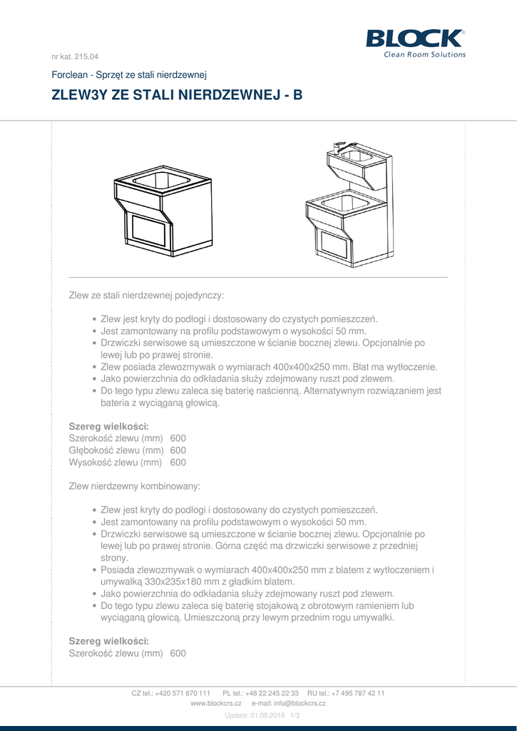 nr kat. 215.04 Forclean - Sprzęt ze stali nierdzewnej ZLEW3Y ZE STALI NIERDZEWNEJ - B Zlew ze stali nierdzewnej pojedynczy: Zlew jest kryty do podłogi i dostosowany do czystych pomieszczeń. Jest zamontowany na profilu podstawowym o wysokości 50 mm. Drzwiczki serwisowe są umieszczone w ścianie bocznej zlewu. Opcjonalnie po lewej lub po prawej stronie. Zlew posiada zlewozmywak o wymiarach 400x400x250 mm. Blat ma wytłoczenie. Jako powierzchnia do odkładania służy zdejmowany ruszt pod zlewem. Do tego typu zlewu zaleca się baterię naścienną. Alternatywnym rozwiązaniem jest bateria z wyciąganą głowicą. Szereg wielkości: Szerokość zlewu (mm) 600 Głębokość zlewu (mm) 600 Wysokość zlewu (mm) 600 Zlew nierdzewny kombinowany: Zlew jest kryty do podłogi i dostosowany do czystych pomieszczeń. Jest zamontowany na profilu podstawowym o wysokości 50 mm. Drzwiczki serwisowe są umieszczone w ścianie bocznej zlewu. Opcjonalnie po lewej lub po prawej stronie. Górna część ma drzwiczki serwisowe z przedniej strony. Posiada zlewozmywak o wymiarach 400x400x250 mm z blatem z wytłoczeniem i umywalką 330x235x180 mm z gładkim blatem. Jako powierzchnia do odkładania służy zdejmowany ruszt pod zlewem. Do tego typu zlewu zaleca się baterię stojakową z obrotowym ramieniem lub wyciąganą głowicą. Umieszczoną przy lewym przednim rogu umywalki. Szereg wielkości: Szerokość zlewu (mm) 600 CZ tel.: +420 571 670 111 PL tel.: +48 22 245 22 33 RU tel.: +7 495 787 42 11 www.blockcrs.cz e-mail: [email protected] Update: 01.09.2016 1/3 nr kat. 215.04 Forclean - Sprzęt ze stali nierdzewnej ZLEW3Y ZE STALI NIERDZEWNEJ - B Głębokość zlewu (mm) 680 Wysokość zlewu (mm) 600 Wysokość umywalki 1080 (mm) CZ tel.: +420 571 670 111 PL tel.: +48 22 245 22 33 RU tel.: +7 495 787 42 11 www.blockcrs.cz e-mail: [email protected] Update: 01.09.2016 2/3 nr kat. 215.04 Forclean - Sprzęt ze stali nierdzewnej ZLEW3Y ZE STALI NIERDZEWNEJ - B S1: Oznaczenie typu 215.04B: Zlewy ze stali nierdzewnej S2: Typ zlewu wartość szerokość wysokość głębokość VJ: Zlew pojedynczy 600 mm 600 mm 600 mm VK: Zlew kombinowany 600 mm 1100 mm 680 mm S3: Bateria BW: Bateria naścienna* PA: Bateria dźwigniowa mieszająca SH: Bateria stojakowa dźwigniowa mieszająca z wyciąganym wężem * Wariant tylko na zlew pojedynczy. S4: Syfon SP: Syfon z tworzywa sztucznego S4: Syfon stal nierdzewna AISI 304 S6: Syfon stal nierdzewna AISI 316L S5: Materiał zlewu wartość materiał 304: Materiał płyty Stal nierdzewna AISI 304 powierzchnia SB S6: Wariant profilu podstawowego B01: Podstawowy profil jest pokryty wykładziną podłogową B02: Profil podstawowy ze stali nierdzewnej S7: Przestrzeń serwisowa L: Dostęp serwisowy lewy R: Dostęp serwisowy prawy S8: Nietypowe wykonanie O: Typowe rozwiązanie Q: Nietypowe rozwiązanie Typowe rozwiązanie 0 - jednoznaczna specyfikacja z oferowanych wariantów Nietypowe wykonanie Q - nietypowe rozwiązanie, którego nie można jednoznacznie specyfikować z pomocą kodu CZ tel.: +420 571 670 111 PL tel.: +48 22 245 22 33 RU tel.: +7 495 787 42 11 www.blockcrs.cz e-mail: [email protected] Update: 01.09.2016 3/3 Powered by TCPDF (www.tcpdf.org)