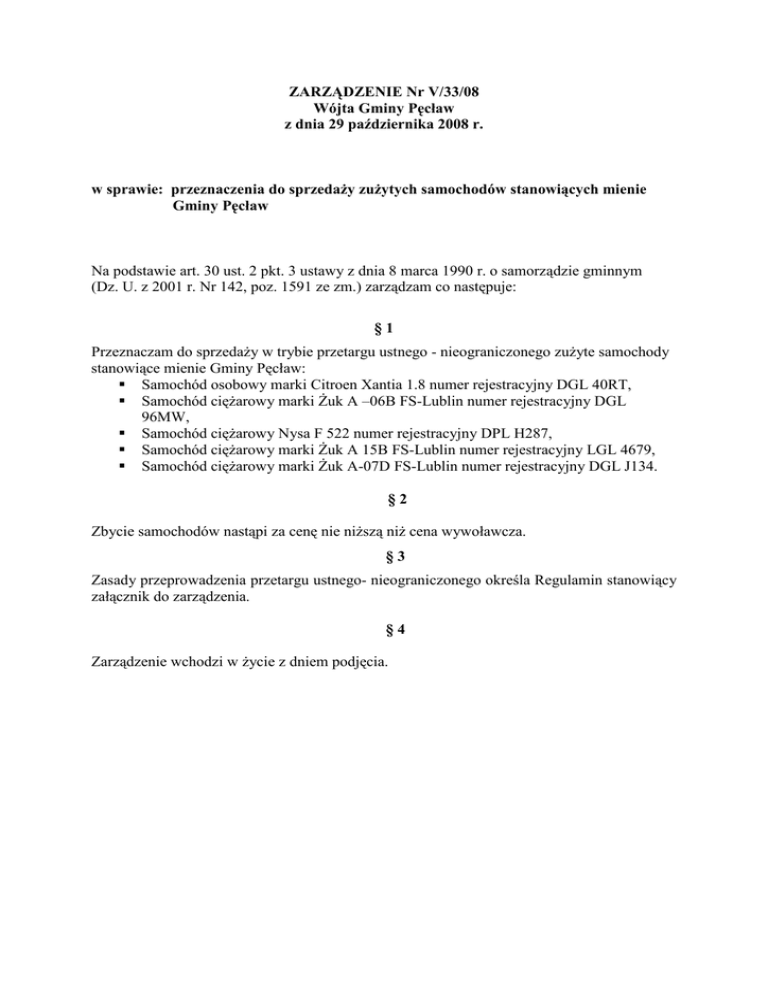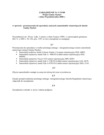 ZARZĄDZENIE Nr V/33/08 Wójta Gminy Pęcław z dnia 29 października 2008 r. w sprawie: przeznaczenia do sprzedaŜy zuŜytych samochodów stanowiących mienie Gminy Pęcław Na podstawie art. 30 ust. 2 pkt. 3 ustawy z dnia 8 marca 1990 r. o samorządzie gminnym (Dz. U. z 2001 r. Nr 142, poz. 1591 ze zm.) zarządzam co następuje: §1 Przeznaczam do sprzedaŜy w trybie przetargu ustnego - nieograniczonego zuŜyte samochody stanowiące mienie Gminy Pęcław: Samochód osobowy marki Citroen Xantia 1.8 numer rejestracyjny DGL 40RT, Samochód cięŜarowy marki śuk A –06B FS-Lublin numer rejestracyjny DGL 96MW, Samochód cięŜarowy Nysa F 522 numer rejestracyjny DPL H287, Samochód cięŜarowy marki śuk A 15B FS-Lublin numer rejestracyjny LGL 4679, Samochód cięŜarowy marki śuk A-07D FS-Lublin numer rejestracyjny DGL J134. §2 Zbycie samochodów nastąpi za cenę nie niŜszą niŜ cena wywoławcza. §3 Zasady przeprowadzenia przetargu ustnego- nieograniczonego określa Regulamin stanowiący załącznik do zarządzenia. §4 Zarządzenie wchodzi w Ŝycie z dniem podjęcia. Załącznik do Zarządzenia Nr V/33/08 Wójta Gminy Pęcław z dnia 29 października 2008 r. REGULAMIN przetargu ustnego – nieograniczonego na sprzedaŜ zuŜytych samochodów stanowiących mienie Gminy Pęcław 1. Przedmiotem przetargu są zuŜyte samochody stanowiące własność Gminy Pęcław: 1. Samochód osobowy marki CITROEN Xantia 2. Samochód cięŜarowy marki FS-Lublin śuk A-06B 3. Samochód cięŜarowy marki Nysa F 522 4. Samochód cięŜarowy marki FS-Lublin śuk A-15B 5. Samochód cięŜarowy marki FS-Lublin śuk A-07D Warunki przystąpienia do przetargu: 00 1. Przetarg odbędzie się w dniu 18 listopada 2008 r. o godz. 9 w siedzibie Urzędu Gminy Pęcław, Pęcław 28, pokój nr 10 (na piętrze). 2. Komisję przetargową powoła Wójt Gminy Pęcław zarządzeniem. 2. Wadium naleŜy wpłacić do dnia 17.11.2008 r. na konto Urzędu Gminy Pęcław Bank Spółdzielczy w Głogowie Nr 57 86460008 0000 0025 9402 0004. Przed otwarciem przetargu naleŜy okazać komisji przetargowej: - dowód wpłaty wadium; - dokument stwierdzający toŜsamość. 3. Wpłacone wadium zostanie: - zaliczone na poczet ceny nabycia, jeŜeli osoba wpłacająca wadium wygra przetarg; - zwrócone przelewem na rachunek bankowy lub wypłacone gotówką w kasie Urzędu Gminy Pęcław nie później niŜ w terminie trzech dni od dnia zamknięcia, odwołania, uniewaŜnienia lub zakończenia przetargu wynikiem negatywnym. 1. O wysokości postąpienia decydują uczestnicy przetargu, z tym, Ŝe nie moŜe ono wynosić mniej niŜ 1% ceny wywoławczej i więcej niŜ wysokość wadium, z zaokrągleniem w górę do pełnych dziesiątek złotych. 2. Cena osiągnięta w przetargu stanowi cenę nabycia, płatna jednorazowo nie później jak przed podpisaniem umowy kupna-sprzedaŜy. 3. W przypadku osób fizycznych koniecznym jest posiadanie zaświadczenia o wpisie do ewidencji działalności gospodarczej, a w przypadku osób prawnych odpisu z Krajowego Rejestru Sądowego. 4. Dopuszcza się udział osób nie prowadzących działalności gospodarczej. 5. Uchylenie się uczestnika, który wygrał przetarg od zawarcia umowy w ustalonym terminie spowoduje przepadek wpłaconego wadium. 6. Przetarg jest waŜny bez względu na liczbę uczestników, jeŜeli chociaŜ jeden uczestnik zaoferuje co najmniej jedno postąpienie powyŜej ceny wywoławczej. 7. Sporządzenie umów oraz wydanie przedmiotów sprzedaŜy nabywcom z najkorzystniejszą ceną nastąpi niezwłocznie po zapłaceniu ceny nabycia. 8. W Urzędzie Gminy Pęcław, Pęcław 28, pok. nr 9 w godz. 745-1545 moŜna zapoznać się z opiniami rzeczoznawcy w sprawie samochodów. Wójt Gminy zastrzega sobie prawo do odwołania lub uniewaŜnienia przetargu z uzasadnionych przyczyn. Szczegółowe informacje o przedmiotach sprzedaŜy, warunkach przetargu moŜna uzyskać w Urzędzie Gminy Pęcław, pokój nr 9, w godz. 745-1545 ,tel.(076) 8317 135 wew. 39.