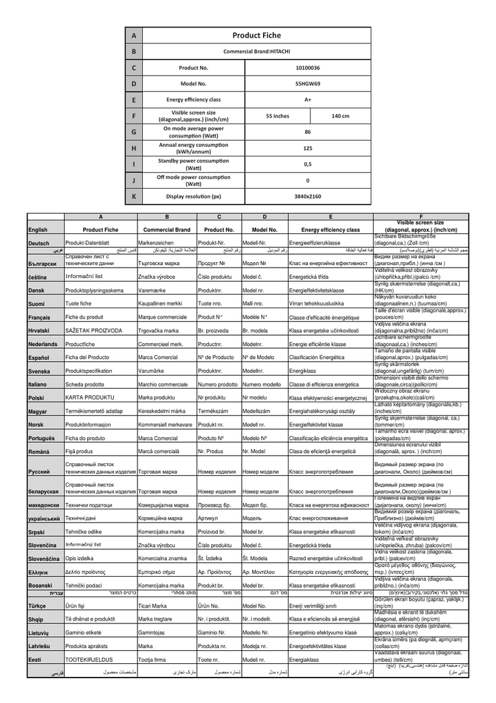 A Product Fiche B Commercial Brand:HITACHI C Product No. 10100036 D Model No. 55HGW69 E Energy efficiency class A+ F Visible screen size (diagonal,approx.) (inch/cm) G On mode average power consumption (Watt) 86 H Annual energy consumption (kWh/annum) 125 I Standby power consumption (Watt) 0,5 J Off mode power consumption (Watt) 0 K Display resolution (px) 3840x2160 55 inches 140 cm F Visible screen size (diagonal, approx.) (inch/cm) Sichtbare Bildschirmgröße Produkt-Datenblatt Markenzeichen Produkt-Nr. Modell-Nr. Energieeffizienzklasse (diagonal,ca.) (Zoll /cm) Deutsch : (/)() (,.) ( /c ) Viditelná velikost obrazovky Znaka výrobce íslo produktu Model . Energetická tída (úhlopíka,pibl.)(palc /cm) eština Synlig skærmstørrelse (diagonalt,ca.) Produktoplysningsskema Varemærke Produktnr. Model nr. Energieffektivitetsklasse (HK/cm) Dansk Näkyvän kuvaruudun koko Tuote fiche Kaupallinen merkki Tuote nro. Malli nro. Virran tehokkuusluokka (diagonaalinen,n.) (tuumaa/cm) Suomi Taille d'écran visible (diagonale,approx.) Fiche du produit Marque commerciale Produit N° Modèle N° (pouces/cm) Français Classe d'efficacité énergétique Vidljiva veliina ekrana SAŽETAK PROIZVODA Trgovaka marka Br. proizvoda Br. modela Klasa energetske uinkovitosti (dijagonalna,približno) (ina/cm) Hrvatski Zichtbare schermgrootte Commercieel merk. Productnr. Modelnr. Energie efficiëntie klasse (diagonaal,ca.) (inches/cm) Nederlands Productfiche Tamaño de pantalla visible Ficha del Producto Marca Comercial Nº de Producto Nº de Modelo Clasificación Energética (diagonal,aprox.) (pulgadas/cm) Español Synlig skärmstorlek Produktspecifikation Varumärke Produktnr. Modellnr. Energiklass (diagonal,ungefärlig) (tum/cm) Svenska Dimensioni visibili dello schermo Scheda prodotto Marchio commerciale Numero prodotto Numero modello Classe di efficienza energetica (diagonale,circa)(pollici/cm) Italiano Widoczny obraz ekranu KARTA PRODUKTU Marka produktu Nr produktu Nr modelu Polski Klasa efektywnoci energetycznej (przektna,około)(cali/cm) Látható képtartomány (diagonális,kb.) Termékismertet adatlap Kereskedelmi márka Termékszám Modellszám Energiahatékonysági osztály (inches/cm) Magyar Synlig skjermstørrelse (diagonal, ca.) Produktinformasjon Kommersiell merkevare Produkt nr. Modell nr. Energieffektivitet klasse (tommer/cm) Norsk Tamanho ecrã visível (diagonal, aprox.) Ficha do produto Marca Comercial Produto Nº Modelo Nº Classificação eficiência energética (polegadas/cm) Português Dimensiunea ecranului vizibil Fi produs Marc comercial Nr. Produs Nr. Model Clasa de eficien energetic (diagonal, aprox. ) (inch/cm) Român English A B C D E Product Fiche Commercial Brand Product No. Model No. Energy efficiency class ( , ) (/) ( ,)(/ ) . . (, ) (/cm) (, ) (/cm) Veliina vidljivog ekrana (dijagonala, Tehnike odlike Komercijalna marka Proizvod br. Model br. Klasa energetske efikasnosti tokom) (ina/cm) Srpski Viditená vekos obrazovky Znaka výrobcu íslo produktu Model . Energetická trieda (uhloprieka, zhruba) (palcov/cm) Slovenina Vidna velikost zaslona (diagonala, Komercialna znamka Št. zdelka Št. Modela Razred energetske uinkovitosti pribl.) (palcev/cm) Slovenšina Opis izdelka η (ιι, ι . . η ι η .) (/cm) Ev Vidljiva veliina ekrana (diagonala, Tehniki podaci Komercijalna marka Produkt br. Model br. Klasa energetske efikasnosti približno.) (ina/cm) Bosanski ' ' (/)(,) Görülen ekran boyutu (çapraz, yaklk.) (inç/cm) Ürün fii Ticari Marka Ürün No. Model No. Enerji verimlilii sınıfı Türkçe Madhësia e ekranit të dukshëm Të dhënat e produktit Marka tregtare Nr. i produktit. Nr. i modelit. Klasa e eficiencës së energjisë (diagonal, afërsisht) (inç/cm) Shqip Matomas ekrano dydis (strižain, Gaminio etiket Gamintojas Gaminio Nr. Modelio Nr. Energetinio efektyvumo klas approx.) (coli/cm) Lietuvi Ekrna izmrs (pa diognli, apmçram) Produkta apraksts Marka Produkta nr. Modea nr. Energoefektivittes klase (collas/cm) Latviešu Vaadatava ekraani suurus (diagonaal, TOOTEKIRJELDUS Tootja firma Toote nr. Mudeli nr. Energiaklass umbes) (tolli/cm) Eesti /) (,) ( English Deutsch eština G On mode average power consumption (Watt) Durchschnittlicher Stromverbrauch im eingeschaltetem Zustand (Watt) H Annual energy consumption (kWh/annum) Jährlicher Energieverbrauch (kWh/Jahr) Standby-Stromverbrauch (Watt) J Off mode power consumption (Watt) Stromverbrauch im ausgeschaltetem Zustand (Watt) () (Watt) Prmrná spoteba elektrické energie v zapnutém režimu (Watt) Gennemsnitligt strømforbrug i tændt tilstand (Watt) Päällä-tilan keskimääräinen virrankulutus (Wattia) Consommation énergétique moyenne en mode "marche" (Watt) Prosjena potrošnja el. energije kada je proizvod ukljuen (Watta) (/) (kWh/) Roní spoteba energie (kWh/Roní) () (Watt) Spoteba elektrické energie v pohotovostním režimu (Watt) () () (Watt) () Spoteba elektrické energie ve vypnutém režimu (Watt) Rozlišení displeje (px) Strømforbrug (standby)(Watt) Strømforbrug i slukket tilstand (Watt) Vakiovirran kulutus (Wattia) Consommation d'énergie en veille (Watt) Potrošnja el. energije u modu pripravnosti (Watta) Pois-tilan virrankulutus (Wattia) Näytön erottelukyky (pikselia) Consommation d'énergie en mode "arrêt" (Watt) Résolution de l'écran (px) Potrošnja el. energije kada je proizvod iskljuen (Watta) Rezolucija zaslona (piksela) Stand-by stroomverbruik (Watt) Consumo en modo en espera (Vatio) Uit-modus stroomverbruik (Watt) Consumo eléctrico modo apagado (Vatio) Resolución de pantalla (px) Strömkonsumtion i viloläge (Watt) Consumo di corrente in modalità standby (Watt) rednie zuycie energii w trybie oczekiwania (Watów) Energiafogyasztás standby üzemmódban (Watt) Strömkonsumtion i AV-läge (Watt) Skärmupplösning (pixlar) Consumo di corrente da spenta (Watt) Risoluzione del display (px) Zuycie energii w trybie wyłczonym (Watów) Rozdzielczo obrazu (pikseli) Energiafogyasztás kikapcso