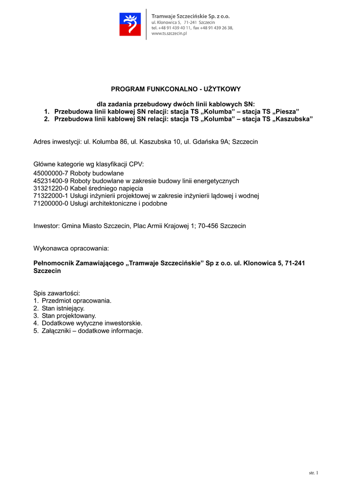 PROGRAM FUNKCONALNO - UŻYTKOWY dla zadania przebudowy dwóch linii kablowych SN: 1. Przebudowa linii kablowej SN relacji: stacja TS „Kolumba” – stacja TS „Piesza” 2. Przebudowa linii kablowej SN relacji: stacja TS „Kolumba” – stacja TS „Kaszubska” Adres inwestycji: ul. Kolumba 86, ul. Kaszubska 10, ul. Gdańska 9A; Szczecin Główne kategorie wg klasyfikacji CPV: 45000000-7 Roboty budowlane 45231400-9 Roboty budowlane w zakresie budowy linii energetycznych 31321220-0 Kabel średniego napięcia 71322000-1 Usługi inżynierii projektowej w zakresie inżynierii lądowej i wodnej 71200000-0 Usługi architektoniczne i podobne Inwestor: Gmina Miasto Szczecin, Plac Armii Krajowej 1; 70-456 Szczecin Wykonawca opracowania: Pełnomocnik Zamawiającego „Tramwaje Szczecińskie” Sp z o.o. ul. Klonowica 5, 71-241 Szczecin Spis zawartości: 1. Przedmiot opracowania. 2. Stan istniejący. 3. Stan projektowany. 4. Dodatkowe wytyczne inwestorskie. 5. Załączniki – dodatkowe informacje. str. 1 1. Przedmiot opracowania. Przedmiotem opracowania jest określenie zakresu wymiany 2. linii kablowych średniego napięcia (SN) 15 kV realizowanej w ramach Umowy Nr WGKiOŚ 85/2016 o zastępstwo inwestorskie w zakresie utrzymania bieżącego i nakładów inwestycyjnych na tramwajową infrastrukturę transportową z dn. 04.01.2016 r. (pozycje: pod Lp.IV.1 oraz Lp.IV.2 Załącznika nr 1 do Umowy): 1) linii kablowej SN nr 549 relacji: stacja prostownikowa TS „Kolumba” – stacja prostownikowa TS „Piesza” na odcinku od podejścia do stacji „Kolumba” do Mostu Portowego, 2) linii kablowej SN nr 69 relacji: stacja prostownikowa TS „Kolumba” – stacja prostownikowa TS „Kaszubska” na odcinku od podejścia do stacji „Kolumba” do podejścia do stacji „Kaszubska”. 2. Stan istniejący. 1) Linia kablowa SN nr 549 zbudowana jest z: a) trzech jednożyłowych kabli elektroenergetycznych ziemnych o napięciu znamionowym izolacji 12/20 kV typu XRUHAKXS 1x120/50 mm2 przebiegających po trasie: od rozdzielni SN 15 kV stacji prostownikowej trakcyjnej „Kolumba” przy ul. Kolumba 86 po moście kablowym z Wyspy Jaskółczej w przepustach – do ulicy Kolumba przed most, b) jednego kabla elektroenergetycznego ziemnego o napięciu znamionowym izolacji 12/20 kV trójżyłowego typu HAKnFtA 3x120 mm2 przebiegającego w ziemi pod chodnikami lub nawierzchniami trawiastymi, w przepustach pod mostami i pod jezdniami po trasie: sprzed mostu kablowego z Wyspy Jaskółczej – przez jezdnie ul. Kolumba pod mur oporowy naprzeciw dworca kolejowego – ulicą Kolumba pod murem oporowym naprzeciw dworca kolejowego – po moście kolejowym nad rzeką Odrą Zachodnią – po terenie zajmowanym przez Szczecińskie Wodne Ochotnicze Pogotowie Ratunkowe przy ul. Heyki wzdłuż estakady kolejowej – ulicą Heyki – pod mostem Zielonym nad Kanałem Zielonym – ulicą Bulwar Gdański – do skarpy przyczółku Mostu Portowego, c) trzech jednożyłowych kabli elektroenergetycznych ziemnych o napięciu znamionowym izolacji 12/20 kV typu XRUHAKXS 1x120/50 mm2 przebiegających po trasie: od skarpy przyczółku Mostu Portowego – w przepustach rurowych pod Mostem Portowym nad rzeką Odrą – ulicą Gdańską w ziemi w pasie wydzielonego torowiska – do głowicy napowietrznej na terenie zewnętrznym stacji prostownikowej „Piesza” przy ul. Gdańskiej 9A. Odcinki opisane w pkt. a i c nie podlegają wymianie. 2) Linia kablowa SN nr 69 zbudowana jest z: a) trzech jednożyłowych kabli elektroenergetycznych ziemnych o napięciu znamionowym izolacji 12/20 kV typu XRUHAKXS 1x120/50 mm2 przebiegających po trasie: od rozdzielni SN 15 kV stacji prostownikowej trakcyjnej „Kolumba” przy ul. Kolumba 86 – po moście kablowym z Wyspy Jaskółczej w przepustach – do ulicy Kolumba przed most, b) jednego kabla elektroenergetycznego ziemnego o napięciu znamionowym izolacji 12/20 kV trójżyłowego typu HAKnFtA 3x120 mm2 przebiegającego w całości w ziemi pod chodnikami lub nawierzchniami trawiastymi, w przepustach pod jezdniami po trasie: sprzed mostu kablowego z Wyspy Jaskółczej – ulicą Kolumba wzdłuż nabrzeża rzeki Odry Zachodniej – ulicą Nabrzeże Wieleckie – ulicą Dworcową – za ulicą Św. Ducha łukiem po terenach trawiastych do ulicy i ulicą Rybacką na powrót do ulicy Dworcowej – ulicą Korzeniowskiego – wzdłuż placu Batorego na tyłach kompleksu hotelowego Novotel – ulicą Śniadeckich – pod boiskiem Zespołu Szkół nr 8 im. Stanisława Staszica – ulicą Stoisława – ulicą Potulicką – ulicą Św. Wojciecha – ulicą Bogurodzicy – ulicą str. 2 (deptakiem) Kaszubską – przed bramę wjazdową na działkę przy ulicy Kaszubskiej 10 w kompleksie „Galerii Kaskada”, c) trzech jednożyłowych kabli elektroenergetycznych ziemnych o napięciu znamionowym izolacji 12/20 kV typu XRUHAKXS 1x120/50 mm2 przebiegających po trasie: sprzed bramy wjazdowej na działkę przy ulicy Kaszubskiej 10 w kompleksie „Galerii Kaskada” – w przepustach pod bramą wjazdową – do rozdzielni SN prostownikowej stacji trakcyjnej „Kaszubska”. Odcinki opisane w pkt. a i c nie podlegają wymianie. 3. Stan projektowany. 1) Przebudowa linii kablowej SN nr 549 relacji: stacja prostownikowa TS „Kolumba” – stacja prostownikowa TS „Piesza” obejmuje odcinek opisany w pkt. 2 ppkt. 1 lit. b i ma na celu jej wymianę na nowy typ kabla (XRUHAKXS). Zamawiający sugeruje zmianę przebiegu trasy linii kablowej polegającą na usunięciu linii kablowej z ziemi na terenie zajmowanym przez Szczecińskie Wodne Ochotnicze Pogotowie Ratunkowe przy ul. Heyki poprzez przeniesienie jej na estakadę, po której przebiegają tory kolejowe i przeprowadzenie przez wiadukt nad ul. Heyki z zejściem do ziemi za tym wiaduktem (uniknięcie przechodzenia przepustem przez jezdnię ul. Heyki). 2) Przebudowa linii kablowej SN nr 69 relacji: stacja prostownikowa TS „Kolumba” – stacja prostownikowa TS