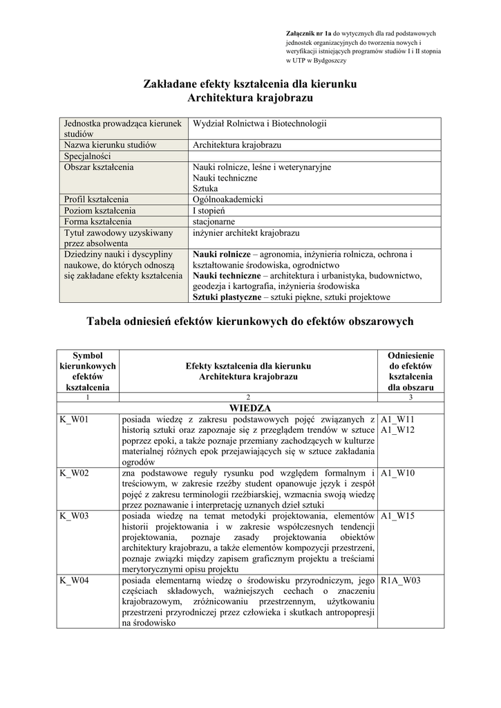 Załącznik nr 1a do wytycznych dla rad podstawowych jednostek organizacyjnych do tworzenia nowych i weryfikacji istniejących programów studiów I i II stopnia w UTP w Bydgoszczy Zakładane efekty kształcenia dla kierunku Architektura krajobrazu Jednostka prowadząca kierunek studiów Nazwa kierunku studiów Specjalności Obszar kształcenia Profil kształcenia Poziom kształcenia Forma kształcenia Tytuł zawodowy uzyskiwany przez absolwenta Dziedziny nauki i dyscypliny naukowe, do których odnoszą się zakładane efekty kształcenia Wydział Rolnictwa i Biotechnologii Architektura krajobrazu Nauki rolnicze, leśne i weterynaryjne Nauki techniczne Sztuka Ogólnoakademicki I stopień stacjonarne inżynier architekt krajobrazu Nauki rolnicze – agronomia, inżynieria rolnicza, ochrona i kształtowanie środowiska, ogrodnictwo Nauki techniczne – architektura i urbanistyka, budownictwo, geodezja i kartografia, inżynieria środowiska Sztuki plastyczne – sztuki piękne, sztuki projektowe Tabela odniesień efektów kierunkowych do efektów obszarowych Symbol kierunkowych efektów kształcenia Efekty kształcenia dla kierunku Architektura krajobrazu Odniesienie do efektów kształcenia dla obszaru 1 2 3 WIEDZA K_W01 K_W02 K_W03 K_W04 posiada wiedzę z zakresu podstawowych pojęć związanych z historią sztuki oraz zapoznaje się z przeglądem trendów w sztuce poprzez epoki, a także poznaje przemiany zachodzących w kulturze materialnej różnych epok przejawiających się w sztuce zakładania ogrodów zna podstawowe reguły rysunku pod względem formalnym i treściowym, w zakresie rzeźby student opanowuje język i zespół pojęć z zakresu terminologii rzeźbiarskiej, wzmacnia swoją wiedzę przez poznawanie i interpretację uznanych dzieł sztuki posiada wiedzę na temat metodyki projektowania, elementów historii projektowania i w zakresie współczesnych tendencji projektowania, poznaje zasady projektowania obiektów architektury krajobrazu, a także elementów kompozycji przestrzeni, poznaje związki między zapisem graficznym projektu a treściami merytorycznymi opisu projektu posiada elementarną wiedzę o środowisku przyrodniczym, jego częściach składowych, ważniejszych cechach o znaczeniu krajobrazowym, zróżnicowaniu przestrzennym, użytkowaniu przestrzeni przyrodniczej przez człowieka i skutkach antropopresji na środowisko A1_W11 A1_W12 A1_W10 A1_W15 R1A_W03 Załącznik nr 1a do wytycznych dla rad podstawowych jednostek organizacyjnych do tworzenia nowych i weryfikacji istniejących programów studiów I i II stopnia w UTP w Bydgoszczy K_W05 K_W06 K_W07 K_W08 K_W09 K_W10 K_W11 K_W12 K_W13 K_W14 K_W15 K_W16 posiada wiedzę z zakresie budowy roślin, a także – poznaje morfologię i wymagania ekologiczne gatunków zaliczanych do flory obszaru Polski, zgrupowanych systematycznie, posiada wiedzę o prawidłowościach funkcjonowania układów ekologicznych a także - na temat relacji między środowiskiem życia a budową i czynnościami życiowymi organizmów roślinnych zna sposoby definiowania elementów przestrzeni i ich właściwości w odniesieniu do grafiki wektorowej oraz uzyskuje ogólną wiedzę z zakresu technik informatycznych w zakresie studiowanego kierunku ma ogólną wiedzę na temat zadań rolniczej produkcji roślinnej, jej specyfiki i form realizacji oraz uzyskuje wiedzę na temat morfologii, biologii rozwoju, wymagań środowiskowych i agrotechnicznych użytkowych roślin uprawnych posiada podstawową wiedzę z zakresu geologii, geomorfologii, hydrologii oraz klimatologii, obejmujących informacje o procesach oraz charakterystykę warunków naturalnych Polski, w tym budowy geologicznej, rzeźby terenu, stosunków wodnych i klimatu oraz o procesach kształtujących współczesne środowisko przyrodnicze, a także uzyskuje ogólną wiedzę na temat zjawisk i procesów zachodzących w glebach oraz ich powiązania z wymaganiami roślin ma wiedzę o roli i znaczeniu zrównoważonego użytkowania środowiska przyrodniczego, umie zdefiniować występujące zagrożenia i zna sposoby ich obserwacji i przeciwdziałania skutkom ich wystąpienia zna problemy zagrożeń wynikających z wrażliwości roślin ozdobnych na wpływ określonych fitofagów i zna sposoby ochrony roślin przed nimi zna zasady oceny krajobrazu otwartego, zarządzania krajobrazem i podstaw prawnych w ochronie środowiska i krajobrazu, w tym zarządzania warunkami wodnymi, a także zna podstawy zarządzania naturalnymi zadrzewieniami i obszarami leśnymi posiada wiedzę z zakresu nowoczesnych technologii uprawy, kreowania oryginalnych form i rozmnażania wybranych gatunków ozdobnych roślin drzewiastych posiada wiedzę z zakresu nowoczesnych technologii uprawy, kreowania oryginalnych form i rozmnażania wybranych gatunków ozdobnych roślin zielnych oraz ich zastosowania do różnych celów zna zasady projektowania dowolnych obiektów krajobrazu i umie ocenić znaczenie i wartość funkcjonalną, materialną i estetyczną dowolnego obiektu zna i rozumie zasady urządzania i pielęgnacji obiektów architektury krajobrazu, a także zna aspekty przyrodnicze, techniczne, kulturowe i prawne ochrony i naprawy zdegradowanego krajobrazu ma podstawową wiedzę ekonomiczną, prawną i społeczną dostosowaną do studiowanego kierunku, w tym - zna ogólne zasady tworzenia i rozwoju firm, zna podstawy prawne funkcjonowania indywidualnej przedsiębiorczości, zna techniki komunikacji w biznesie, a także zna i rozumie podstawowe pojęcia i zasady z zakresu ochrony własności przemysłowej i prawa autorskiego R1A_W03 R1A_W04 T1A_W06 T1A_W07 R1A_W03 R1A_W04 R1A_W05 R1A_W06 R1A_W06 R1A_W07 R1A_W04 R1A_W02 R1A_W05 R1A_W04 R1A_W05 R1A_W04 R1A_W05 T1A_W04 R1A_W05 T1A_W04 R1A_W02 R1A_W09 T1A_W10 Załącznik nr 1a do wytycznych dla rad podstawowych jednostek organizacyjnych do tworzenia nowych i weryfikacji istniejących programów studiów I i II stopnia w UTP w Bydgoszczy K_W17 K_W18 K_W19 ma wiedzę z