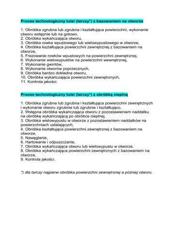 Proces technologiczny tulei (tarczy*) z bazowaniem na otworze 1. Obróbka zgrubna lub zgrubna i kształtująca powierzchni, wykonanie otworu wstępnie lub na gotowo, 2. Obróbka wykańczająca otworu, 3. Obróbka rowka wpustowego lub wielowypustowego w otworze, 4. Obróbka kształtująca powierzchni zewnętrznej z bazowaniem na otworze, 5. Frezowanie rowków wpustowych na powierzchni zewnętrznej, 6. Wykonanie wielowypustów na powierzchni wewnętrznej, 7. Wykonanie gwintów, 8. Wykonanie otworów poprzecznych, 9. Obróbka bardzo dokładna otworu, 10. Obróbka wykańczająca powierzchni zewnętrznych, 11. Kontrola jakości. Proces technologiczny tulei (tarczy*) z obróbką cieplną 1. Obróbka zgrubna lub zgrubna i kształtująca powierzchni zewnętrznych i wykonanie otworu zgrubnie lub zgrubnie i kształtująco, 2. Wstępna obróbka wykańczająca otworu z pozostawieniem naddatku na obróbkę wykańczającą po obróbce cieplnej, 3. Obróbka wielowypustu w otworze z pozostawieniem naddatków na powierzchniach ustalających, 4. Obróbka kształtująca powierzchni zewnętrznej z bazowaniem na otworze, 5. Nawęglanie, 6. Hartowanie i odpuszczanie, 7. Obróbka wykańczająca otworu lub wielowypustu w otworze. 8. Obróbka wykańczająca powierzchni zewnętrznych z bazowaniem na otworze, 9. Kontrola jakości. *) dla tarczy najpierw obróbka powierzchni zewnętrznej a później otworu.