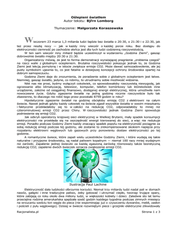 Oślepieni światłem Autor tekstu: Bjřrn Lomborg Tłumaczenie: Małgorzata Koraszewska W ieczorem 23 marca 1,3 miliarda ludzi będzie bez światła o 20:30, o 21:30 i o 22:30, jak też przez resztę nocy — jak w każdy inny wieczór o każdej porze roku. Bez dostępu do elektryczności ciemność po zachodzie słońca jest dla tych ludzi codzienną rzeczywistością. W ten sam wieczór inny miliard będzie uczestniczył w wydarzeniu „Godzina Ziemi", gasząc dobrowolnie światło między 20:30 a 21:30. Organizatorzy mówią, że jest to forma demonstracji wyrażającej pragnienie „zrobienia czegoś" na rzecz walki z globalnym ociepleniem. Brutalna rzeczywistości pokazuje jednak to, że Godzina Ziemi jest lekcją pomyloną i w istocie zwiększa emisje CO2. Może dawać samozadowolenie, ale jej pusty symbolizm ujawnia to, co jest fatalne w dzisiejszej koncepcji ochrony środowiska opartej na dobrym samopoczuciu. Godzina Ziemi daje do zrozumienia, że poradzenie sobie z globalnym ociepleniem jest łatwe. Niemniej, gasząc światło, jedyne, co robimy, to utrudniamy sobie możliwość widzenia. Nikt nas nie prosi, byśmy wyłączyli cokolwiek, co spowodowałoby rzeczywistą niewygodę, jak ogrzewanie albo klimatyzację, telewizor, komputer, telefon komórkowy lub którekolwiek inne urządzenie, zależne od osiągalnej finansowo, dostępnej energii elektrycznej, która umożliwiła nam nowoczesne życie. Gdyby zgaszenie światła na jedną godzinę rocznie rzeczywiście było tak zbawienne, to dlaczego nie robić tego przez pozostałe 8759 godzin w roku? Hipotetycznie zgaszenie świateł na godzinę obcięłoby emisję CO2 z elektrowni na całym świecie. Nawet jednak gdyby każdy człowiek na świecie zgasił wszystkie światła w swoim mieszkaniu i faktycznie przekładałoby się to w całości na redukcję CO2, odpowiadałoby to mniej niż czterominutowej emisji CO2 przez Chiny. W rzeczywistości jednak Godzina Ziemi spowoduje podniesienie się emisji CO2. Jak odkryli operatorzy krajowej sieci elektrycznej w Wielkiej Brytanii, mały spadek konsumpcji elektryczności nie przekłada się na oszczędność energii kierowanej do sieci, a więc nie redukuje emisji. Ponadto podczas Godziny Ziemi każdy znaczący spadek popytu na elektryczność pociągnie za sobą redukcję emisji podczas tej godziny, ale zostanie to zrekompensowane skokiem napięcia przy rozpalaniu elektrowni węglowych lub gazowych przy ponowieniu dostaw elektryczności po tej godzinie. A romantyczne świece, które zapali wielu uczestników Godziny Ziemi, i które wydają się takie naturalne i przyjazne środowisku, są nadal paliwem kopalnym — niemal 100 razy mniej wydajnym niż żarówki. Zapalenie jednej świeczki za każdą zgaszoną żarówkę równoważy także teoretyczną redukcję CO2; zapalenie dwóch świeczek oznacza zwiększenie emisji CO2. Ilustracja Paul Lachine Elektryczność dała ludzkości olbrzymie korzyści. Niemal trzy miliardy ludzi nadal pali w domach nawóz, gałązki i inne tradycyjne paliwo, żeby gotować i utrzymać ciepło, tworząc trujące opary, które zabijają co roku około dwa miliony ludzi, w większości kobiety i dzieci. Zaledwie sto lat temu przeciętna rodzina amerykańska spędzała sześć godzin każdego tygodnia podczas zimnych miesięcy na wrzucaniu sześciu ton węgla do pieca (nie wspominając już o czyszczeniu dywanów, mebli, zasłon i pościeli z pyłu węglowego). Dzisiaj w świecie rozwiniętym piece i grzejniki elektryczne zlikwidowały Racjonalista.pl Strona 1 z 3 zanieczyszczenie powietrza w domach. Elektryczność pozwoliła nam na zmechanizowanie znacznej części naszego uprzemysłowionego świata, kładąc kres najbardziej katorżniczej pracy. Pralka wyzwoliła kobiety od niekończących się godzin noszenia wody i prania na tarach. Lodówka umożliwiła niemal każdemu jedzenie większej ilości owoców i warzyw i zaprzestanie jedzenia na wpół zgniłej żywności, co jest główną przyczyną tego, że najczęstszy wśród mężczyzn w latach 1930 rodzaj raka — rak żołądka — jest obecnie najrzadszy. Elektryczność pozwoliła nam na nawadnianie pól i syntetyzowanie nawozu z powietrza. Światło, które daje, umożliwiło nam czynne, produktywne życie po zachodzie słońca. Elektryczność konsumowana przez ludzi w bogatych krajach jest, przeciętnie, odpowiednikiem 56 służących. Nawet ludzie w Afryce sub-saharyjskiej mają elektryczność odpowiadającą około trzem służącym. Potrzebują jej więcej, nie zaś mniej. Jest to ważne nie tylko dla biednych na świecie. Z powodu rosnących cen energii, podniesionych przez subsydia dla energii „zielonej", 800,000 niemieckich rodzin nie stać dłużej na płacenie rachunków za elektryczność (http://www.focus.de/immobilien/energiesparen/tid -27705/strom-und-heizkosten-ueb erfordern-verbraucher-wenn-das- geld-nicht-mehr-zum-heizenreic ht_aid_838837.html). W Wielkiej Brytanii jest obecnie ponad pięć milionów ludzi, których nie stać na paliwo i organ nadzorujący produkcję krajowej elektryczności publicznie wyraża obawy, że koncentracja uwagi na celach związanych z ochroną środowiska może za niecałe dziewięć miesięcy doprowadzić do przerw w dostawach elektryczności. Obecnie te technologie są zbyt kosztowne. Nie można też na nich polegać (nadal nie mamy pojęcia, co robić, kiedy wiatr nie wieje). Nawet przy optymistycznych założeniach Międzynarodowa Agencja Energii szacuje, że do roku 2035 będziemy produkować tylko 2,4% energii z wiatru i 0,8% ze słońca. Dla zazielenienia energii świata powinniśmy porzucić przestarzałą politykę subsydiowania zawodnej energii słonecznej i wiatrowej — politykę, która zawodzi już od 20 lat i będzie zawodziła przez kolejnych 22. Zamiast tego powinniśmy skoncentrować się na poszukiwaniu nowych, bardziej wydajnych zielonych technologii, by były konkurencyjne z paliwami kopalnymi. Jeśli rzeczywiście chcemy w przy