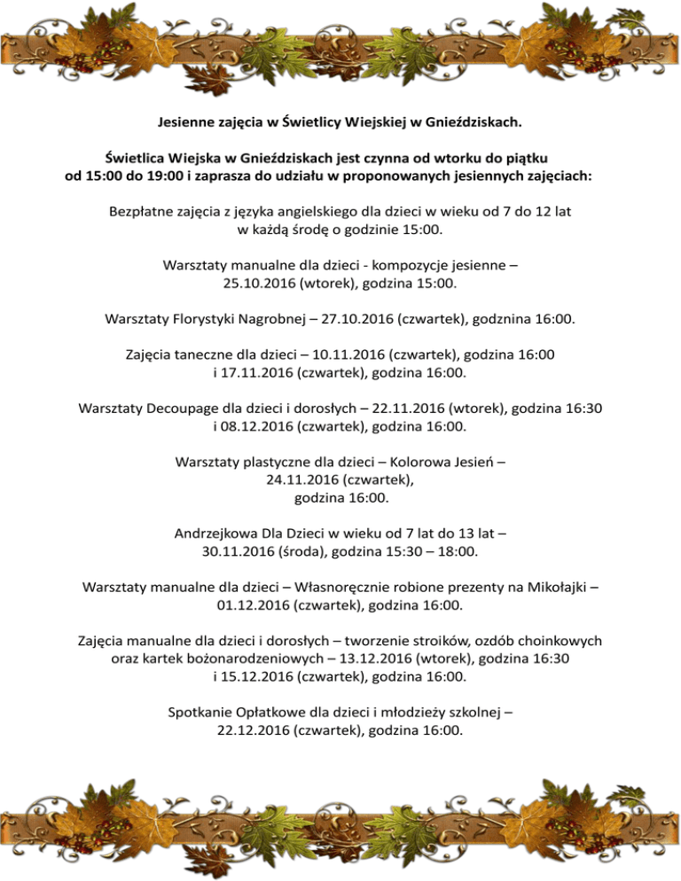 Jesienne zajęcia w Świetlicy Wiejskiej w Gnieździskach. Świetlica Wiejska w Gnieździskach jest czynna od wtorku do piątku od 15:00 do 19:00 i zaprasza do udziału w proponowanych jesiennych zajęciach: Bezpłatne zajęcia z języka angielskiego dla dzieci w wieku od 7 do 12 lat w każdą środę o godzinie 15:00. Warsztaty manualne dla dzieci - kompozycje jesienne – 25.10.2016 (wtorek), godzina 15:00. Warsztaty Florystyki Nagrobnej – 27.10.2016 (czwartek), godznina 16:00. Zajęcia taneczne dla dzieci – 10.11.2016 (czwartek), godzina 16:00 i 17.11.2016 (czwartek), godzina 16:00. Warsztaty Decoupage dla dzieci i dorosłych – 22.11.2016 (wtorek), godzina 16:30 i 08.12.2016 (czwartek), godzina 16:00. Warsztaty plastyczne dla dzieci – Kolorowa Jesień – 24.11.2016 (czwartek), godzina 16:00. Andrzejkowa Dla Dzieci w wieku od 7 lat do 13 lat – 30.11.2016 (środa), godzina 15:30 – 18:00. Warsztaty manualne dla dzieci – Własnoręcznie robione prezenty na Mikołajki – 01.12.2016 (czwartek), godzina 16:00. Zajęcia manualne dla dzieci i dorosłych – tworzenie stroików, ozdób choinkowych oraz kartek bożonarodzeniowych – 13.12.2016 (wtorek), godzina 16:30 i 15.12.2016 (czwartek), godzina 16:00. Spotkanie Opłatkowe dla dzieci i młodzieży szkolnej – 22.12.2016 (czwartek), godzina 16:00.