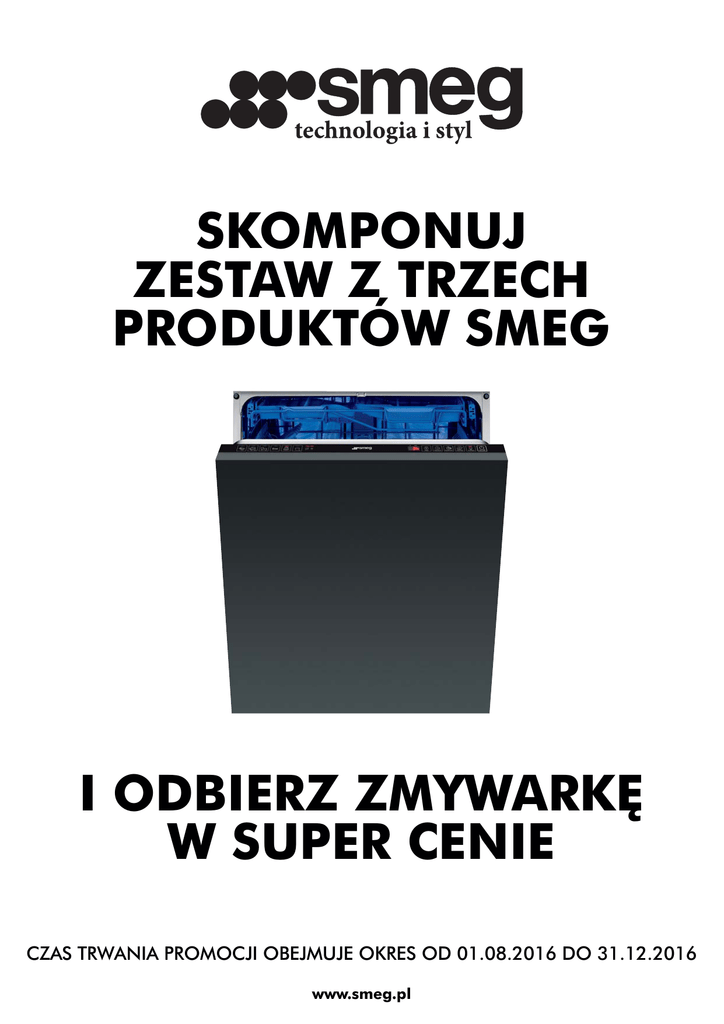 SKOMPONUJ ZESTAW Z TRZECH PRODUKTÓW SMEG I ODBIERZ ZMYWARKĘ W SUPER CENIE CZAS TRWANIA PROMOCJI OBEJMUJE OKRES OD 01.08.2016 DO 31.12.2016 www.smeg.pl PROMOCYJNE ZMYWARKI: ST733TL STA6539L3 Zmywarka do naczyń z panelem ukrytym, szerokość 60 cm, funkcja oszczędzania energii EnerSave A+++, oświetlenie wnętrza komory Eco 5 499 ZŁ 4 699 ZŁ 2 599 ZŁ 1 599 ZŁ Auto 45°-65° Eco ST523 Eco Zmywarka do naczyń z panelem ukrytym, szerokość 60 cm, funkcja oszczędzania energii EnerSave A+++ Auto 45°-65° STA4503 Zmywarka do naczyń z panelem ukrytym, szerokość 60 cm, klasa A+ Zmywarka do naczyń z panelem ukrytym, szerokość 45 cm, klasa A 3 199 ZŁ 2 999 ZŁ 599 ZŁ 599 ZŁ Auto 45°-65° Eco Główne postanowienia regulaminu sprzedaży premiowej marki SMEG 1. Organizatorem Akcji czyli sprzedaży premiowej jest Smeg Polska Sp. z o.o. z siedzibą w Warszawie przy ul. Cybernetyki 9. 2. Akcja organizowana jest na terytorium Rzeczypospolitej Polskiej. 3. Czas trwania Promocji obejmuje okres od 01.08.2016 do 31.12.2016 roku lub wyczerpania zapasów Akcji Promocyjnej. 4. Uczestnik Akcji Promocyjnej, klient ostateczny: osoba fizyczna nabywająca zestaw urządzeń do użytku własnego, nie związanego z prowadzeniem działalności gospodarczej, w punkcie handlu detalicznego lub za pośrednictwem studia mebli kuchennych. 5. Szczegółowy regulamin promocji wraz z listą modeli, których zakup uprawnia do zakupu zmywarki w cenie specjalnej dostępny jest na stronie www.smeg.pl w zakładce AKTUALNOŚCI. www.smeg.pl