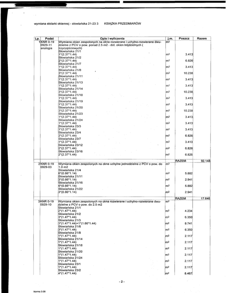 Zestawienie stolarki okiennej (zespolonej) przewidzianej do wymiany w budynku położonym przy ul. Słowiańskiej 21-23 w Nysie – z uwzględnieniem dotychczasowych jak i nowych schematów funkcjonalnych okien – załącznik nr 2.1 Okno dwuczęściowe (R) z lufcikiem – szt. 18 Okno jednoskrzydłowe (RU) – szt. 18 114 86 86 obecny schemat funkcjonalny schemat funkcjonalny okna po wymianie Okno dwuskrzydłowe (R+R) – szt.41 Okno dwuskrzydłowe (RU+R) – szt. 41 144 147 obecny schemat funkcjonalny 147 schemat funkcjonalny okna po wymianie Okno dwuskrzydłowe (R+R) –szt. 1 Okno dwuskrzydłowe (RU+R) – szt. 1 144 166 166 obecny schemat funkcjonalny schemat funkcjonalny okna po wymianie Okno trzyczęściowe R+FIX+R – szt. 27 Okno trzyczęściowe RU+R+R – szt. 27 144 237 237 obecny schemat funkcjonalny schemat funkcjonalny po wymianie okna Drzwi balkonowe R – szt. 6 Drzwi balkonowe RU – szt. 6 252 89 89 obecny schemat funkcjonalny schemat funkcjonalny po wymianie drzwi okno dwuskrzydłowe (R+R) – szt. 5 okno dwuskrzydłowe (RU+R) – szt. 5 113 180 obecny schemat funkcjonalny 180 schemat funkcjonalny po wymianie okna okno dwuskrzydłowe (R+R) – szt. 5 okno dwuskrzydłowe (RU+R) – szt. 5 113 174 174 obecny schemat funkcjonalny schemat funkcjonalny okna po wymianie okno dwuskrzydłowe (U+U) – szt. 23 okno jednoskrzydłowe (RU) - szt. 23 120 152 obecny schemat funkcjonalny 152 schemat funkcjonalny okna po wymianie Uwaga !!! Wszystkie wymiary podano w [cm]. Stanowią one tylko orientacyjne odzwierciedlenie istniejących otworów okiennych (w świetle wewnętrznych ościeży). Obowiązkiem wykonawcy jest pomiar w/w otworów okiennych przed wykonaniem nowych okien. Zestawienie stolarki okiennej przewidzianej do wymiany – Słowiańska 21-23 – załącznik nr 2. Słowiańska Nr lokalu 21/1 21/2 21/3 21/4 21/6 21/7 21/8 21/11 21/13 21/14 21/16 21/18 21/19 21/20 21/22 21/23 21/24 23/1 23/2 23/3 23/4 23/5 23/6 23/7 23/9 23/10 23/12 23/16 21 – klatka schodowa (2,37*1,44) 1 2 1 3 1 1 3 1 1 3 1 1 1 2 - (1,47*1,44) 2 3 3 3 1 1 1 1 1 1 4 2 4 1 2 2 - 4 2 4 4 - Typ/ ilość okien/drzwi balkonowych do wymiany (0,86*1,14) (1,66*1,44) (0,89*2,52) (1,80*1,13) 1 6 2 3 2 6 2 3 - - - 5 (1,74*1,13) - (1,52*1,20) - - - 23 – klatka schodowa Magazyny (20szt.) + kwiaciarnia (2szt.) + sklep spożywczy (1szt.) Razem : Razem : - - - - - - 5 - - - - - - - - 23 27 41 18 1 6 5 5 23 126 Uwaga !!! Wszystkie wymiary podano w [cm]. Stanowią one tylko orientacyjne odzwierciedlenie istniejących otworów okiennych (w świetle wewnętrznych ościeży). Obowiązkiem wykonawcy jest pomiar w/w otworów okiennych przed wykonaniem nowych okien. Zestawienie parapetów przewidzianych do wymiany (z lastryko na PCV o szerokości 20cm) – Słowiańska 21-23 : dotyczy tylko lokali mieszkalnych – załącznik nr 2.2 Słowiańska Nr lokalu 247 cm 157 cm 96 cm 176 cm 21/1 1 2 21/2 2 3 21/3 3 1 21/4 6 21/6 3 21/7 1 21/8 3 1 21/11 1 3 21/13 1 21/14 3 1 21/15 2 21/16 6 21/18 1 1 21/19 1 21/20 3 1 21/22 3 21/23 1 21/24 1 1 23/1 1 23/2 4 23/3 1 2 23/4 2 23/5 - 4 - - 23/6 23/7 23/9 23/10 23/12 23/16 Razem : 1 2 2 29 4 2 4 4 41 18 1 RAZEM : 89