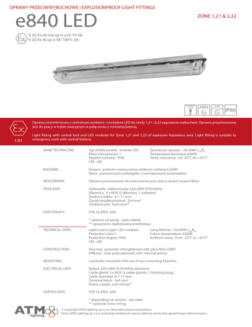 OPRAWY PRZECIWWYBUCHOWE | EXPLOSIONPROOF LIGHT FITTINGS e840 LED ZONE 1,21 & 2,22 II 2G Ex eb mb op is q IIC T4 Gb II 2D Ex tb op is IIIC T80°C Db CENTRAL LOCK ATEX ZONE 1,21 & 2,22 IP66 Oprawa oświetleniowa z centralnym zamkiem i modułami LED do strefy 1,21 i 2,22 zagrożenia wybuchem. Oprawa przystosowana jest do pracy w trybie awaryjnym w połączeniu z centralną baterią. 1.01 Light fitting with central lock and LED modules for Zone 1,21 and 2,22 of explosion hazardous area. Light fitting is suitable to emergency work with central battery. DANE TECHNICZNE: Typ źródła światła: moduły LED Żywotność oprawy: >50.000h L80B10 Klasa ochronności: I Temperatura barwowa: 6500K Stopień ochrony: IP66 Temp. otoczenia: od -25°C do +55°C* CRI: >80 BUDOWA: Korpus: poliester wzmocniony włóknem szklanym (GRP) Klosz: przezroczysty poliwęglan z wewnętrznymi pryzmatami MOCOWANIE: Oprawa przeznaczona do mocowania przy użyciu dwóch wsporników. ZASILANIE: Statecznik: elektroniczny 220-240V 0/50/60Hz, Dławnica: 3 x M25 (2 dławnice, 1 zaślepka) Średnica kabla: ø 7-17 mm Zaciski przyłączeniowe: 3x4 mm2 Okablowanie: końcowe** CERTYFIKATY: PTB 16 ATEX 2001 * zależnie od wersji - patrz tabela ** opcjonalne okablowanie przelotowe TECHNICAL DATA: Light source type: LED modules Long lifetime: >50.000h L80B10 Protection class: IColour temperature: 6500K Protection degree: IP66 Ambient temp.: from -25°C to +55°C* CRI: >80 CONSTRUCTION: Housing: polyester strenghtened with glass fibre (GRP) Diffuser: clear polycarbonate with internal prisms MOUNTING: Luminaire mounted with use of two mounting brackets. ELECTRICAL UNIT: Ballast: 220-240V 0/50/60Hz electronic Cable gland: 3 x M25 (2 cable glands, 1 blanking plug) Cable diameter: ø 7-17 mm Terminal block: 3x4 mm2 Power supply: end wiring** CERTIFICATES: PTB 16 ATEX 2001 * depending on version - see table ** optional cross wiring © Copyright ATM Lighting sp. z o.o. Wszystkie prawa zastrzeżone. Firma ATM Lighting sp. z o.o. zastrzega możliwość wprowadzenia zmian bez uprzedniego informowania. OPRAWY PRZECIWWYBUCHOWE | EXPLOSIONPROOF LIGHT FITTINGS ZONE 1,21 & 2,22 WYMIARY | DIMENSIONS FOTOMETRIA | PHOTOMETRY L ø9 L1 S H B TYP | TYPE e840 LED L 1355 L1 700 B 226 H 175 S 150 ZESTAWIENIE TYPÓW | TYPES COMPARISON TYP OPRAWY TYPE OF LIGHT FITTING e840 LED 12L42 e840 LED 12L60 e840 LED 12L85 STRUMIEŃ OPRAWY [lm] MOC POBIERANA [W] SPRAWNOŚĆ [lm/W] ZAMIENNIK T8 LUMINOUS FLUX [lm] POWER CONSUMPTION [W] EFFICIENCY [lm/W] REPLACEMENT T8 34 2x36 4240 125 47 2x58 5610 119 65 3x58 8350 128 1.02 PORÓWNANIE OSZCZĘDNOŚCI | SAVINGS COMPARISON TYP OPRAWY TYPE OF LIGHT FITTING e840 LED 12L42 e840 LED 12L60 e840 LED 12L85 OSZCZĘDNOŚCI* SAVINGS* 56% 63% 66% OSZCZĘDNOŚĆ SYSTEMU 1:1** SYSTEM SAVINGS 1:1** 53% 54% 57% * oszczędności zużycia energii elektrycznej oprawy e840 LED w porównaniu do opraw innych producentów wyposażonych w źródła światła T8 | power consumption savings of e840 LED luminaire compared to other producers standard T8 light fittings ** oszczędności zużycia energii elektrycznej oprawy e840 LED w porównaniu do opraw innych producentów wyposażonych w źródła światła T8, przy założeniu zachowania jednakowego strumienia świetlnego porównywanych urządzeń | power consumption savings of e840 LED luminaire compared to other producers standard T8 light fittings, assuming equal light flux of compared devices TEMPERATURY PRACY | AMBIENT TEMPERATURES TYP OPRAWY TYPE OF LIGHT FITTING e840 LED 12L42 e840 LED 12L60 e840 LED 12L85 MINIMALNA TEMPERATURA OTOCZENIA [°C] MINIMUM AMBIENT TEMPERATURE [°C] -25 -25 -25 MAKSYMALNA TEMPERATURA OTOCZENIA [°C]*** MAXIMUM AMBIENT TEMPERATURE [°C]*** +55 +55 +50 DODATKOWE OPCJE | ADDITIONAL OPTIONS *** Dostępne specjalne wykonanie do temperatur -25°C to +65°C *** Special version for -25°C to +65°C ambient temperature © Copyright ATM Lighting sp. z o.o. All rights reserved. Technical modification reserved without prior notice. www.atmlighting.pl [email protected] KONFIGURACJA OPRAW | LIGHT FITTING CONFIGURATION 20 10 M 20 PC PC 22 11 P AL PM 30 20 PCI GS GL 33 40 21 22 NIRO SAN SGL typ modułu LED, ich ilość oraz prąd sterowania są z góry ustalone dla danej oprawy LED module type, quantity, forward current are specified for each typ of light fitting 35E - 230V, 0/50-60Hz 34E - 230V, 50-60Hz 11E - 24VDC 20 - 2 żyły końcowe 2 wires ending 22 - 2 żyły przelotowe 2 wires through 30 - 3 żyły końcowe 3 wires ending 33 - 3 żyły przelotowe 3 wires through 40 - 4 żyły końcowe 4 wires ending 44 - 4 żyły przelotowe 4 wires through 10, 11, 20, 21, 22 - układ dławnic pokazano na rysunku poniżej cable glands entries positions are shown below 10 11 20 21 P - dławnica z tworzywa sztucznego plastic cable gland M - dławnica z metalu metal cable gland PCI - przepust kablowy o średnicy Ø20 plastic cable inlets Ø20 22 20 - dławnica M20 M20 cable gland 25 - dławnica M25 M25 cable gland PC - poliwęglan polycarbonate AL - aluminium GS - stal ocynkowana galvanized steel NIRO - stal nierdzewna stainless steel GRP - poliester wzmocniony włóknem zklanym fibre glass strengthened polyester PC - poliwęglan polycarbonate PM - PMMA GL - szkło hartowane tempered glass SAN - kopolimer styrenu i akrylonitrylu styrene acrylonitrile resin SGL - safety-glass dodatkowe opcje additional options materiał klosza materiał obudowy housing material wpusty kablowe cable inlets okablowanie wiring zasilanie power supply prąd sterowania driving current 44 ilość /quantity typ modułu LED / LED module type E przybliżona długość approximate length typ type grupa group L ED ZESTAWIENIE IKON | ICON LIST ATEX oprawa posiada certyfikat ATEX light fitting with ATEX certificate CENTRAL ZONE 1,21 & 2,22 oprawa do strefy 1,21 & 2,22 light fitting for Zone 1,21 & 2,22 LED OPTICS ZONE 2&22 oprawa do strefy 2,22 light fittingfor Zone 2,22 IP65 IP66 IP67 IP68 150J PLK LINE CONNECTION NIRO SEC