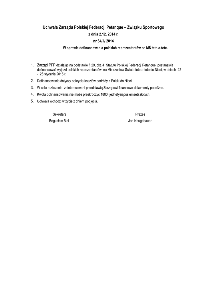 Uchwała Zarządu Polskiej Federacji Petanque – Związku Sportowego z dnia 2.12. 2014 r. nr 64/II/ 2014 W sprawie dofinansowania polskich reprezentantów na MŚ tete-a-tete. 1. Zarząd PFP działając na podstawie § 29, pkt. 4 Statutu Polskiej Federacji Petanque postanawia dofinansować wyjazd polskich reprezentantów na Mistrzostwa Świata tete-a-tete do Nicei, w dniach 22 - 26 stycznia 2015 r. 2. Dofinansowanie dotyczy pokrycia kosztów podróży z Polski do Nicei. 3. W celu rozliczenia zainteresowani przedstawią Zarządowi finansowe dokumenty podróżne. 4. Kwota dofinansowania nie może przekroczyć 1800 (jednetysiącosiemset) złotych. 5. Uchwała wchodzi w życie z dniem podjęcia. Sekretarz Prezes Bogusław Biel Jan Neugebauer