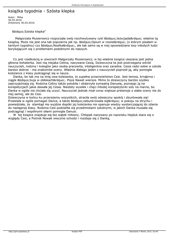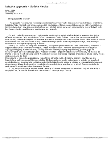Publiczne Gimnazjum w Popielawach książka tygodnia - Szósta klepka Autor: Milka 30.03.2010. Zmieniony 30.03.2010. „Szósta klepka" Małgorzata Musierowicz rozpoczęła swój rozchwytywany cykl „Jeżycjada” właśnie tą książką. Może nie jest ona tak popularna jak np. „Opium w rosole” (o którym pisałam w tamtym tygodniu) czy „Noelka”, ale tak samo są w niej opowiedziane losy młodych ludzi borykających się z problemami podobnymi do naszych. Co jest rzadkością w utworach Małgorzaty Musierowicz, w tej właśnie książce ukazana jest jedna główna bohaterka. Jest nią niejaka Celina, nazywana Cesią. Dziewczyna ta jest postrzegana wśród nauczycieli, rodziny i kolegów jako osoba pracowita, inteligentna oraz zaradna. Cesia radzi sobie w szkole bardzo dobrze - ma znakomite oceny. Właśnie dlatego jeden z nauczycieli poprosił ją, aby pomogła koleżance z klasy podciągnąć się w nauce. Danka, bo tak ma na imię owa koleżanka, to zupełne przeciwieństwo Cesi. Jest leniwa, krnąbrna i ciągle „buja w obłokach”. Pisze Nawet wiersze. Mimo to dziewczyny bardzo szybko zaprzyjaźniają się. Rodzina Celiny także polubiła i obdarzyła sympatią Danusię, poznając ją na korepetycjach jakie dawała jej Cesia. Niestety wysiłek i chęci młodej korepetytorki szły na marne, bo Danka w ogóle nie chciała się uczyć. Nauczyciel jednak miał coraz większe pretensje o słabe oceny nie do niej samej, ale do Cesi. Dziewczyna w końcu ku przerażeniu wszystkich, straciła swój odwieczny spokój i zbuntowała się! Przestała w ogóle pomagać Dance, a także „zabunkrowała się” w pokoju na strychu i powiedziała, że stamtąd nie wyjdzie dopóki jej koleżanka nie opanuje wiedzy wystarczającej do zdania do następnej klasy. Rodzina Cesi podzieliła się przedmiotami szkolnymi, w jakich Danka musiała się podciągnąć i wspólnymi siłami pomogła Danusi. W tej książce znajduje się tez wątek miłosny. Chłopak nazywany po nazwisku Hajduk stara się o względy Cesi, a Piotrek Nowak wiecznie schodzi i rozstaje się z Danką. http://gim-popielawy.pl Kreator PDF Utworzono 7 March, 2017, 02:49
