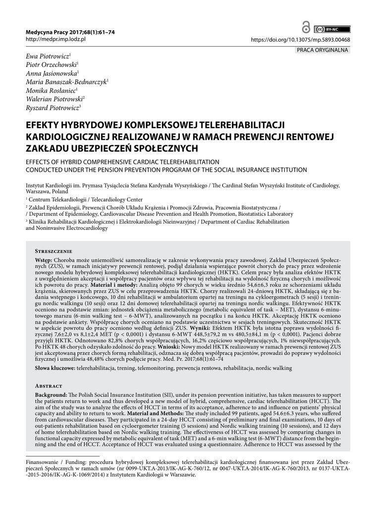 Medycyna Pracy 2017;68(1):61–74 http://medpr.imp.lodz.pl https://doi.org/10.13075/mp.5893.00468 Ewa Piotrowicz1 Piotr Orzechowski1 Anna Jasionowska1 Maria Banaszak-Bednarczyk1 Monika Rosłaniec1 Walerian Piotrowski2 Ryszard Piotrowicz3 PRACA ORYGINALNA EFEKTY HYBRYDOWEJ KOMPLEKSOWEJ TELEREHABILITACJI KARDIOLOGICZNEJ REALIZOWANEJ W RAMACH PREWENCJI RENTOWEJ ZAKŁADU UBEZPIECZEŃ SPOŁECZNYCH EFFECTS OF HYBRID COMPREHENSIVE CARDIAC TELEREHABILITATION CONDUCTED UNDER THE PENSION PREVENTION PROGRAM OF THE SOCIAL INSURANCE INSTITUTION Instytut Kardiologii im. Prymasa Tysiąclecia Stefana Kardynała Wyszyńskiego / The Cardinal Stefan Wyszyński Institute of Cardiology, Warszawa, Poland 1 Centrum Telekardiologii / Telecardiology Center 2 Zakład Epidemiologii, Prewencji Chorób Układu Krążenia i Promocji Zdrowia, Pracownia Biostatystyczna / / Department of Epidemiology, Cardiovascular Disease Prevention and Health Promotion, Biostatistics Laboratory 3 Klinika Rehabilitacji Kardiologicznej i Elektrokardiologii Nieinwazyjnej / Department of Cardiac Rehabilitation and Noninvasive Electrocardiology Streszczenie Wstęp: Choroba może uniemożliwić samorealizację w zakresie wykonywania pracy zawodowej. Zakład Ubezpieczeń Społecznych (ZUS), w ramach inicjatywy prewencji rentowej, podjął działania wspierające powrót chorych do pracy przez wdrożenie nowego modelu hybrydowej kompleksowej telerehabilitacji kardiologicznej (HKTK). Celem pracy była analiza efektów HKTK z uwzględnieniem akceptacji i współpracy pacjentów oraz wpływu tej rehabilitacji na wydolność fizyczną chorych i możliwość ich powrotu do pracy. Materiał i metody: Analizą objęto 99 chorych w wieku średnio 54,6±6,3 roku ze schorzeniami układu krążenia, skierowanych przez ZUS w celu przeprowadzenia HKTK. Chorzy realizowali 24-dniową HKTK, składającą się z badania wstępnego i końcowego, 10 dni rehabilitacji w ambulatorium opartej na treningu na cykloergometrach (5 sesji) i treningu nordic walkingu (10 sesji) oraz 12 dni domowej telerehabilitacji opartej na treningu nordic walkingu. Efektywność HKTK oceniono na podstawie zmian: jednostek obciążenia metabolicznego (metabolic equivalent of task – MET), dystansu 6-minutowego marszu (6-min walking test – 6-MWT), analizowanych na początku i na końcu HKTK. Akceptację HKTK oceniono na podstawie ankiety. Współpracę chorych oceniano na podstawie uczestnictwa w sesjach treningowych. Skuteczność HKTK w aspekcie powrotu do pracy oceniono według definicji ZUS. Wyniki: Efektem HKTK była istotna poprawa wydolności fizycznej 7,6±2,0 vs 8,1±2,4 MET (p < 0,0001) i dystansu 6-MWT 448,5±79,2 m vs 480,5±84,1 m (p < 0,0001). Pacjenci dobrze przyjęli HKTK. Odnotowano 82,8% chorych współpracujących, 16,2% częściowo współpracujących, 1% niewspółpracujących. Po HKTK 48 chorych odzyskało zdolność do pracy. Wnioski: Nowy model HKTK realizowany w ramach prewencji rentowej ZUS jest akceptowaną przez chorych formą rehabilitacji, odznacza się dobrą współpracą pacjentów, prowadzi do poprawy wydolności fizycznej i umożliwia 48,48% chorych podjęcie pracy. Med. Pr. 2017;68(1):61–74 Słowa kluczowe: telerehabilitacja, trening, telemonitoring, prewencja rentowa, rehabilitacja, nordic walking Abstract Background: The Polish Social Insurance Institution (SII), under its pension prevention initiative, has taken measures to support the patients return to work and thus developed a new model of hybrid, comprehensive, cardiac telerehabilitation (HCCT). The aim of the study was to analyze the effects of HCCT in terms of its acceptance, adherence to and influence on patients’ physical capacity and ability to return to work. Material and Methods: The study included 99 patients, aged 54.6±6.3 years, who suffered from cardiovascular diseases. They participated in a 24-day HCCT consisting of preliminary and final examinations, 10 days of out-patients rehabilitation based on cycloergometer training (5 sessions) and Nordic walking training (10 sessions), and 12 days of home telerehabilitation based on Nordic walking training. The effectiveness of HCCT was assessed by comparing changes in functional capacity expressed by metabolic equivalent of task (MET) and a 6-min walking test (6-MWT) distance from the beginning and the end of HCCT. Acceptance of HCCT was evaluated using a questionnaire. Adherence to HCCT was assessed by the Finansowanie / Funding: procedura hybrydowej kompleksowej telerehabilitacji kardiologicznej finansowana jest przez Zakład Ubezpieczeń Społecznych w ramach umów (nr 0099-UKT.A-2013/IK-AG-K-760/12, nr 0047-UKT.A-2014/IK-AG-K-760/2013, nr 0137-UKT.A-2015-2016/IK-AG-K-1069/2014) z Instytutem Kardiologii w Warszawie. 62 E. Piotrowicz i wsp. Nr 1 patients’ participation in the training sessions. Effectiveness of HCCT in terms of return to work was assessed according to SII definition. Results: Hybrid, comprehensive, cardiac telerehabilitation resulted in significant improvement of functional capacity 7.6±2.0 vs. 8.1±2.4 MET (p < 0.0001) and distance in 6-MWT 448.5±79.2 m vs. 480.5±84.1 m (p < 0.0001). There were 82.8% of adherent, 16.2% of partially adherent and 1% of non-adherent patients. After HCCT 48 patients were able to return to work. Conclusions: Hybrid, comprehensive, cardiac telerehabilitation was well accepted and led to the improvement of the patients’ physical capacity. Adherence to HCCT was high and allowed 48.48% of patients return to work. Med Pr 2017;68(1):61–74 Key words: telerehabilitation, training, telemonitoring, pension prevention, rehabilitation, Nordic walking Autorka do korespondencji / Corresponding author: Ewa Piotrowicz, Instytut Kardiologii im. Prymasa Tysiąclecia Stefana Kardynała Wyszyńskiego, Centrum Telekardiologii, ul. Alpejska 42, 04-628 Warszawa, e-mail: [email protected] Nadesłano: 10 lutego 2016, zatwierdzono: 14 czerwca 2016 WSTĘP Praca jest naturalną ludzką potrzebą. Chor