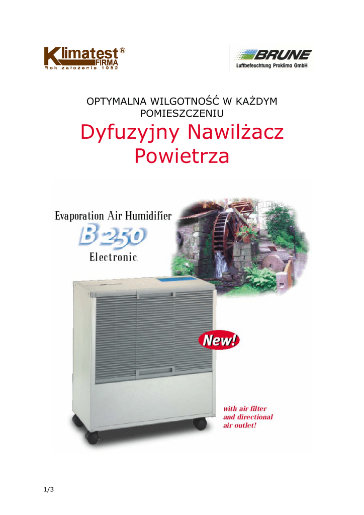 OPTYMALNA WILGOTNOŚĆ W KAŻDYM POMIESZCZENIU Dyfuzyjny Nawilżacz Powietrza 1/3 ZASADA DZIAŁANIA Nawilżacz B250 działa na zasadzie zimnego odparowania. Zasysane przez wentylator powietrze przechodzi przez specjalny filtr pełniący funkcje oczyszczającą. Następnie przechodzi przez porowaty, obracający się wilgotny dysk o bardzo dużej powierzchni. Po przejściu przez dysk nawilżone powietrze wydmuchiwane jest na zewnątrz. WENTYLATOR W zależności od potrzeby można wybrać 2 różne prędkości wentylatora lub funkcję auto. W trybie auto prędkość wentylatora dopasowywana jest automatycznie do różnicy pomiędzy żądaną a aktualną wilgotnością. OBSŁUGA Prosty w obsłudze panel sterujący pozwala na łatwe ustawienie wymaganego poziomu wilgotności i prędkości wentylatora. POMIAR WILGOTNOŚCI POWIETRZA Zintegrowany elektroniczny czujnik mierzy aktualną wilgotność względną i pokazuje jej wartość na wyświetlaczu. ZABEZPIECZENIE Aby uniknąć zmiany nastawionej wartości wilgotności przez osoby niepowołane można zastosować kod blokujący klawiaturę. Taka funkcja może być przydatna w przypadku, gdy urządzenie użytkowane jest w pomieszczeniach publicznych np. w muzeum lub galerii. 2/3 POZIOM WODY Na panelu sterującym możemy odczytać poziom wody w nawilżaczu. Jeśli zbiornik jest pusty to urządzenie samoczynnie się wyłącza i zapala się lampka kontrolna. OPCJE Nawilżacz może być na stałe podłączony do instalacji wodnej, wówczas uzupełnianie wody w zbiorniku odbywa się automatycznie. Dla takiej instalacji może on być także wyposażony w system zabezpieczający przed wyciekiem wody i zalaniem pomieszczenia. ZALETY • Elektroniczne sterowanie • Zgodny z normami UE • Szybkie podłączenie • Stacjonarny lub mobilny • Łatwy w obsłudze panel programujący • Ekonomiczny w obsłudze: mały pobór mocy • Wbudowany filtr powietrza • Dwu-poziomowy wentylator plus funkcja auto • Duża powierzchnia parowania • Użycie zwykłej wody wodociągowej • Nie powoduje osadzania się wapna na wyposażeniu pomieszczeń. DANE TECHNICZNE • Zasilanie: 230V / 50 Hz • Pobór mocy: ok. 50 W • Powierzchnia parowania: 3m2 • Przepływ powietrza:300 /500 m3/godz. • Zbiornik wody: ok. 25 litrów • Wydajność: 1.2 l/godz. przy 23oC i 45 %RH • Przeznaczony dla pomieszczeń o powierzchni:180 m2, (ok. 500m3) • Poziom hałasu: 30-40 dBA • Wymiary (Szer x Wys x Głęb.): 60 x 67 x 30 cm • Waga pustego: 20 kg DYSTRYBUTOR W POLSCE: FIRMA KLIMATEST Ul. Pilczycka 198F 54-144 Wrocław Tel/faks 71 354 06 80/ 71 354 06 92 FIRMA KLIMATEST Ul. Wólczyńska 133 01-919 Warszawa Tel/faks 22 864 04 35 [email protected] [email protected] 3/3