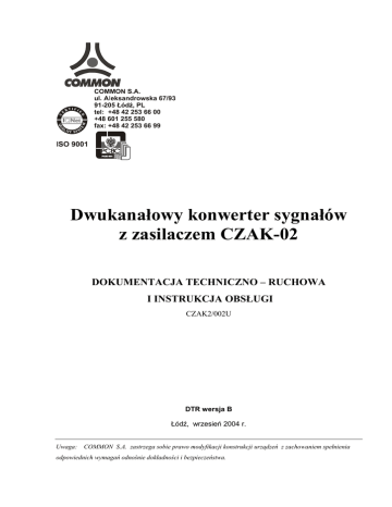 Dwukanałowy konwerter sygnałów z zasilaczem CZAK-02 DOKUMENTACJA TECHNICZNO – RUCHOWA I INSTRUKCJA OBSŁUGI CZAK2/002U DTR wersja B Łódź, wrzesień 2004 r. Uwaga: COMMON S.A. zastrzega sobie prawo modyfikacji konstrukcji urządzeń z zachowaniem spełnienia odpowiednich wymagań odnośnie dokładności i bezpieczeństwa. SPIS TREŚCI 1. WPROWADZENIE......................................................................................................................................... 3 2. PODSTAWOWE DANE CZAK-02 ............................................................................................................... 5 2.1. 2.2. WARUNKI UśYTKOWANIA CZAK-02 ........................................................................................................ 5 PODSTAWOWE DANE TECHNICZNE ............................................................................................................ 5 3. MONTAś I INSTALACJA CZAK-02........................................................................................................... 6 4. PAKOWANIE, PRZECHOWYWANIE I TRANSPORT............................................................................ 8 5. OCHRONA ŚRODOWISKA.......................................................................................................................... 9 5.1 5.2 POSTĘPOWANIE Z ODPADAMI OPAKOWANIOWYMI .................................................................................... 9 POSTĘPOWANIE Z BATERIAMI I URZĄDZENIAMI PO ZAKOŃCZENIU UśYTKOWANIA .................................... 9 CZAK-02 Dokumentacja techniczno-ruchowa 2 1. Wprowadzenie Zadaniem urządzenia CZAK-02 jest zasilanie maksymalnie np. 3 korektorów CMK-02 lub 6 rejestratorów CRI-02 połączonych równolegle lub taka liczbę urządzeń, których suma pobieranych prądów znamionowych nie przekracza znamionowej wydajności prądowej CZAK-02. Musi być przy tym zachowana zgodność szczególnych warunków stosowania. Druga jego funkcja to konwersja sygnałów RS-GAZ2 - RS-232, słuŜąca przesyłaniu danych pomiędzy korektorami znajdującym się w strefie zagroŜonej wybuchem a komputerem PC. MoŜe współpracować równieŜ z innymi urządzeniami wyposaŜonymi w złącze RS-GAZ2 przy spełnieniu szczegółowych warunków stosowania. CZAK-02 posiada dwa niezaleŜne kanały transmisyjne z izolacją galwaniczną pomiędzy częścią iskrobezpieczną (RS-GAZ2) a nie iskrobezpieczną (RS-232). Prędkość przesyłania danych mieści się w zakresie pomiędzy 1200 a 115200 bitów na sekundę. Dzięki wewnętrznemu mechanizmowi wykrywania prędkości jest ona ustawiana automatycznie. Zasilacz wewnętrzny omawianego urządzenia jest iskrobezpiecznym źródłem napięcia o wartości 5,6V i wydajności prądowej do ok. 75mA. Posiada on zabezpieczenie przeciwzwarciowe. Całość zasilana jest z sieci AC 230V. OBWODY ISKROBEZPIECZNE RS-232 COM 1 RS-232 COM 2 SIEĆ AC 230V COM 2 RS-GAZ2 COM 1 RS-GAZ2 Rys. 1. Widok konwertera sygnałów z zasilaczem CZAK-02 CZAK-02 Dokumentacja techniczno-ruchowa 3 GND RXD L A N 220 V AC PE T TXD RS-2 32 - 2 GND RXD COM 1 V+ B A T TXD RS-2 32 - 1 COM2 V+ B Rys. 2. Widok konwertera sygnałów z zasilaczem – listwa zaciskowa 2- osłona plexi, 4- złącze śrubowe, 5- gniazdo bezpiecznikowe (40mA), 10- dławnica DW9, 11- plomba firmowa CZAK-02 Dokumentacja techniczno-ruchowa 4 2. Podstawowe dane CZAK-02 2.1. Warunki uŜytkowania CZAK-02 Temperatura otoczenia: -25°C ÷ 55°C Wilgotność względna: max 95% w temp 55°C Zakłócenia elektromagnetyczne: charakter i poziom zakłóceń odpowiada wymaganiom normy zakładowej PGNiG oraz SP 6, Sr 9 Stopień ochrony obudowy: IP54 Oznaczenie budowy przeciwwybuchowej: II (2)G [ EEx ia ] IIB Oznaczenie i numer certyfikatu: 1453 KDB 04 ATEX 218 Zgodność z normami: PN-EN 50014:2002(U), PN-EN 50020:2003(U) 2.2. Podstawowe dane techniczne Moc znamionowa: 3,1VA Napięcie znamionowe: 230V +5/-10 %, 50Hz Znamionowy prąd wyjściowy: ok. 75mA Znamionowe napięcie wyjściowe: 5,6V Maksymalne parametry na wyjściach: Uo = 5,88V, Po = 0,61W, Io = 0,28A, Ci = 1nF, Li ≈ 0 Co = 1000µF, Lo = 1mH Prędkość transmisji danych: 1200 do 115200 bitów/s Gabaryty: 200x120x80mm CZAK-02 Dokumentacja techniczno-ruchowa 5 3. MontaŜ i instalacja CZAK-02 Dwukanałowy konwerter sygnałów z zasilaczem przystosowany jest do montaŜu bezpośrednio na tylnej płycie montaŜowej szafy AKP lub ścianie pomieszczenia AKP, tylko i wyłącznie poza strefą EX w pomieszczeniach zabezpieczonych przed dostępem osób nie przeszkolonych w zakresie serwisu i eksploatacji CZAK-02. MontaŜu naleŜy dokonać za pomocą 4 wkrętów M4, których rozmieszczenie przedstawiono na rysunku poniŜej. Rys. 3. Rozmieszczenie otworów mocujących CZAK-02 Obwody iskrobezpieczne CZAK-02 mogą współpracować z obwodami iskrobezpiecznymi urządzeń zainstalowanych w strefach zagroŜonych wybuchem mieszanin par, gazów i mgieł wybuchowych z powietrzem zaliczanych do grupy wybuchowości IIA i IIB. Połączenia elektryczne zewnętrznych obwodów iskrobezpiecznych naleŜy wykonać przy pomocy przewodów wieloŜyłowych z Ŝyłami wykonanymi w postaci linek wielodrutowych. NaleŜy stosować przewody: a) Do podłączenia kabla sieciowego (zaciski 230V AC) – kabel trójŜyłowy np.: OMY 3x1,0mm2 z ewentualną wtyczką (np. WB-6). Koniecznie musi być dołączony przewód ochronny PE w kolorze Ŝółto-zielonym zarówno od strony urządzenia jak i zasilania (zewnętrzna średnica kabla od 5mm do 8,5mm). b) Do podłączania zewnętrznych obwodów iskrobezpiecznych (zaciski COM1 i COM2) – cztery Ŝyły bez ekranu np.: LIYY 4x1,0mm2 (zewnętrzna średnica kabla od 5mm do 8,5mm) CZAK-02 Dokumentacja techniczno-ruchowa 6 Tabela 1. Dobór przewodów po stronie iskrobezpiecznej Odległość RS-GAZ2 do 100m LIYY 4x0,25mm2 do 200m LIYY 4x0,5mm2 do 400m LIYY 4x1mm2 powyŜej Parametry pętli muszą spełniać: Rp< 30Ω, Lp ≤ 1mH – Li Rp = 2 * RCu ; Lp + Li 