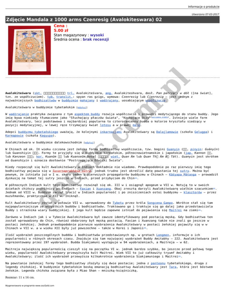 Informacje o produkcie Utworzono 07-03-2017 Zdjęcie Mandala z 1000 arms Czenresig (Avalokiteswara) 02 Cena : 5.00 zł m .p l Stan magazynowy : wysoki Średnia ocena : brak recenzji Awalokiteśwara (skt. अवलोकितेश्वर trl. Avalokiteśvara, ang. Avalokiteshvara, dosł. Pan patrzący w dół ([na świat], tzn. ze współczuciem). tyb. translit.: spyan ras gzigs, wymowa: Czenrezig lub Cienrezig – jest jednym z najważniejszych bodhisattwów w buddyzmie mahajany i wadżrajany, uosabiającym współczucie. Avalokiteśwara w buddyzmie tybetańskim [edytuj] .c o W wadżrajanie praktyka związana z tym aspektem buddy rozwija współczucie i prowadzi medytującego do stanu buddy. Jego imię bywa niekiedy tłumaczone jako "Słuchający płaczów świata", "Kochające Oczy"[potrzebne źródło]. Istnieje wiele form Avalokiteśvary, lecz podstawowa i najbardziej popularna to czteroramienny budda o kolorze kryształu siedzący w pozycji medytacyjnej, w lewej ręce trzymający kwiat lotosu a w prawej malę. Adepci buddyzmu tybetańskiego uważają, że kolejnymi inkarnacjami Avalokiteśwary są Dalajlamowie (szkoła Gelugpa) i Karmapowie (szkoła Kagyupa). Avalokiteśwara w buddyzmie dalekowschodnim [edytuj] es is W Chinach od ok. IX wieku czczona jest żeńska forma bodhisattwy współczucia, tzw. bogini Guanyin (觀音, pinyin: Guānyīn) lub Guanshiyin 観世音. Formy te przyjęły się w buddyzmie koreańskim, północnowietnamskim i japońskim (jap. Kannon 観音, lub Kanzeon 観世音; kor. Kuanŭm 관음 lub Kuanseŭm bosal 관세음보살; wiet. Quan Âm lub Quan Thế Âm Bồ Tát). Guanyin jest skrótem od Guanshiyin i oznacza dosłownie "Postrzegająca Dźwięki Świata". Kiedy rozpoczął się kult Awalokiteśwary w Indiach dokładnie nie wiadomo. Prawdopodobnie po raz pierwszy imię tego bodhisattwy pojawia się w Suvarṇaprabhāsa sūtra, jednak trudno jest określić datę powstania tej sutry. Można być pewnym, że istniała już w I w. skoro jeden z pierwszych propagatorów buddyzmu w Chinach – Kāśyapa Mātaṇga – prowadził dyskusję na temat tej sutry jeszcze w Indiach, przed przybyciem do Chin[1]. de W północnych Indiach kult tego bodhisattwy rozwinął się ok. III w i osiągnął apogeum w VII w. Notują to w swoich dziełach chińscy podróżnicy po Indiach – Faxian i Xuanzang. Obaj zresztą darzyli Awalokiteśwarę wielkim szacunkiem[2]. Jednak od VIII w. buddyzm zaczął tracić w Indiach popularność i po zniszczeniach ostoi buddyzmu – klasztorów – przez muzułmanów, praktycznie w XII w. zniknął. Kult Awalokiteśwary został w połowie VII w. wprowadzony do Tybetu przez króla Songcena Gampo. Wkrótce stał się tam najpopularniejszym ze wszystkich buddów i bodhisattwów. Traktowano go i traktuje się go dalej jako przedstawiciela Buddy i strażnika wiary buddyjskiej. I jego kult będzie zapewne istniał do pojawienia się Maitrei na ziemi[3]. Zarówno w Indiach jak i w Tybecie Awalokiteśwara był zawsze identyfikowany pod postacią męską. Gdy bodhisattwa ten został wprowadzony do Chin, również obdarzony był męską postacią. Faxian i Xuanzang także nie znali go jeszcze w postaci żeńskiej. Jednak prawdopodobnie pierwsze wyobrażenia Awalokiteśwary w postaci żeńskiej pojawiły się w w Chinach w VII w. a w wieku XII były już powszechne – także w Korei i Japonii[4]. Ilość wyobrażeń poszczególnych buddów i bodhisattwów przedstawionych np. w grotach Longmen, informuje o ich popularności w różnych okresach czasu. Znajduje się tam najwięcej wyobrażeń Buddy Amitabhy – 222. Awalokiteśwara jest reprezentowany przez 197 wyobrażeń. Budda Siakjamuni występuje w 94 wyobrażeniach, a Maitreja – w 62. Maitreja największą popularnością cieszył się na początku VI w. jednak bardzo szybko, bo jeszcze przed połową tego wieku, popularność Awalokiteśwary przewyższyła kult Maitrei. Wiek VII to już całkowity tryumf Amitabhy i Awalokiteśwary; ilość ich wyobrażeń przewyższa kilkakrotnie wyobrażenia Siakjamuniego i Maitrei[5]. Na powstanie żeńskiej formy tego bodhisattwy złożyły się dwie postacie; jedna z panteonu tybetańskiego, druga z legendy chińskiej. W buddyzmie tybetańskim boską emanacją bodhisattwy Awalokiteśwary jest Tara, która jest bóstwem żeńskim. Legenda chińska związana była z Miao Shan – mniszką-księżniczką. Rozmiar: 11 x 16 cm. Wygenerowano w programie www.oscGold.com de m .p l .c o es is