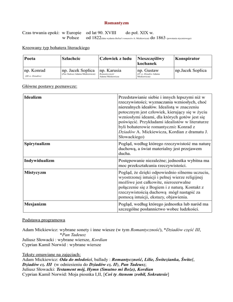 Romantyzm Czas trwania epoki: w Europie w Polsce od lat 90. XVIII do poł. XIX w. od 1822(data wydania Ballad i romansów A. Mickiewicza) do 1863 (powstania styczniowego) Kreowany typ bohatera literackiego Poeta Szlachcic Człowiek z ludu Nieszczęśliwy kochanek Konspirator np. Konrad np. Jacek Soplica np. Karusia np. Gustaw np.Jacek Soplica (Pan Tadeusz Adama Mickiewicza) Romantyczność Adama Mickiewicza (IV cz. Dziadów Adama Mickiewicza) (III cz. Dziadów) Główne postawy poznawcze: Idealizm Przedstawianie siebie i innych lepszymi niż w rzeczywistości; wyznaczania wzniosłych, choć nierealnych ideałów. Idealistą w znaczeniu potocznym jest człowiek, kierujący się w życiu wzniosłymi ideami, dla których gotów jest się poświęcić. Przykładami idealistów w literaturze byli bohaterowie romantyczni: Konrad z Dziadów A. Mickiewicza, Kordian z dramatu J. Słowackiego) Spirytualizm Pogląd, według którego rzeczywistość ma naturę duchową, a świat materialny jest przejawem ducha. Indywidualizm Postępowanie niezależne; jednostka wybitna ma moc przekształcania rzeczywistości. Mistycyzm Pogląd, że dzięki odpowiednio silnemu uczuciu, wyostrzonej intuicji i pełnej wierze religijnej możliwe jest całkowite, nierozerwalne połączenie się z Bogiem i z naturą. Kontakt z rzeczywistością duchową mógł nastąpić za pomocą intuicji, ekstazy, objawienia. Mesjanizm Pogląd, według którego jednostka lub naród ma szczególne posłannictwo wobec ludzkości. Podstawa programowa Adam Mickiewicz: wybrane sonety i inne wiesze (w tym Romantyczność), *Dziadów część III, *Pan Tadeusz Juliusz Słowacki : wybrane wiersze, Kordian Cyprian Kamil Norwid : wybrane wiersze Teksty omawiane na zajęciach: Adam Mickiewicz: Oda do młodości, ballady : Romantyczność, Lilie, Świtezianka, Świteź, Dziadów cz. III (w odniesieniu do Dziadów cz. II), Pan Tadeusz; Juliusz Słowacki: Testament mój, Hymn (Smutno mi Boże), Kordian Cyprian Kamil Norwid: Moja piosnka I,II, [Coś ty Atenom zrobił, Sokratesie]
