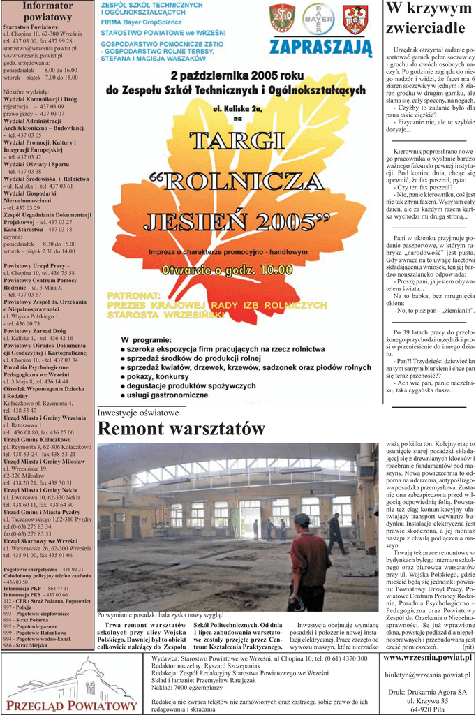 W krzywym zwierciadle Informator powiatowy Starostwo Powiatowe ul. Chopina 10, 62-300 Wrzeœnia tel. 437 03 00, fax 437 99 28 [email protected] www.wrzesnia.powiat.pl godz. urzêdowania: poniedzia³ek 8.00 do 16.00 wtorek – pi¹tek 7.00 do 15.00 Urzêdnik otrzyma³ zadanie posortowaæ garnek pe³en soczewicy i grochu do dwóch osobnych naczyñ. Po godzinie zagl¹da do niego nadzór i widzi, ¿e facet ma 6 ziaren soczewicy w jednym i 8 ziaren grochu w drugim garnku, ale s³ania siê, ca³y spocony, na nogach. - Czy¿by to zadanie by³o dla pana takie ciê¿kie? - Fizycznie nie, ale te szybkie decyzje... Niektóre wydzia³y: Wydzia³ Komunikacji i Dróg rejestracja – 437 03 09 prawo jazdy – 437 03 07 Wydzia³ Administracji Architektoniczno – Budowlanej - tel. 437 03 05 Wydzia³ Promocji, Kultury i Integracji Europejskiej - tel. 437 03 42 Wydzia³ Oœwiaty i Sportu - tel. 437 03 38 Wydzia³ Œrodowiska i Rolnictwa - ul. Kaliska 1, tel. 437 03 61 Wydzia³ Gospodarki Nieruchomoœciami - tel. 437 03 29 Zespó³ Uzgadniania Dokumentacji Projektowej - tel. 437 03 27 Kasa Starostwa - 437 03 18 czynna: poniedzia³ek 8.30 do 15.00 wtorek – pi¹tek 7.30 do 14.00 Powiatowy Urz¹d Pracy – ul. Chopina 10, tel. 436 75 58 Powiatowe Centrum Pomocy Rodzinie – ul. 3 Maja 3, - tel. 437 03 67 Powiatowy Zespó³ ds. Orzekania o Niepe³nosprawnoœci ul. Wojska Polskiego 1, - tel. 436 00 73 Powiatowy Zarz¹d Dróg ul. Kaliska 1, - tel. 436 42 16 Powiatowy Oœrodek Dokumentacji Geodezyjnej i Kartograficznej ul. Chopina 10, - tel. 437 03 34 Poradnia PsychologicznoPedagogiczna we Wrzeœni ul. 3 Maja 8, tel. 436 14 44 Oœrodek Wspomagania Dziecka i Rodziny Ko³aczkowo pl. Reymonta 4, tel. 438 53 47 Urz¹d Miasta i Gminy Wrzeœnia ul. Ratuszowa 1 tel. 436 08 80, fax 436 25 00 Urz¹d Gminy Ko³aczkowo pl. Reymonta 3, 62-306 Ko³aczkowo tel. 438-53-24, fax 438-53-21 Urz¹d Miasta i Gminy Mi³os³aw ul. Wrzesiñska 19, 62-320 Mi³os³aw tel. 438 20 21, fax 438 30 51 Urz¹d Miasta i Gminy Nekla ul. Dworcowa 10, 62-330 Nekla tel. 438 60 11, fax 438 64 90 Urz¹d Gminy i Miasta Pyzdry ul. Taczanowskiego 1,62-310 Pyzdry tel.(0-63) 276 83 34, fax(0-63) 276 83 33 Urz¹d Skarbowy we Wrzeœni ul. Warszawska 26, 62-300 Wrzeœnia tel. 435 91 00, fax 435 91 06 Pogotowie energetyczne – 436 02 31 Ca³odobowy policyjny telefon zaufania - 436 03 50 Informacja PKP - 863 47 11 Informacja PKS - 437 00 66 112 - CPR ( Stra¿ Po¿arna, Pogotowie) 997 - Policja 993 - Pogotowie ciep³ownicze 998 - Stra¿ Po¿arna 992 - Pogotowie gazowe 999 - Pogotowie Ratunkowe 994 - Pogotowie wodno-kanal. 986 - Stra¿ Miejska Kierownik poprosi³ rano nowego pracownika o wys³anie bardzo wa¿nego faksu do pewnej instytucji. Pod koniec dnia, chc¹c siê upewniæ, ¿e fax poszed³, pyta: - Czy ten fax poszed³? - Nie, panie kierowniku, coœ jest nie tak z tym faxem. Wysy³am ca³y dzieñ, ale za ka¿dym razem kartka wychodzi mi drug¹ stron¹... Pani w okienku przyjmuje podanie paszportowe, w którym rubryka „narodowoœæ” jest pusta. Gdy zwraca na to uwagê facetowi sk³adaj¹cemu wniosek, ten jej bardzo nonszalancko odpowiada: - Proszê pani, ja jestem obywatelem œwiata... Na to babka, bez mrugniêcia okiem: - No, to pisz pan - „ziemianin”. Po 39 latach pracy do prze³o¿onego przychodzi urzêdnik i prosi o przeniesienie do innego dzia³u. - Pan?! Trzydzieœci dziewiêæ lat za tym samym biurkiem i chce pan siê teraz przenosiæ?? - Ach wie pan, panie naczelniku, taka cygañska dusza... Inwestycje oœwiatowe Remont warsztatów Po wymianie posadzki hala zyska nowy wygl¹d Trwa remont warsztatów szkolnych przy ulicy Wojska Polskiego. Dawniej by³ to obiekt ca³kowicie nale¿¹cy do Zespo³u Szkó³ Politechnicznych. Od dnia 1 lipca zabudowania warsztatowe zosta³y przejête przez Centrum Kszta³cenia Praktycznego. Inwestycja obejmuje wymianê posadzki i po³o¿enie nowej instalacji elektrycznej. Prace zaczêto od wywozu maszyn, które nierzadko Wydawca: Starostwo Powiatowe we Wrzeœni, ul Chopina 10, tel. (0 61) 4370 300 Redaktor naczelny: Ryszard Szczepaniak Redakcja: Zespó³ Redakcyjny Starostwa Powiatowego we Wrzeœni Sk³ad i ³amanie: Przemys³aw Ratajczak Nak³ad: 7000 egzemplarzy Redakcja nie zwraca tekstów nie zamówionych oraz zastrzega sobie prawo do ich redagowania i skracania wa¿¹ po kilka ton. Kolejny etap to usuniêcie starej posadzki sk³adaj¹cej siê z drewnianych klocków i rozebranie fundamentów pod maszyny. Nowa powierzchnia to odporna na uderzenia, antypoœlizgowa posadzka przemys³owa. Zostanie ona zabezpieczona przed wilgoci¹ odpowiedni¹ foli¹. Powstanie te¿ ci¹g komunikacyjny u³atwiaj¹cy transport wewn¹trz budynku. Instalacja elektryczna jest prawie skoñczona, a jej monta¿ nast¹pi z chwil¹ pod³¹czenia maszyn. Trwaj¹ te¿ prace remontowe w bydynkach by³ego internatu szkolnego oraz biurowca warsztatów przy ul. Wojska Polskiego, gdzie mieœciæ bêd¹ siê jednostki powiatu: Powiatowy Urz¹d Pracy, Powiatowe Centrum Pomocy Rodzinie, Poradnia Psychologiczno – Pedagogiczna oraz Powiatowy Zespó³ ds. Orzekania o Niepe³nosprawnoœci. S¹ ju¿ wprawione okna, powstaje podjazd dla niepe³nosprawnych i przebudowana jest czêœæ pomieszczeñ. (pit) www.wrzesnia.powiat.pl [email protected] Druk: Drukarnia Agora SA ul. Krzywa 35 64-920 Pi³a
