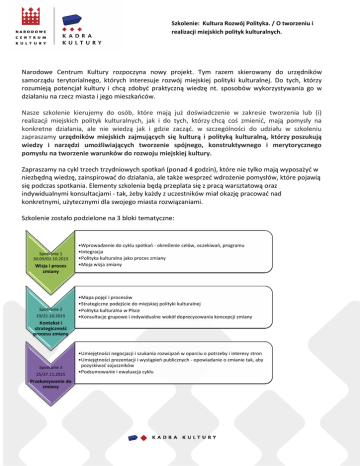 Szkolenie: Kultura Rozwój Polityka. / O tworzeniu tworzen i realizacji miejskich polityk kulturalnych. Narodowe Centrum Kultury rozpoczyna nowy projekt. Tym razem skierowany do urzędników samorządu terytorialnego, których interesuje rozwój miejskiej polityki kulturalnej. Do tych, którzy rozumieją potencjał kultury i chcą zdobyć praktyczną wiedzę nt. sposobów wykorzystywania go w działaniu na rzecz miasta i jego mieszkańców. Nasze szkolenie kierujemy do osób, które mają już doświadczenie w zakresie tworzenia lub (i) realizacji miejskich polityk olityk kulturalnych, jak i do tych, którzy chcą coś zmienić, mają pomysły na konkretne działania, ale nie wiedzą jak i gdzie zacząć. w szczególności do udziału w szkoleniu zapraszamy urzędników miejskich zajmujących się kulturą i polityką kulturalną, którzy którz poszukują wiedzy i narzędzi umożliwiających tworzenie spójnego, konstruktywnego i merytorycznego pomysłu na tworzenie warunków do rozwoju miejskiej kultury. Zapraszamy na cykl trzech trzydniowych spotkań (ponad 4 godzin), które nie tylko mają wyposażyć w niezbędną wiedzę, zainspirować do działania, ale także wesprzeć wdrożenie pomysłów, które pojawią się podczas spotkania. Elementy szkolenia będą przeplata się z pracą warsztatową oraz indywidualnymi konsultacjami - tak, żeby każdy z uczestników miał okazję okazję pracować nad konkretnymi, użytecznymi dla swojego miasta rozwiązaniami. Szkolenie zostało podzielone na 3 bloki tematyczne: Spotkanie 1 30.09/02.10.2015 Wizja i proces zmiany Spotkanie 2 19/21.10.2015 •Wprowadzenie Wprowadzenie do cyklu spotkań - określenie celów, oczekiwań, programu •Integracja •Polityka Polityka kulturalna jako proces zmiany •Moja wizja zmiany •Mapa Mapa pojęć i procesów •Strategiczne Strategiczne podejście do miejskiej polityki kulturalnej •Polityka Polityka kulturalna w Plsce •Konsultacje Konsultacje grupowe i indywidualne wokół doprecyzowania koncepcji zmiany Kontekst i strategiczność procesu zmiany Spotkanie 3 25/27.11.2015 Przekonywanie do zmiany •Umiejętności Umiejętności negocjacji i szukania rozwiązań w oparciu o potrzeby i interesy stron •Umiejętności Umiejętności prezentacji i wystąpień publicznych - opowiadanie o zmianie tak, aby pozyskiwać sojuszników •Podsumowanie Podsumowanie i ewaluacja cyklu Szkolenie: Kultura Rozwój Polityka. / O tworzeniu tworzen i realizacji miejskich polityk kulturalnych. Cele szkolenia 1. Dowiedzenie się na czym polega strategiczne podejście do opracowania i wdrażania miejskiej polityki kulturalnej. 2. Opracowanie spójnej koncepcji wdrażania zmiany w zakresie miejskiej polityki kulturalnej. 3. Sieciowanie i identyfikowanie obszarów współpracy, współpracy, wsparcia i konsultacji. 4. Wzmocnienie umiejętności negocjacji i problemowego podejścia do rozwiązywania konfliktów. 5. Wzmocnienie umiejętności prezentacji i wystąpień publicznych. Kompetencje, które zdobędą uczestnicy w wyniku szkolenia Uczestnicy będą wiedzieli: • w jaki sposób funkcjonuje system odpowiedzialny za tworzenie i realizację polityk kulturalnych w jednostkach samorządu terytorialnego (JST); • w jaki sposób przebiegają procesy mające kluczowe znaczenie dla efektywności polityk kulturalnych w JST w Polsce i na świecie; • w jaki sposób analizować stan polityki kulturalnej w JST; • w jaki sposób skutecznie i efektywnie organizować proces tworzenia strategii rozwoju polityki kulturalnej w jednostkach samorządu terytorialnego; • w jaki sposób formułować zapytania zapytania ofertowe dotyczące badań i opracowań merytorycznych w dziedzinie polityki kulturalnej w samorządzie lokalnym oraz będą umieli odróżnić dobrze zrealizowane badania od tych złych; • w jaki sposób organizować ewaluację działań kulturalnych w JST. Uczestnicy będą potrafili: • w sposób przejrzysty i zwięzły formułować argumenty istotne dla procesów tworzenia i realizacji polityki kulturalnej w JST; • budować międzysektorowe zespoły zdolne do realizacji działań kulturalnych wychodzących poza sektor kultury, a mających cych istotne znaczenie dla funkcjonowania JST; • koordynować proces tworzenia i realizacji polityki kulturalnej w JST; • prowadzić efektywne negocjacje z aktorami, podmiotami i ośrodkami ważnymi dla polityki kulturalnej JST; • identyfikować istotne działania i kwestie mające znaczenie dla powodzenia procesów dotyczących tworzenia i realizacji miejskich polityk kulturalnych JST. Szkolenie: Kultura Rozwój Polityka. / O tworzeniu tworzen i realizacji miejskich polityk kulturalnych. ______________________________ SZCZEGÓŁY Kiedy? 1 Spotkanie - 30.09/02.10.2015 2 Spotkanie - 19/21.10.2015 3 Spotkanie - 25/27.11.2015 Gdzie? Hotel Batory Centrum Konferencyjno - Bankietowe Liczba uczestników: 20 Prowadzący: Trener: Maja Branka Zespół ekspertów: Agata Etmanowicz Artur Celiński ______________________________ REKRUTACJA Kryteria naboru: FORMULARZ REJESTRACYJNY można wypełniać między 24 sierpnia - 6 września 2015r. (włącznie). Urzędnicy samorządu terytorialnego mają pierwszeństwo w procesie rekrutacji uczestników szkolenia. W przypadku pozostałych osób decyduje kolejność zgłoszeń. zgł Wyniki rekrutacji: o wynikach rekrutacji poinformujemy do 7 września 2015 r. Warunkiem uczestnictwa w szkoleniu jest udział we wszystkich 3 spotkaniach. spotkaniach Koszt całego szkolenia:: 1500zł brutto Wpłaty: Wpłaty należy dokonywać po otrzymaniu mailowego potwierdzenia twierdzenia o zakwalifikowaniu się do udziału w szkoleniu. Termin dokonania wpłaty: 11 Września 2015 r Konto nr: 61 1130 1017 0000 0577 0120 0001 Odbiorca: Narodowe Centrum Kultury ul. Płocka 13, 01-231 01 Warszawa Tytułem: Opłata za udział w szkoleniu "Kultura rozwój polityka" Szkolenie: Kultura Rozwój Polityka. / O tworzeniu tworzen i realizacji miejskich polityk kulturalnyc