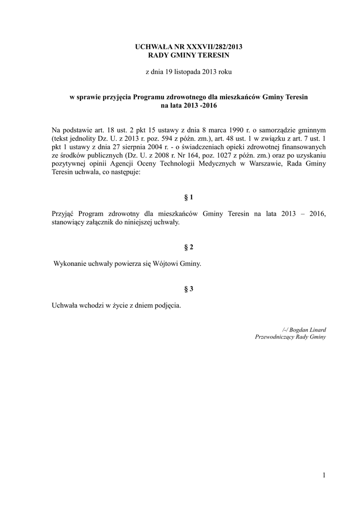 UCHWAŁA NR XXXVII/282/2013 RADY GMINY TERESIN z dnia 19 listopada 2013 roku w sprawie przyjęcia Programu zdrowotnego dla mieszkańców Gminy Teresin na lata 2013 -2016 Na podstawie art. 18 ust. 2 pkt 15 ustawy z dnia 8 marca 1990 r. o samorządzie gminnym (tekst jednolity Dz. U. z 2013 r. poz. 594 z późn. zm.), art. 48 ust. 1 w związku z art. 7 ust. 1 pkt 1 ustawy z dnia 27 sierpnia 2004 r. - o świadczeniach opieki zdrowotnej finansowanych ze środków publicznych (Dz. U. z 2008 r. Nr 164, poz. 1027 z późn. zm.) oraz po uzyskaniu pozytywnej opinii Agencji Oceny Technologii Medycznych w Warszawie, Rada Gminy Teresin uchwala, co następuje: §1 Przyjąć Program zdrowotny dla mieszkańców Gminy Teresin na lata 2013 – 2016, stanowiący załącznik do niniejszej uchwały. §2 Wykonanie uchwały powierza się Wójtowi Gminy. §3 Uchwała wchodzi w życie z dniem podjęcia. /-/ Bogdan Linard Przewodniczący Rady Gminy 1 Załącznik do uchwały Nr XXXVII/282/2013 Rady Gminy Teresin z dnia 19 listopada 2013 r. Program zdrowotny dla mieszkańców Gminy Teresin na lata 2013 – 2016 „Program Profilaktyki Zakażeń Wirusem Brodawczaka Ludzkiego (HPV)” WSTĘP Zaspokajanie zbiorowych potrzeb mieszkańców w zakresie ochrony zdrowia jest jednym z podstawowych zadań gminy wynikających z art.7 ust. 1 pkt 5 ustawy z dnia 8 marca 1990 r. o samorządzie gminnym (tekst jednolity: Dz. U. z 2013 r. poz. 594). Do zadań własnych gminy w zakresie zapewnienia równego dostępu do świadczeń opieki zdrowotnej należy w szczególności opracowanie, realizacja oraz ocena efektów programów zdrowotnych wynikających z rozpoznanych potrzeb zdrowotnych i stanu zdrowia mieszkańców - art. 7 ust. 1 pkt 1 i art. 48 ust. 1 ustawy z dnia 27 sierpnia 2004 r. o świadczeniach opieki zdrowotnej finansowanych ze środków publicznych (tekst jednolity: Dz. U. z 2008 r. Nr 164, poz. 1027 z późn. zm.). Zapobieganie chorobom cywilizacyjnym możliwe jest poprzez stosowanie odpowiedniej profilaktyki, a także poprzez podejmowanie wszelkich działań i środków zmierzających do zapobiegania chorobom lub do ich wykrycia we wczesnych stadiach, dających szansę na szybkie wyleczenie. Gmina Teresin w ramach zadań programowych ma na celu podnoszenie i poprawę jakości życia swoich mieszkańców oraz zapewnienie szerszego dostępu do ponadstandardowych świadczeń zdrowotnych. Niniejszy program zdrowotny kierowany jest do dzieci i młodzieży w wieku od 13 do 15 lat i dotyczy działań w zakresie profilaktyki zakażeń wirusem brodawczaka ludzkiego (HPV). Konsekwencją zakażenia onkogennymi typami wirusa HPV (brodawczaka ludzkiego) jest rak szyjki macicy. Rak szyjki macicy jest drugim po raku sutka najczęściej występującym na świecie nowotworem u kobiet i stanowi pierwszą przyczynę zgonów. W ciągu roku dochodzi do około 500 tys. nowych zachorowań, a ponad połowa chorych kobiet umiera. W Polsce każdego dnia umiera 5 chorych na raka szyjki macicy. Program jest wieloletni i będzie realizowany w latach 2013 - 2016. Przewiduje działania prozdrowotne finansowane ze środków gminy i uzupełniający świadczenia i akcje profilaktyczne finansowane ze środków Narodowego Funduszu Zdrowia. Program opracowany został w oparciu o „Schemat programu zdrowotnego” zalecanego do stosowania przez Agencję Oceny Technologii Medycznych w Warszawie. 2 OPIS PROGRAMU 1. Opis problemu zdrowotnego 1a) Problem zdrowotny Zakażenie wirusem brodawczaka ludzkiego (HPV – Human Papilloma Virus) stanowi duży problem kliniczny i epidemiologiczny na całym świecie. Istnieje ponad 100 typów wirusa HPV. Ze względu na ryzyko wywołania zmian nowotworowych podzielono je na: a) typy wysokoonkogenne, które prowadzą do powstania zmian przedrakowych i raka szyjki macicy (np. typy 16, 18, 31, 45) b) typy niskoonkogenne, które odpowiadają za pojawianie się brodawek zewnętrznych (kłykciny kończyste) narządów płciowych lub okolicy odbytu (np. typy 6, 11)e, Światowa Organizacja Zdrowia już w 1996 roku uznała zakażenia wirusem HPV typu 16 i 18 za czynniki rakotwórcze dla człowieka. Wirus HPV typ 16 i 18 odpowiada za ponad 70% wszystkich przypadków zachorowań na raka szyjki macicy. W populacji europejskiej szczególne znaczenie ma 8 typów (16, 18, 31, 33, 35, 45, 56 i 58), odpowiadających za około 85% przypadków raka szyjki macicy. Na świecie ok. 630 mln ludzi jest zakażona wirusem HPV. Większość zakażeń HPV przebiega bezobjawowo. Szacuje się, że każdego roku ok. 500 000 kobiet na całym świecie zapada na raka szyjki macicy, a 300 000 z nich umiera z tego powodu. W Polsce rocznie na ten typ nowotworu zapada ponad 3 600 kobiet, a umiera 1 800. Jest to jeden z najwyższych wskaźników umieralności w Europie. Codziennie pięć Polek umiera z powodu raka szyjki macicy. W większości są to kobiety w średnim wieku, pomiędzy 45 a 55 rokiem życia. Liczbę wszystkich zakażonych można oszacować na ponad milion osób. 1b) Epidemiologia Do zakażenia HPV najczęściej dochodzi przez kontakt seksualny genitalno-genitalny, oralnogenitalny lub przez zakażone ręce w trakcie styczności z narządami płciowymi. Możliwe jest też przeniesienie zakażenia HPV na noworodka w czasie porodu lub na dziecko w czasie bliskich kontaktów nieseksualnych np. w trakcie wspólnej kąpieli w wannie z zakażonym dorosłym. Każdy, zarówno mężczyzna, jak i kobieta, kto kiedykolwiek miał kontakt seksualny mógł ulec zakażeniu HPV. Zakażenie HPV może być jawne klinicznie lub przybierać formę subkliniczną albo utajoną. Objawy kliniczne zakażenia typami niskoonkogennymi obejmują kłykciny płaskie lub kończyste narządów płciowych o różnym nasileniu. W fazie utajonej nie występują objawy. Na każdym z wymienionych etapów zakażenie może ulegać progresji, samoistnej regresji lub stać się procesem przewlekłym. Najczęściej zakażenie HPV ulega samowyleczeniu. U kobiet do 25 roku życia większoś