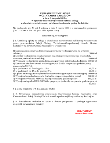 ZARZĄDZENIE NR 130/2012 WÓJTA GMINY RADZIEJÓW z dnia 8 sierpnia 2012 r. w sprawie ustalenia wysokości opłat za usługi o charakterze użyteczności publicznej na terenie gminy Radziejów Na podstawie art. 30 ust. 1 ustawy z dnia 8 marca 1990 r. o samorządzie gminnym (Dz. U. z 2001 r. Nr 142, poz. 1591 z późn. zm.), zarządza się, co następuje: § 1. Ustala się opłaty za usługi o charakterze użyteczności publicznej wykonywane przez pracowników Sekcji Obsługi Techniczno-Gospodarczej Urzędu Gminy Radziejów na terenie Gminy Radziejów w wysokości: 1) Demontaż i montaż wodomierza na przyłączu wodociągowym na wniosek odbiorcy 50,00 zł 2) Montaż wodomierza z wykonaniem podejścia przyłączeniowego z kształtek, zaworów, śrubunków i redukcji, 200,00 zł 3) Wymiana wodomierza uszkodzonego z przyczyn zależnych od odbiorcy 150,00 zł 4) Usuwanie skutków awarii wodociągowych (każda rozpoczęta godzina pracy pracownika SOTG): a) w godzinach od 7 00 do godz. 15 00 40,00 zł b) w godzinach od 15 00 do godziny 7 00 60,00 zł 5) Opłata za nielegalne włączenie do sieci wodociągowej lub kanalizacyjnej 500,00 zł 6) Wynajem koparko-ładowarki (za każdą rozpoczętą godzinę pracy) 120,00 zł 7) Wynajem równiarki MBU (za każdą rozpoczętą godzinę pracy) 140,00 zł 8) Wynajem ciągnika URSUS C-360 z przyczepą (za każdą rozpoczętą godzinę pracy) 50,00 zł § 2. Ceny określone w § 1 są cenami brutto. § 3. Wykonanie zarządzenia powierzam Skarbnikowi Gminy Radziejów oraz Kierownikowi Sekcji Obsługi Techniczno-Gospodarczej Urzędu Gminy Radziejów. § 4. Zarządzenie wchodzi w życie z dniem podpisania i podlega ogłoszeniu w sposób zwyczajowo przyjęty. WÓJT GMINY Marek Szuszman