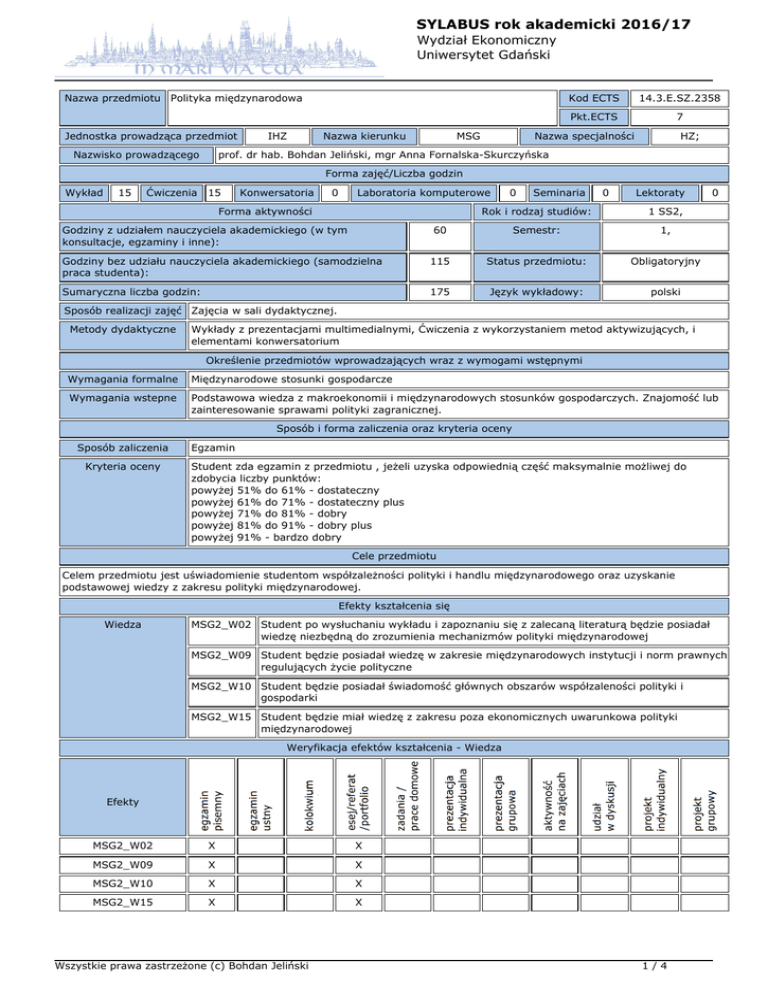 SYLABUS rok akademicki 2016/17 Wydział Ekonomiczny Uniwersytet Gdański Nazwa przedmiotu Polityka międzynarodowa Jednostka prowadząca przedmiot Nazwisko prowadzącego IHZ Nazwa kierunku MSG Kod ECTS 14.3.E.SZ.2358 Pkt.ECTS 7 Nazwa specjalności HZ; prof. dr hab. Bohdan Jeliński, mgr Anna Fornalska-Skurczyńska Forma zajęć/Liczba godzin Wykład 15 Ćwiczenia 15 Konwersatoria 0 Laboratoria komputerowe Forma aktywności 0 Seminaria 0 Lektoraty Rok i rodzaj studiów: 1 SS2, 60 Semestr: 1, Godziny bez udziału nauczyciela akademickiego (samodzielna praca studenta): 115 Status przedmiotu: Obligatoryjny Sumaryczna liczba godzin: 175 Język wykładowy: polski Godziny z udziałem nauczyciela akademickiego (w tym konsultacje, egzaminy i inne): 0 Sposób realizacji zajęć Zajęcia w sali dydaktycznej. Metody dydaktyczne Wykłady z prezentacjami multimedialnymi, Ćwiczenia z wykorzystaniem metod aktywizujących, i elementami konwersatorium Określenie przedmiotów wprowadzających wraz z wymogami wstępnymi Wymagania formalne Międzynarodowe stosunki gospodarcze Wymagania wstepne Podstawowa wiedza z makroekonomii i międzynarodowych stosunków gospodarczych. Znajomość lub zainteresowanie sprawami polityki zagranicznej. Sposób i forma zaliczenia oraz kryteria oceny Sposób zaliczenia Kryteria oceny Egzamin Student zda egzamin z przedmiotu , jeżeli uzyska odpowiednią część maksymalnie możliwej do zdobycia liczby punktów: powyżej 51% do 61% - dostateczny powyżej 61% do 71% - dostateczny plus powyżej 71% do 81% - dobry powyżej 81% do 91% - dobry plus powyżej 91% - bardzo dobry Cele przedmiotu Celem przedmiotu jest uświadomienie studentom współzależności polityki i handlu międzynarodowego oraz uzyskanie podstawowej wiedzy z zakresu polityki międzynarodowej. Efekty kształcenia się Wiedza MSG2_W02 Student po wysłuchaniu wykładu i zapoznaniu się z zalecaną literaturą będzie posiadał wiedzę niezbędną do zrozumienia mechanizmów polityki międzynarodowej MSG2_W09 Student będzie posiadał wiedzę w zakresie międzynarodowych instytucji i norm prawnych regulujących życie polityczne MSG2_W10 Student będzie posiadał świadomość głównych obszarów współzaleności polityki i gospodarki MSG2_W15 Student będzie miał wiedzę z zakresu poza ekonomicznych uwarunkowa polityki międzynarodowej Weryfikacja efektów kształcenia - Wiedza Efekty MSG2_W02 X X MSG2_W09 X X MSG2_W10 X X MSG2_W15 X X Wszystkie prawa zastrzeżone (c) Bohdan Jeliński 1/4 SYLABUS rok akademicki 2016/17 Wydział Ekonomiczny Uniwersytet Gdański Umiejętności MSG2_U02 Student umie dostrzec i wykorzystać w praktyce gospodarczej związki wzajemne między wydarzeniami politycznymi na świecie, a zmianami warunków prowadzenia działalności gospodarczej, szczególnie w relacjach z partnerami zagranicznymi. MSG2_U03 Student unie analizować przyczyny i uprzedzająco oceniać skutki gospodarcze wydarzeń politycznych MSG2_U04 Student umie organizować system napływu i selekcji informacji politycznych MSG2_U07 Student potrafi odnieśc bieżące wydarzenia polityczne do podstaw teoretycznych i analigii historycznych Weryfikacja efektów kształcenia - Umiejętności Efekty MSG2_U02 X X MSG2_U03 X X MSG2_U04 X X MSG2_U07 X X Kompetencje MSG2_K01 Student ma świadomość złożoności polityki i oraniczeń własnej wiedzy w tym zakresiey handlowej z zagranicą i szerokiego zakresu jej uwarunkowań politycznych, ekonomicznych, kulturowych i etycznych oraz umiejętność właściwego komunikowania się z otoczeniem międzynarodowym. MSG2_K02 Student ma świadomośc iż polityka to działalnośc zespołowa i będzie umiał znal zasady pracy w zespole MSG2_K03 Student umie we właściwy sposób komunikować się z otoczeniem politycznym MSG2_K07 Student będzie przekonany o społecznych i gospodarczych konsekwencjach działań politycznych Weryfikacja efektów kształcenia - Kompetencje Efekty MSG2_K01 X X MSG2_K02 X X MSG2_K03 X X MSG2_K07 X X Treści programowe I. 1. 2. 3. 4. 5. 6. Istota i znaczenie międzynarodowych stosunków politycznych Pojęcie stosunków międzynarodowych Cechy środowiska międzynarodowego Oddziaływania międzynarodowe i ich zakres Uwarunkowania i czynniki kształtujące środowisko polityczne Formy stosunków międzynarodowych Współzależności międzynarodowe i ich instytucjonalne formy II. Polityka zagraniczna państwa i jej uwarunkowania 1. Pojęcie i istota polityki zagranicznej 2. Racja stanu i interes narodowy 3. Cele polityki zagranicznej 4. Uwarunkowania polityki zagranicznej 5. Funkcje polityki zagranicznej 6. Srodki i metody realizacji polityki zagranicznej Wszystkie prawa zastrzeżone (c) Bohdan Jeliński 2/4 SYLABUS rok akademicki 2016/17 Wydział Ekonomiczny Uniwersytet Gdański 7. Strategia a taktyka polityki zagranicznej III. Rola i miejsce polityki w życiu społeczno-gospodarczym 1. Pojęcie i istota polityki 2. Podmioty i przedmioty polityki 3. Władza polityczna 4. Metody działań politycznych 5. Upolitycznianie życia społeczno-gospodarczego 6. Zasady skutecznego działania w polityce IV. Determinanty polityki i teorie podejmowania decyzji politycznych 1. Ideologia a polityka 2. Prawo a polityka 3. Gospodarka a polityka 4. Kultura a polityka 5. Etyka a polityka 6. Spory i konflikty międzynarodowe 7. Zasady i teorie podejmowania decyzji politycznych V. 1. 2. 3. 4. 5. 6. Bezpieczeństwo międzynarodowe Ewolucja pojęcia bezpieczeństwa Wyznaczniki bezpieczeństwa Źródła zagrożeń bezpieczeństwa Ocena zagrożeń Kontrola zbrojeń i rozbrojenia Nowe zagrożenia i wyzwania VI. Teorie polityki światowej 1. Realizm 2. Liberalizm 3. Neorealizm i neoliberalizm 4. Teorie marksistowskie 5. Konstruktywizm społeczny 6. Podejścia alternatywne 7. Polityka globalna VII. Systemy polityczne 1. Pojęcie systemu politycznego 2. Funkcje i typy systemów politycznych 3. Polityka i proces polityczny 4. Zachowanie i działania polityczne 5. Decyzje polityczne i proces 